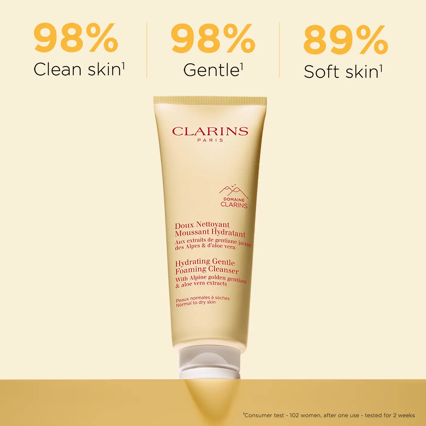 Powered by Clarins’ exclusive Gentle Complex, of sustainably-farmed Organic Gentian* + Organic Lemon Balm* extracts grown on our own farm, Le Domaine Clarins, plus Aloe* extract to boost skin’s hydration significantly. The ultra-sensorial, delicate, moisture-rich foam leaves dry skin feeling soft, supple, and incredibly comfortable. Clinically proven to preserve skin's barrier function and hydrolipidic film.** It respects skin’s natural moisture balance for an exceptional gentle cleansing experience that promotes a clean, clear, radiant complexion.