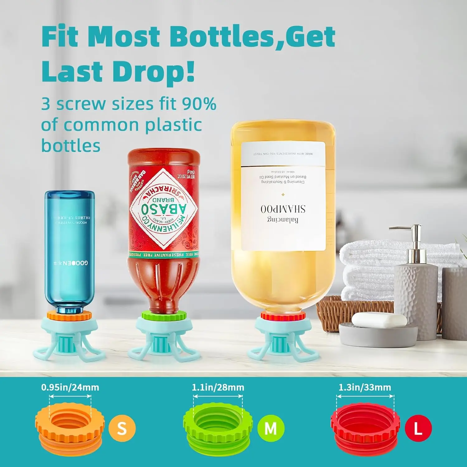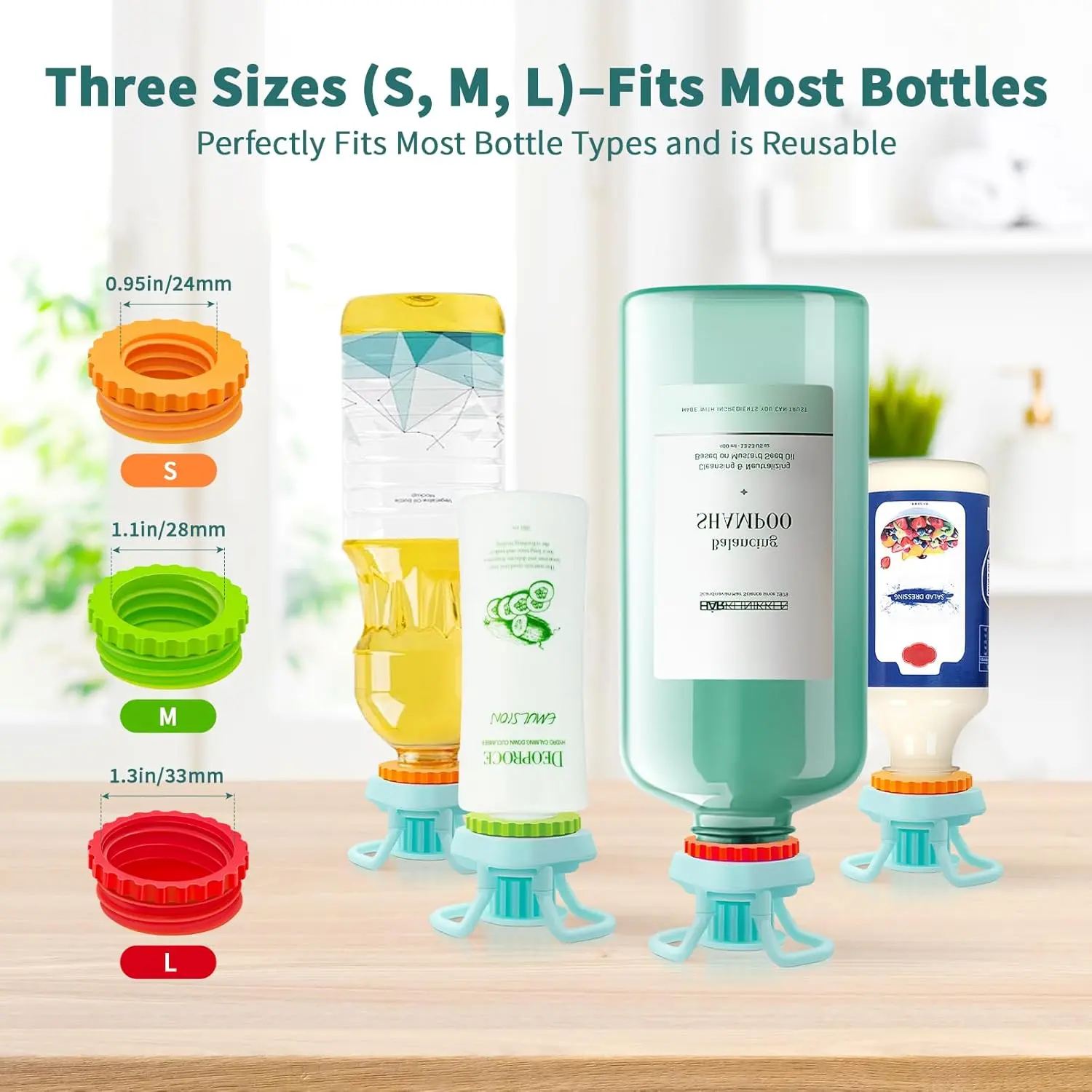 Bottle Emptying Caps fit most standard screw-top plastic bottles worldwide. Versatile for various products and brands. Enjoy a money-saving drink dispenser that's leak-proof and reusable.