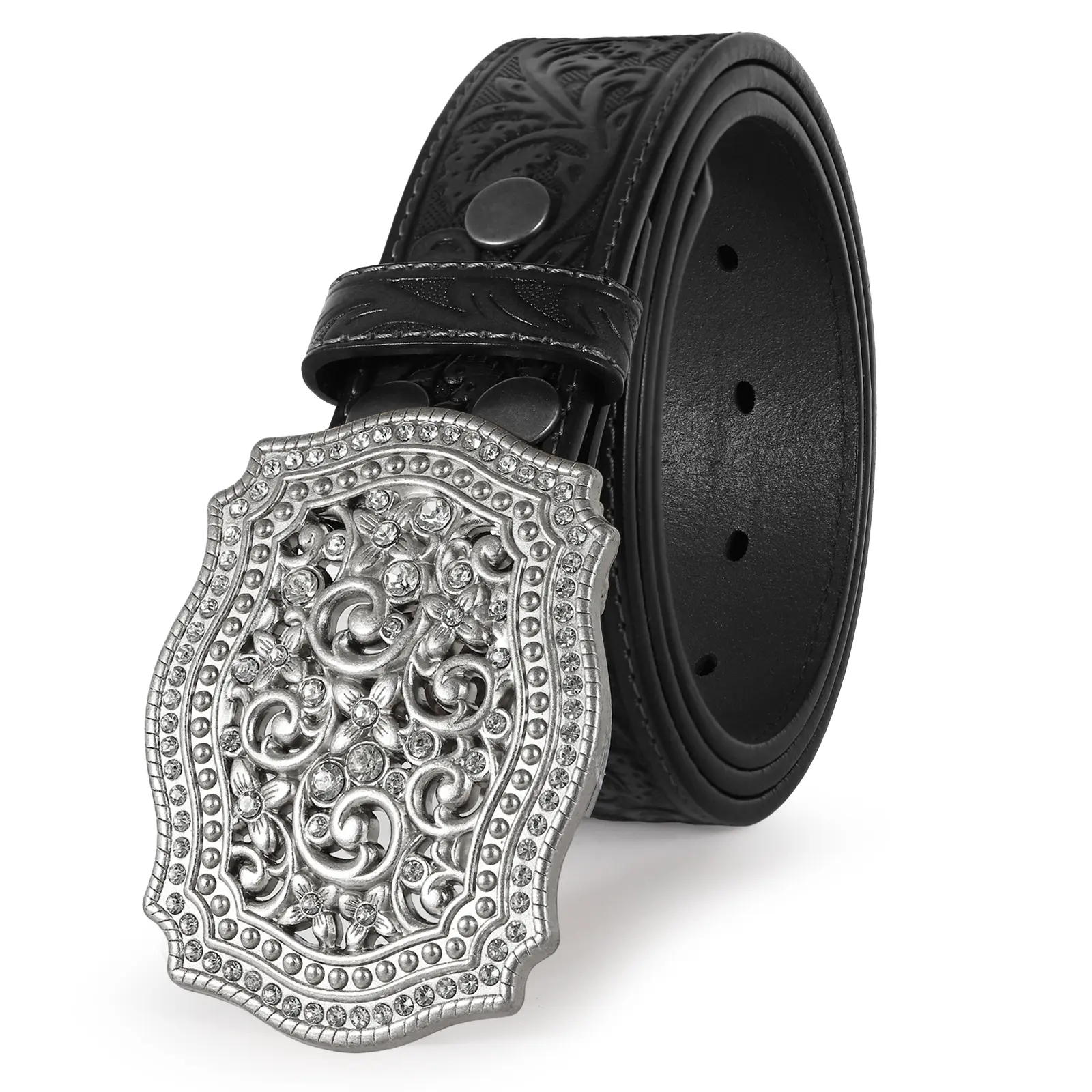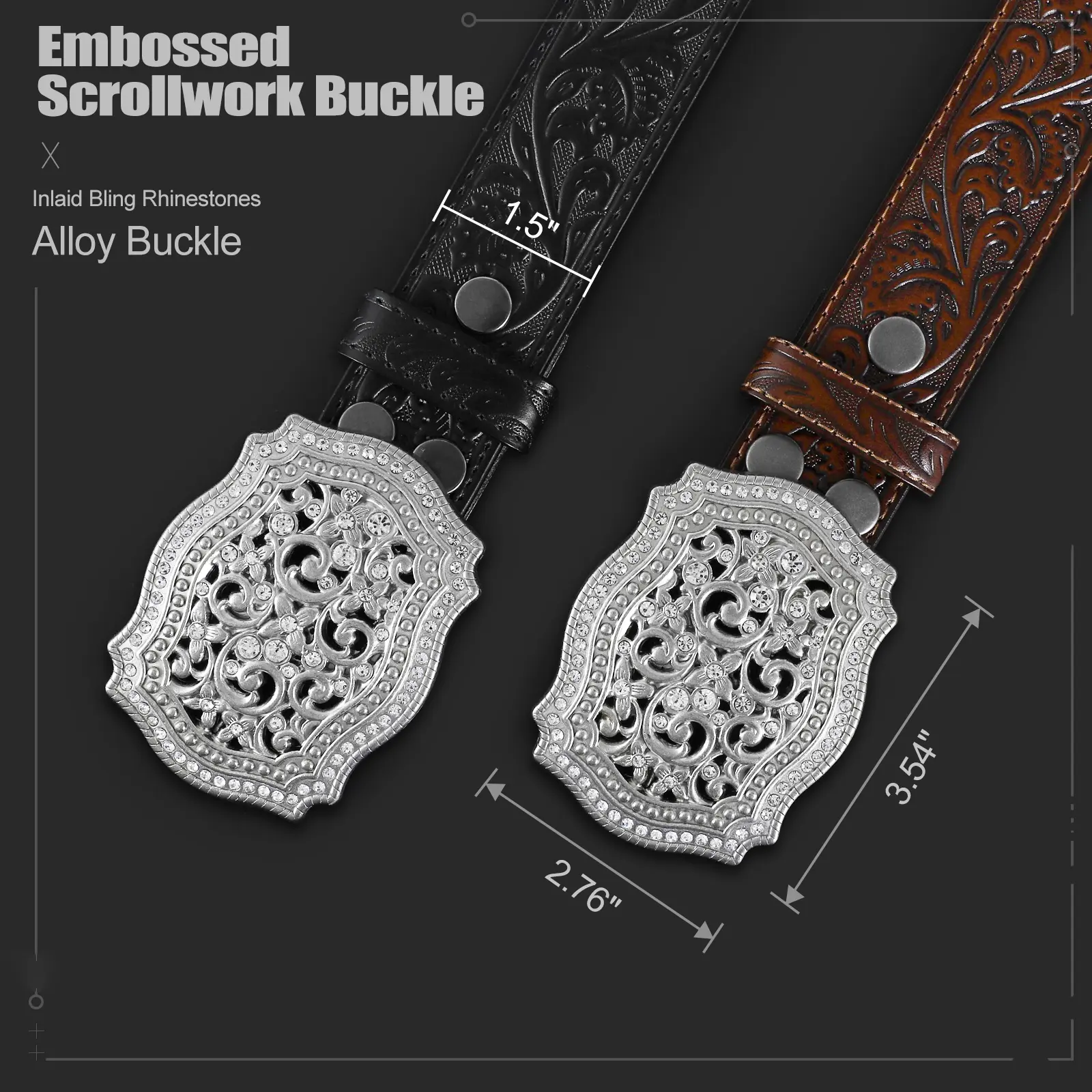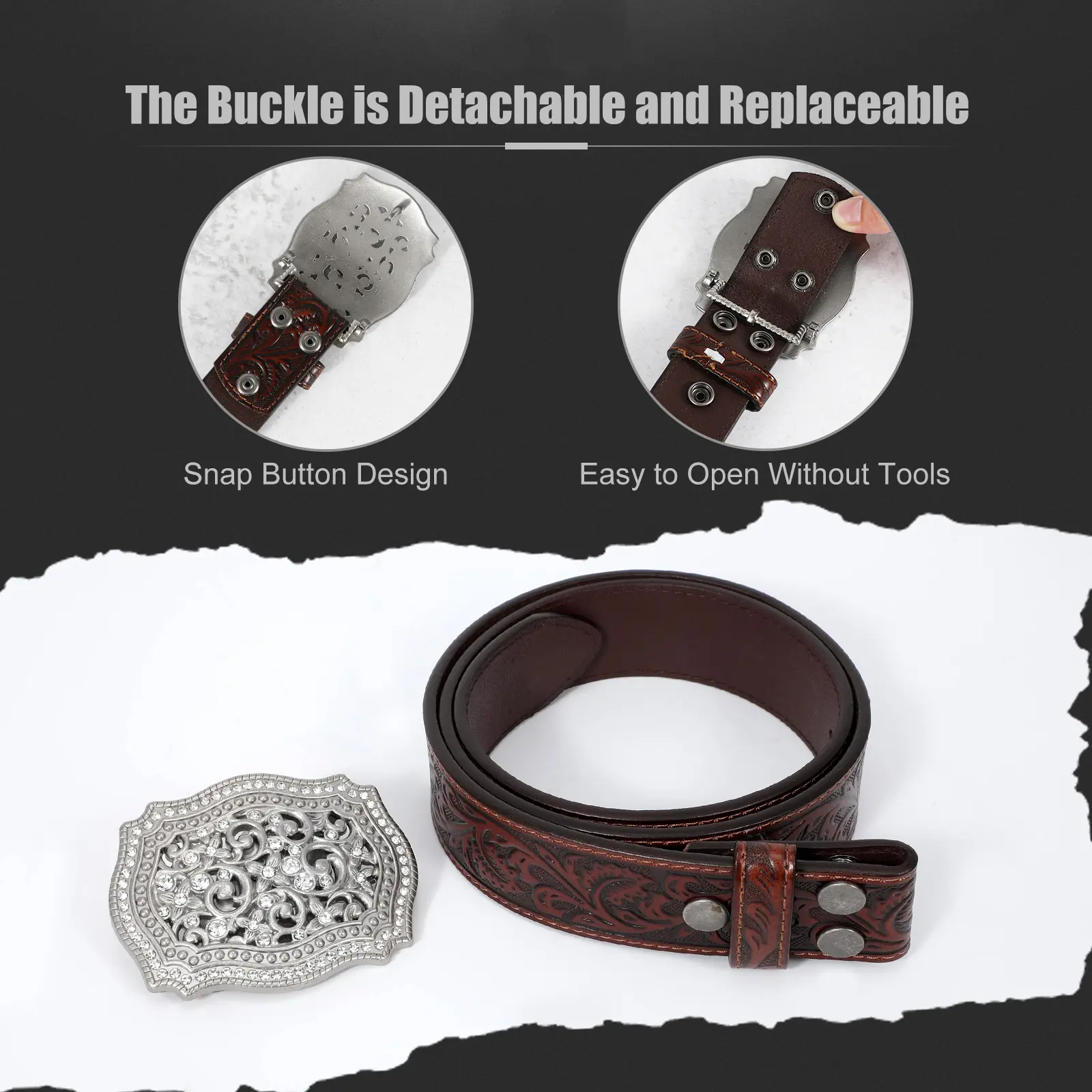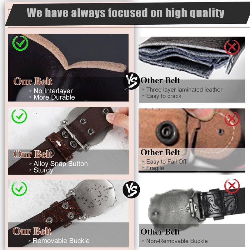 ·Boasting snap closures, this cowgirl/cowboy belt offers unparalleled versatility. Effortlessly swap out buckles anytime to match your mood or outfit, transforming your look in seconds. The embossed and engraved tooled design on the belt strap is meticulously crafted, exuding a rustic charm that's both eye-catching and timeless.