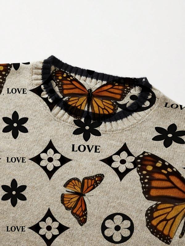 Geometric Butterfly Print Round Neck Sweater, Casual Short Sleeve Knitwear for Spring Summer Fall, Comfortable Warm Women's Clothing #graphicsweatshirt #valentinesdaysweater #womenssweats #widenecksweater #bestsweater #springcardigan #womenscrewneck #designersweaters #embroideredsweater #softcardigan