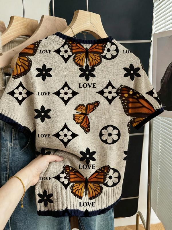 Geometric Butterfly Print Round Neck Sweater, Casual Short Sleeve Knitwear for Spring Summer Fall, Comfortable Warm Women's Clothing #sweater #graphicsweatshirt #catsweater #womenssweater #womenslongsleeveshirt #womenstees #affordablesweaters #loungewearfinds #shortsleevesweater #fashiontops