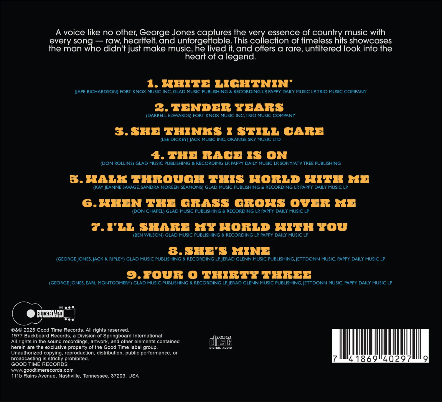 Track ListingsAlbum Tracks</u>_<br/>1._ White Lightnin'2._ Tender Years3._ She Thinks I Still Care4._ The Race Is on5._ Walk Through This World with Me6._ When the Grass Grows Over Me7._ I'll Share My World with You8._ She's Mine9._ Four O Thirty Three