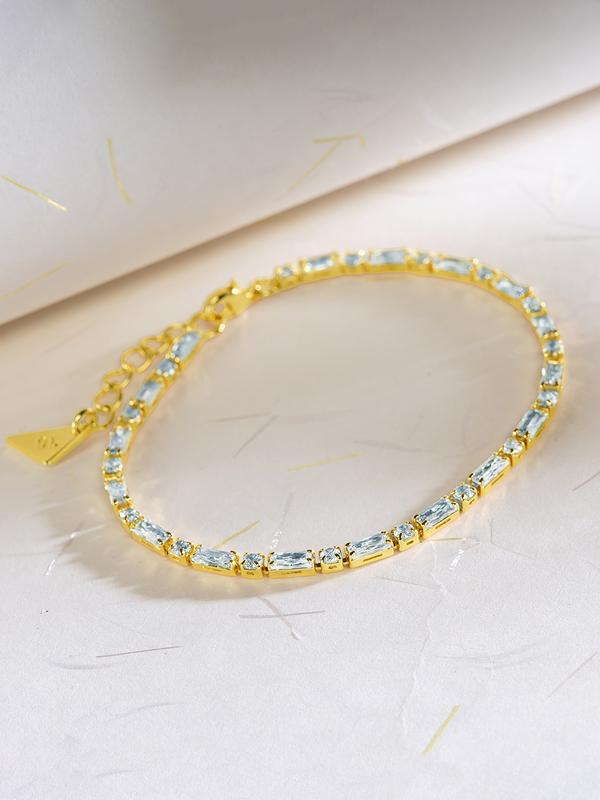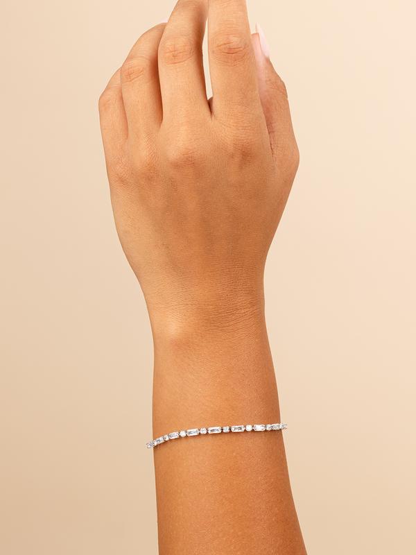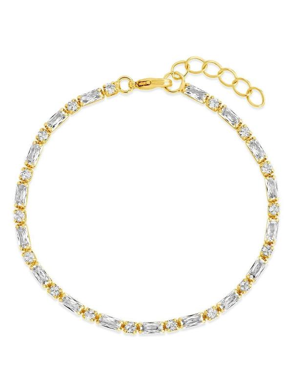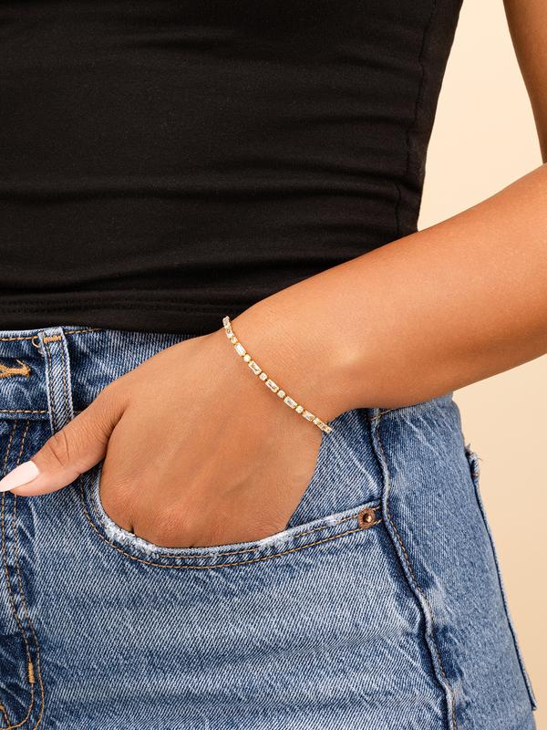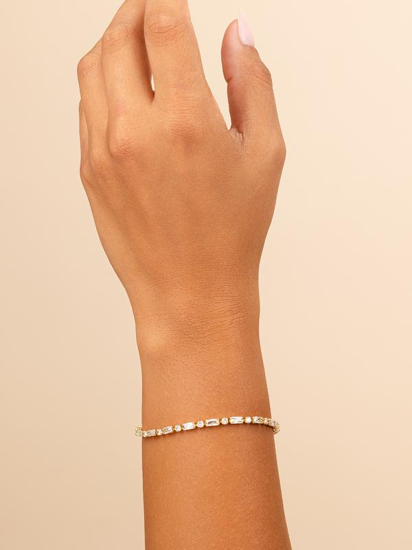 Designed to dazzle, this gold tennis bracelet mixes baguette and round-cut stones for a structured twist on a classic silhouette. It's minimal in shape but big on shine, giving you that refined flash with every flick of the wrist. Layer it up or wear it clean for a polished finish.