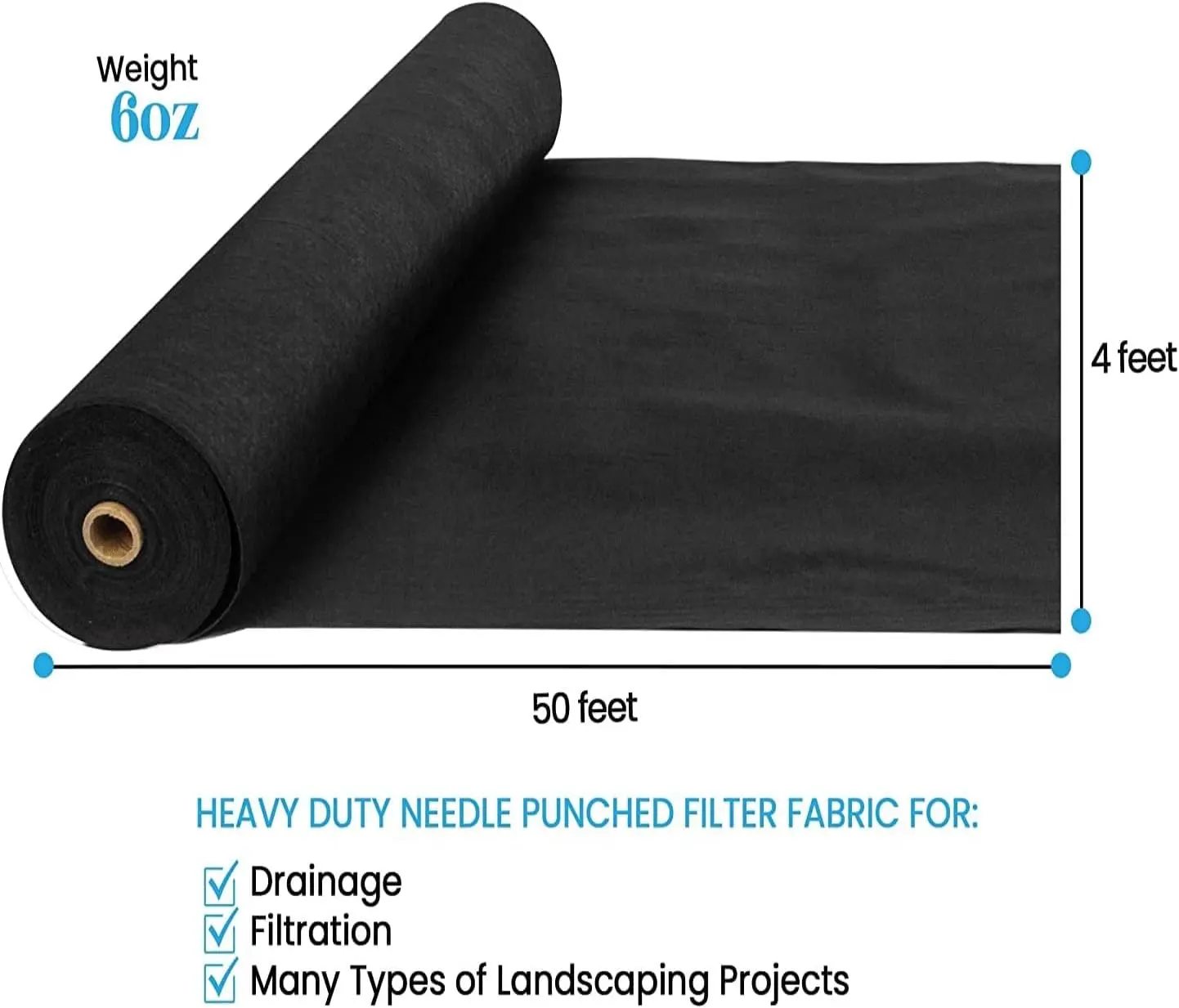 Heavy Duty and High Strength Material: Features 6oz tough and durable density, PP non-woven, 350N tensile strength. Our Woven Geotextile Fabric features erosion-proof, damp-proof, tear-proof, and durable material compared with other woven ground covers. Exclusive Permeability & Soil-Friendly: This is not normal landscape fabric!!!! This is for major construction erosion control. You use this under concrete or pavement! It does allow drainage. You can use this on retainer walls and walk paths, but it is not its intended purpose. The purpose of this material is for heavy loads and high traffic. It is not a weed-stop. Widely Usage: Them can help you deal with many projects where you need to make Drainage, Separation, Filtration. Perfect for French Drain, Erosion Control, Driveway Underlayment, RipRap Channels, Retaining walls and other construction projects. Easy to Install and Setup: Our 4ft x 50ft Geotextile fabric is super easy to carry, install or cut into single piece or exact dimensions, just roll down and put it in the preferred area. Made to last: The material will serve you for at least 30 years with proper use. The main rule is to avoid direct sunlight. If use it as a ground cover or weed barrier please buried it with 1/4 foot of mulch or gravel.