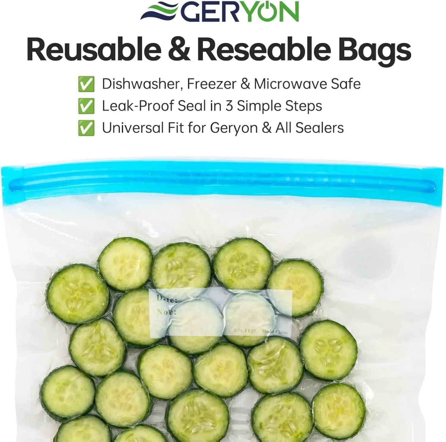 Save significantly on groceries and store safely with GERYON vacuum sealer. Plus, these reusable bags can be used multiple times. Vacuum bags are ideal for sous vide cooking, thanks to their heat resistance and easy-zip closure that ensures a tight seal. 🍽️