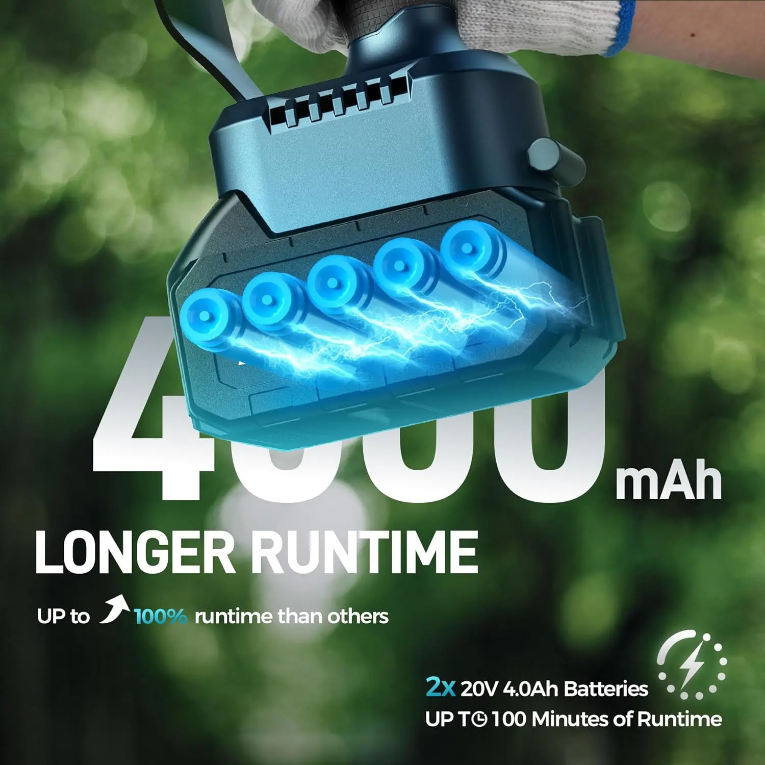 ·Upgrade to 2 Batteries & Fast Charging: The pole saw battery powered comes with two 20V-4.0Ah batteries and a fast charger, running up to 100 minutes. You don’t have to worry about running out of power all day outdoors! With self-overload and temperature protection, it provides a much longer battery life. (Note: The battery is not compatible with DEWALT.)