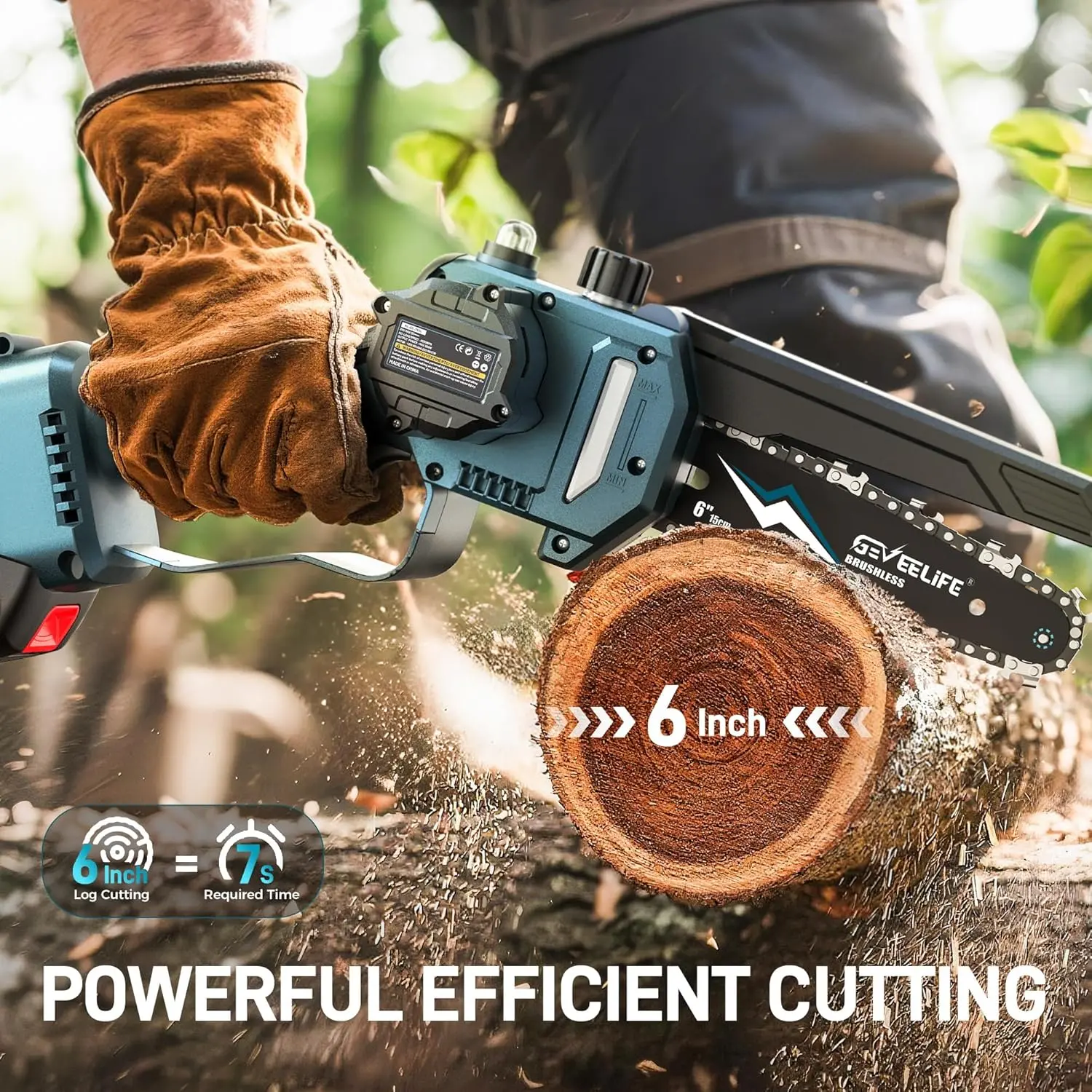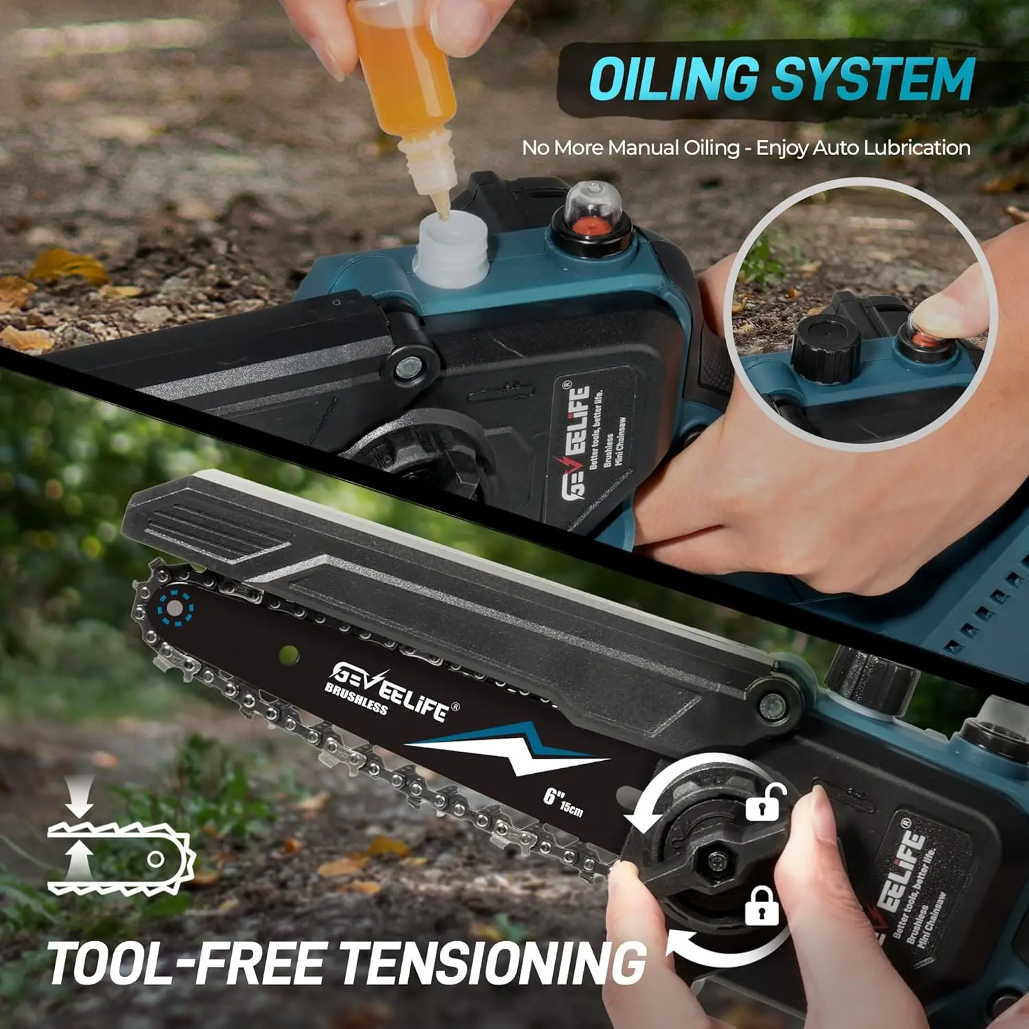 ·Automatic Oiling System: The mini chainsaw is equipped with a lubrication system. Simply inject oil and gently press the transparent oil cap before use—this ensures the chain is automatically lubricated during operation, reducing wear and extending its service life. If the chain loosens, just rotate the tensioning knob to adjust tension. No complicated tools are needed, making it convenient and efficient. (Note: Chainsaw Oil needs to be purchased separately.)