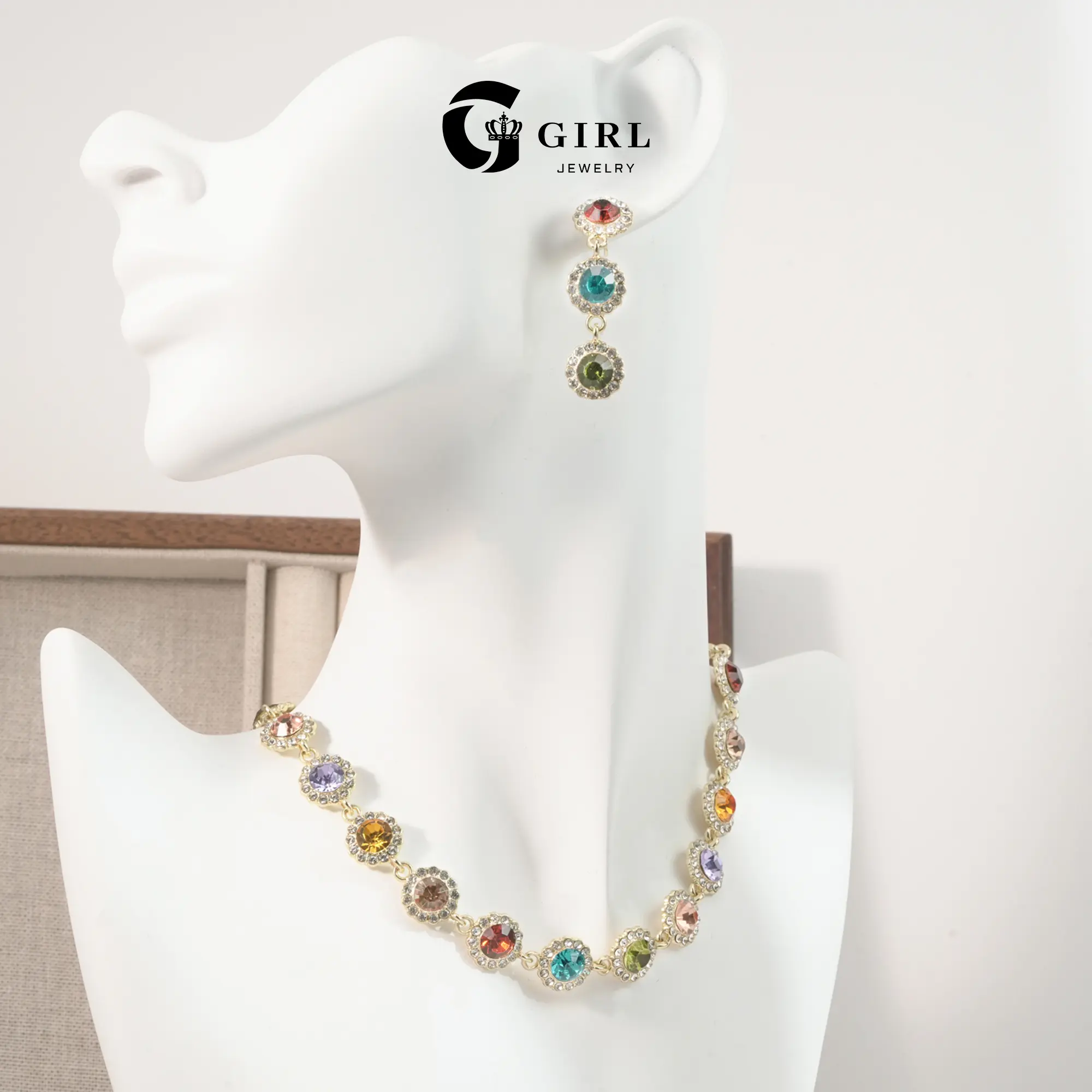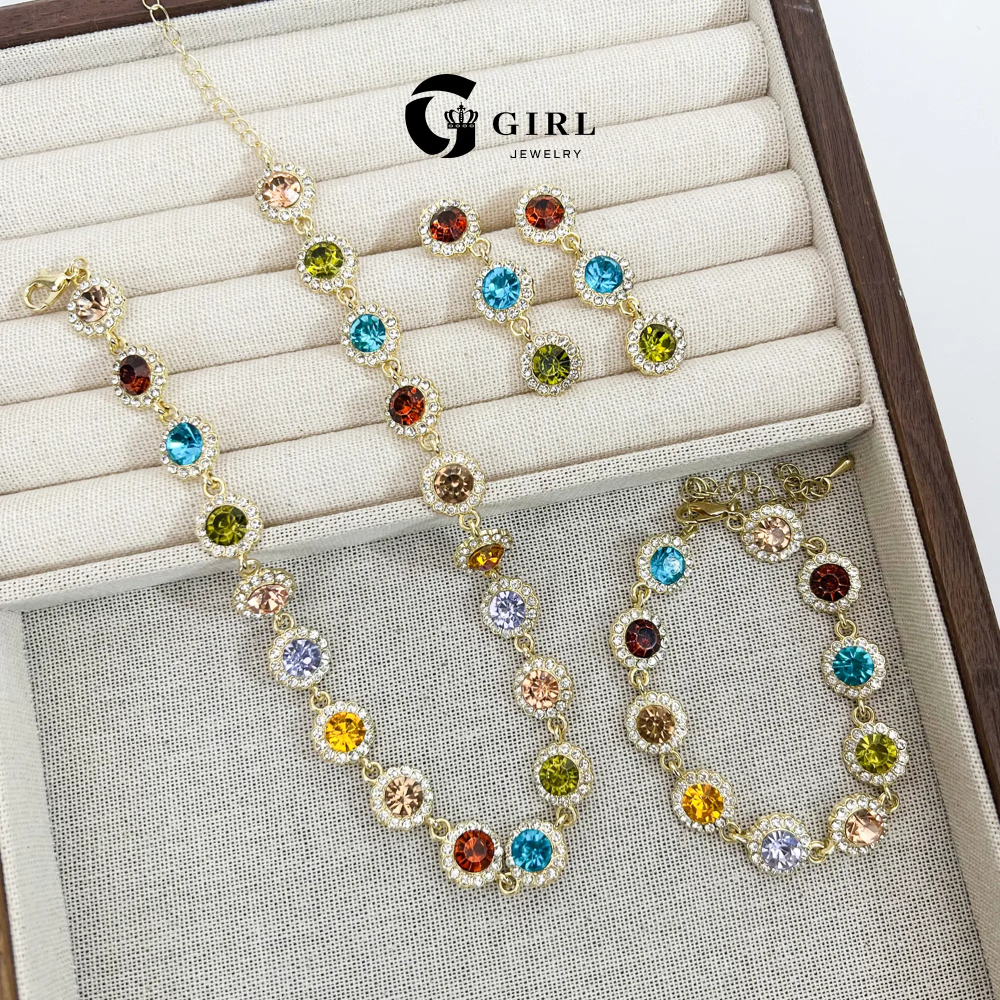 The GGIRL set is versatile, suitable for various occasions. The bracelet, earrings, and choker necklace can be worn together or separately. The multi-color design and rhinestone details ensure it stands out.