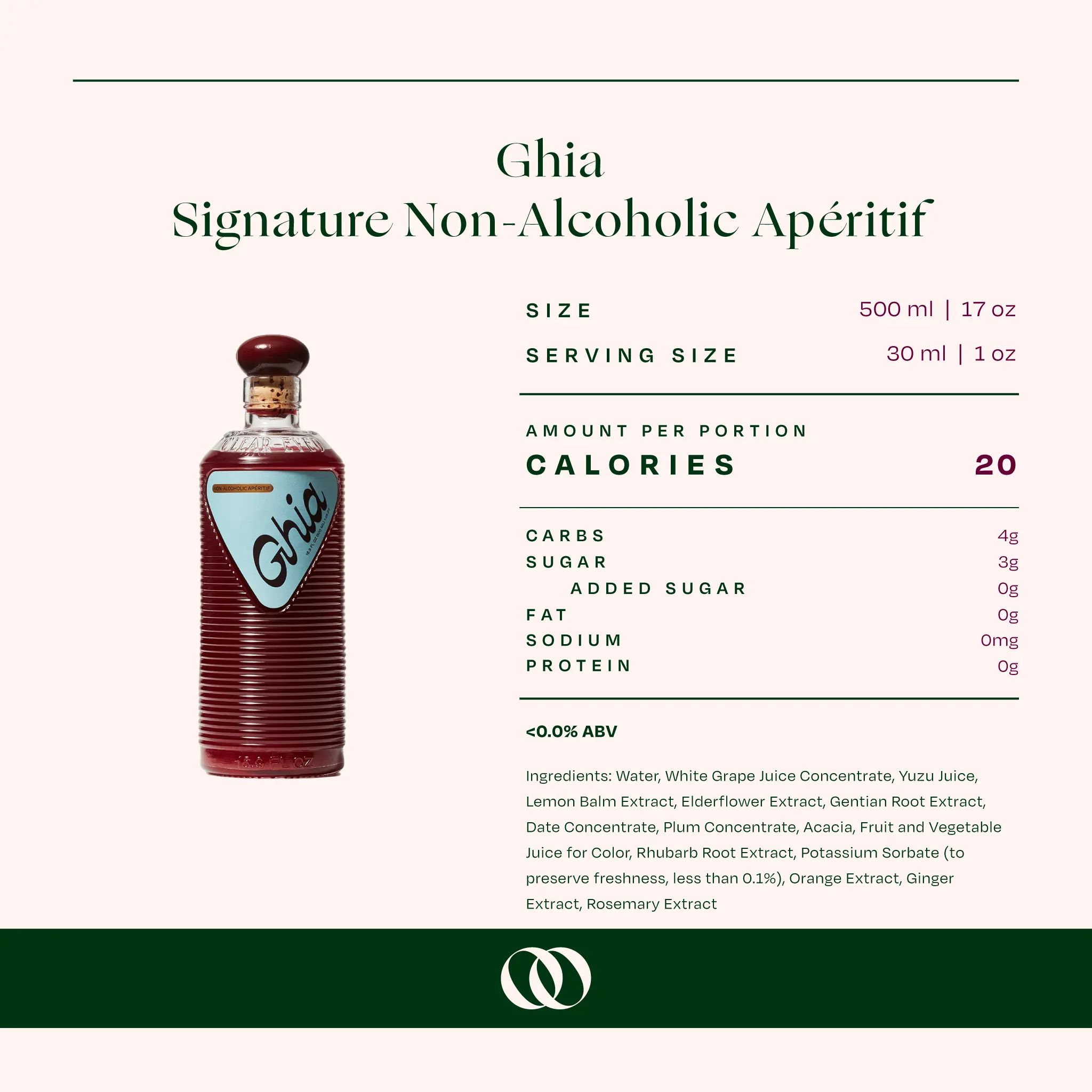 Born on the coasts of France and Italy, the classic non-alcoholic Apéritif is a bold combination of botanicals that kickstart the appetite and the conversation. Light and dry, an apéritif is perfect for slow-sipping and fast-talking, a drink that takes friends from sunset to sunrise. Vibrant, fresh, and satisfyingly bitter, it tastes like summer on the rocks. Potent plants. Heady herbals. Blithe botanicals. Nothing to buzz you or to make you snooze. Ghia’s versatile apéritif brings depth to any Spritz, just add bubbles. Each glass promises to kick up the energy and calm down the mind. Offers a biting combination of botanical extracts powerful enough to bring out the best version of you without numbing the night (or the next morning).