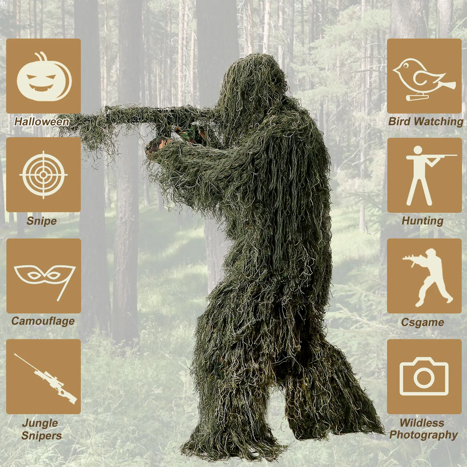 【Camouflage Design】Ghillie suit is designed as a protective clothing, as it allows people to blend into outer environment.