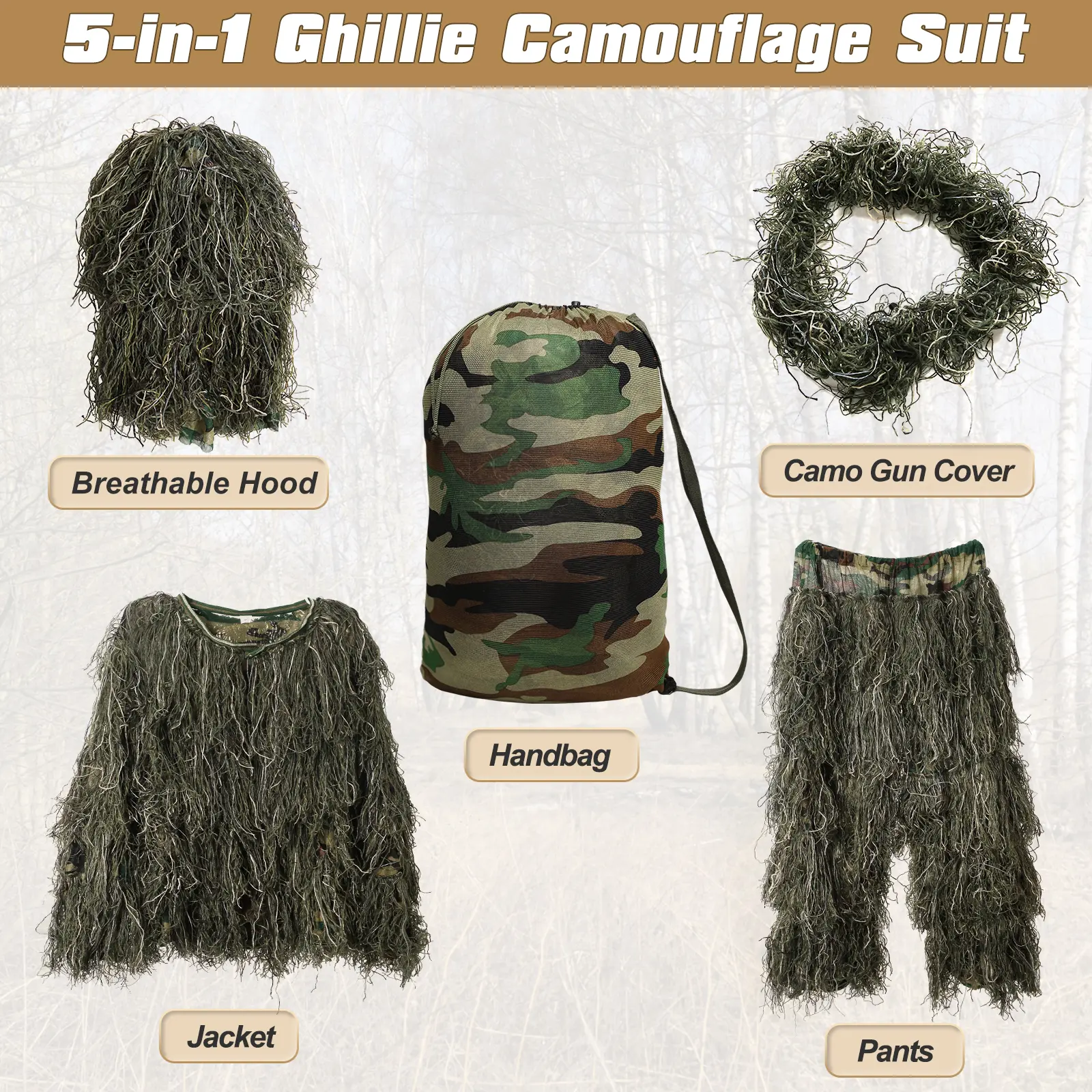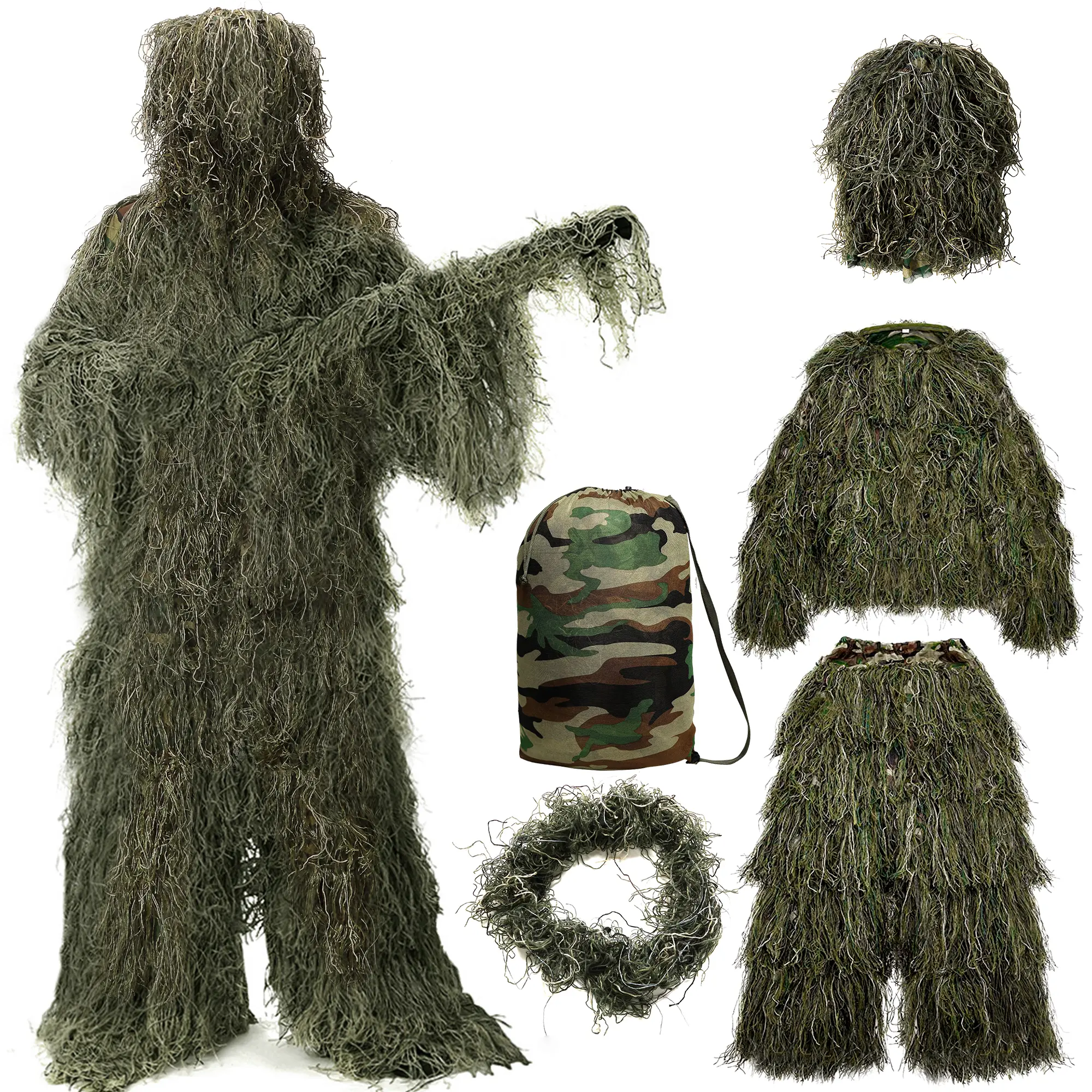 【Package Includes】 Pack of 5 in 1 Ghillie Suit includes hood, jacket, pants, wrap, and a stuff sack. Portable to get it into stuff sack enables to carry.