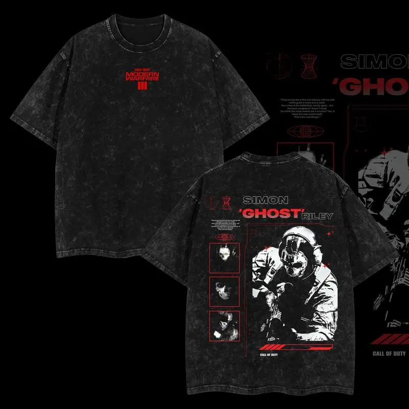 Ghost COD Double Printed Oversize Lightweight Acid Washed Tee Game Graphic T-Shirt for Men Casual Day Wear Cotton Fabric Jeans Vintage Gaming Retro Black Tee Heavyweight Cotton T-Shirts Love Menswear