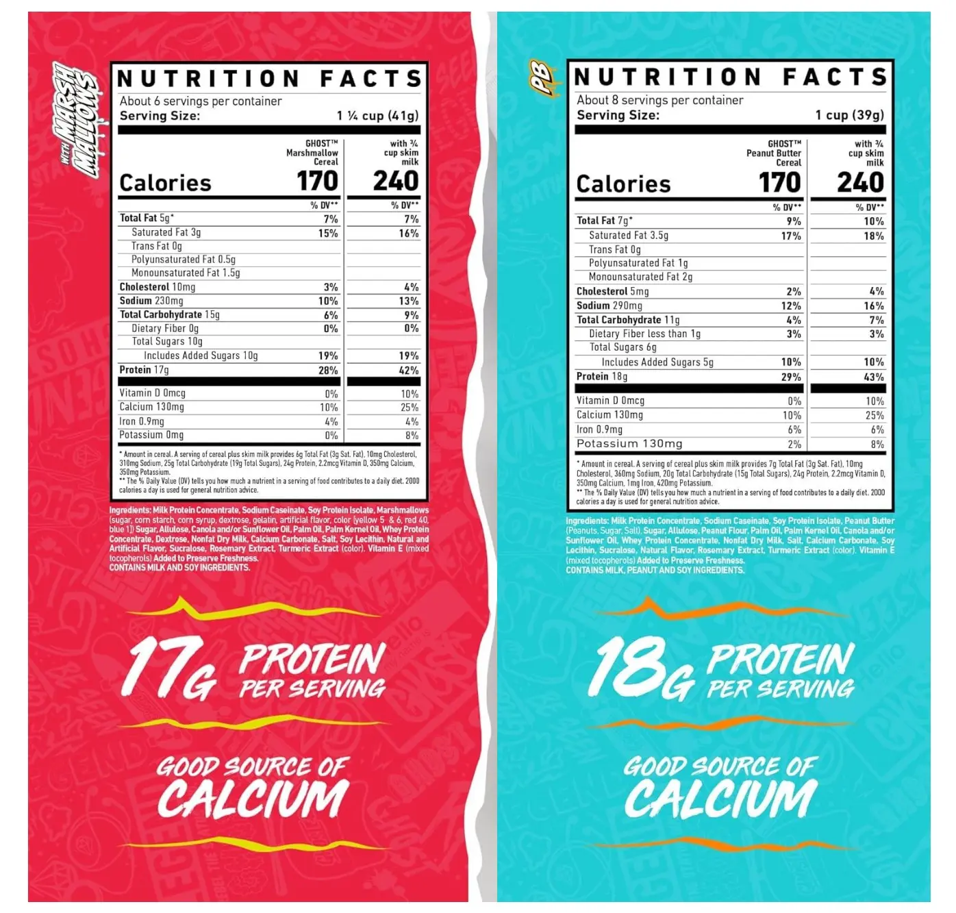Macros: Hitting your macros doesn’t have to be hard. GHOST Protein Cereal “Marshmallow” has 17G protein and offers a good source of calcium, while “Peanut Butter” packs 18G protein and only 6G sugar per serving. Get the delicious protein boost you crave in every bowlful without sacrificing your macros.