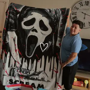 This blanket is so soft and is the perfect size for my bed. I can wrap myself up in in while I sit and watch my favorite scary movie, Scream.