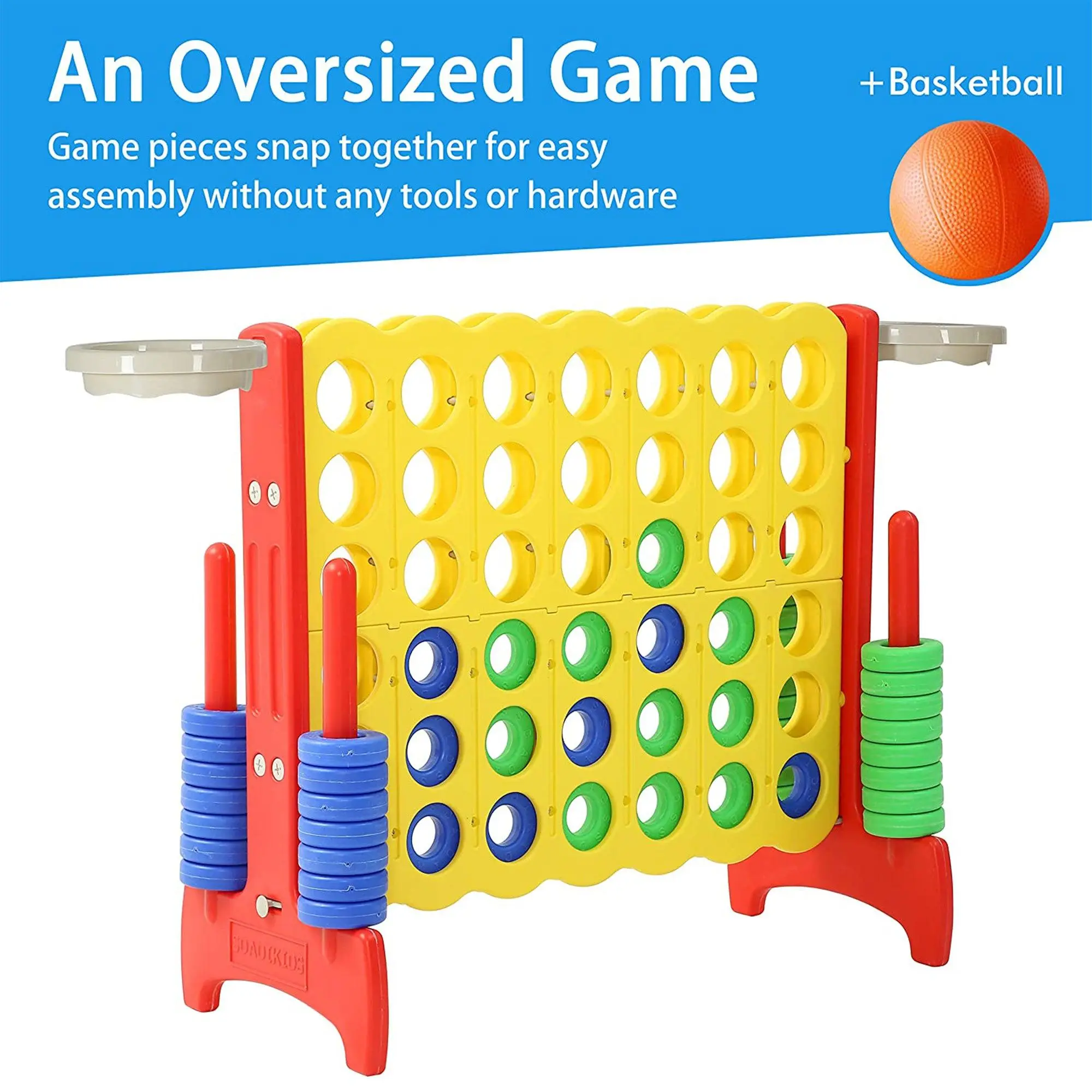 ·Giant 4-In-A-Row connect game and basketball hoops provides a fun and educational yard activity great for parties and barbecues