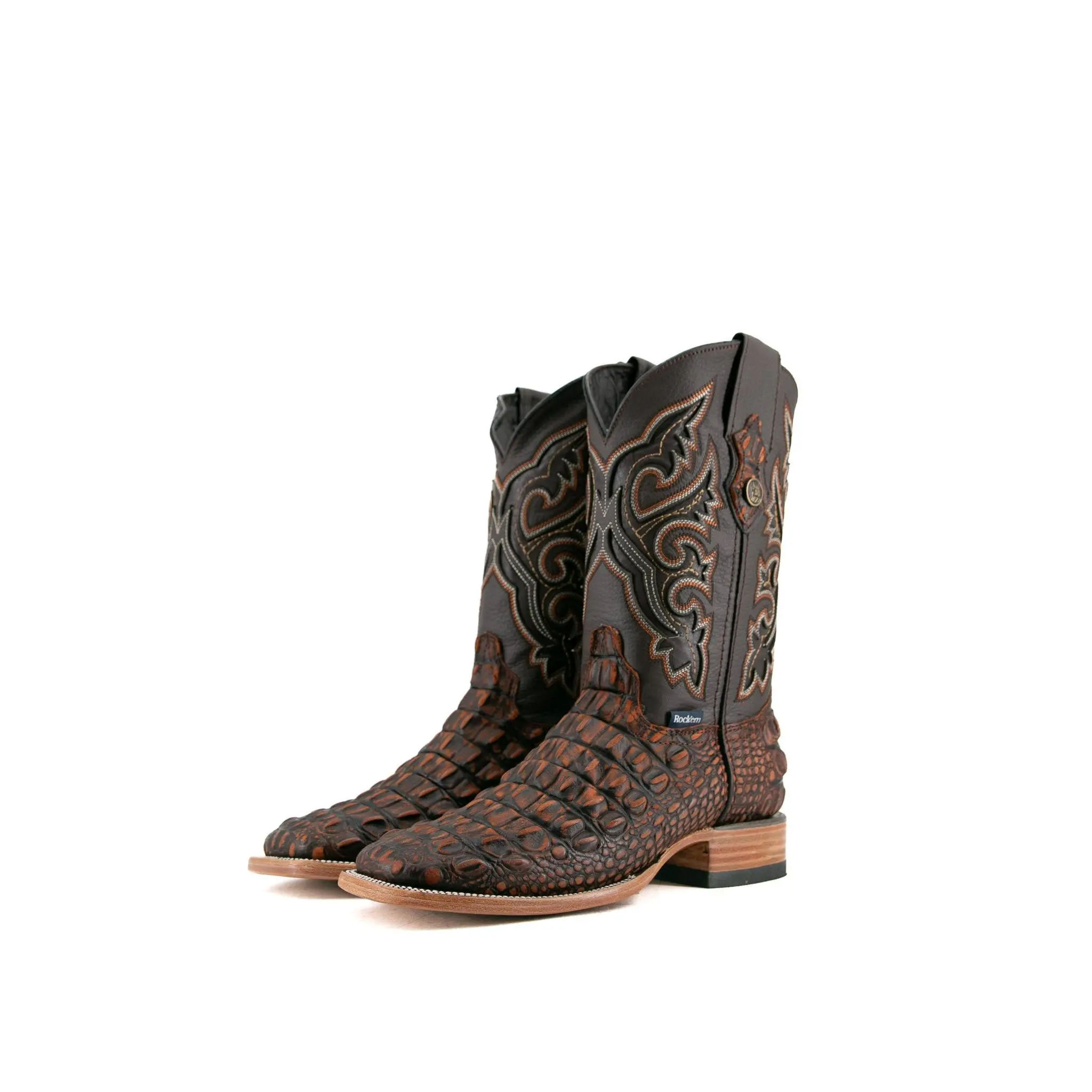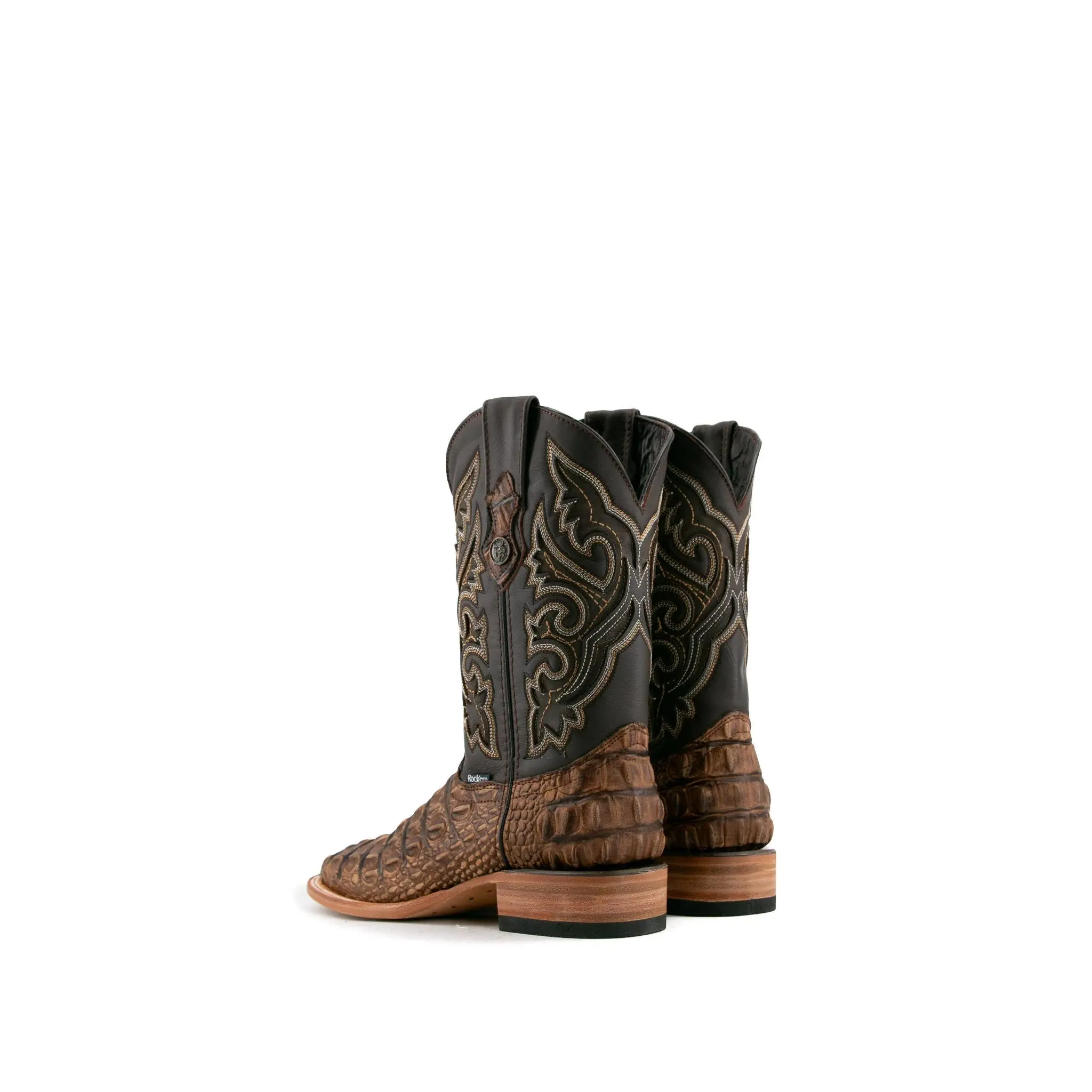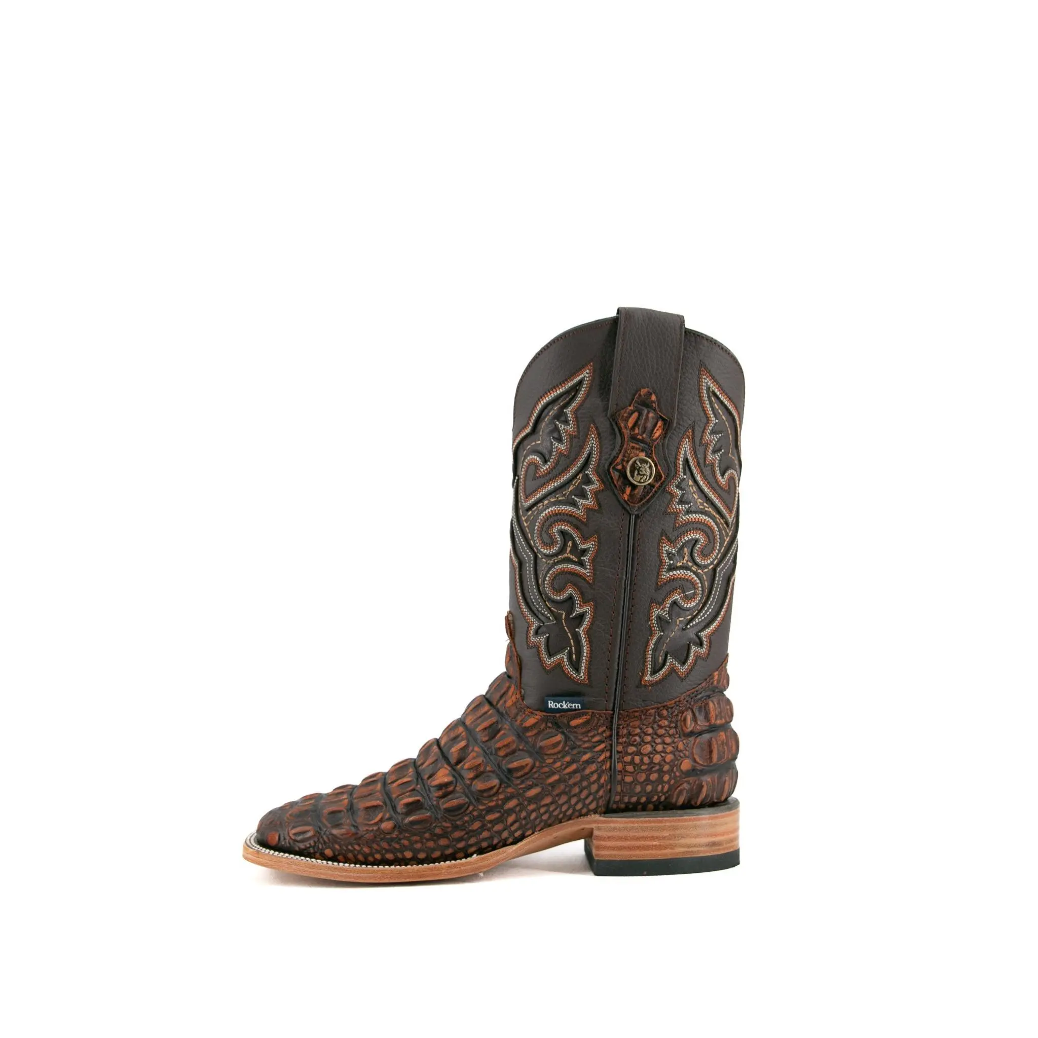 The Giant Caiman Hornback cowboy boots are expertly crafted in Mexico from genuine leather and are available in various colors. They feature a square toe design and a Caiman Hornback print texture on the vamp. The shaft is made of smooth leather, intricately stitched with an elaborate embroidery pattern. A small metallic emblem of a Rock'em bull's head on the pull straps adds a signature Western touch. The boots have a durable leather sole with a rubber heel for comfort and stability, featuring a double stitched welt for enhanced durability.
