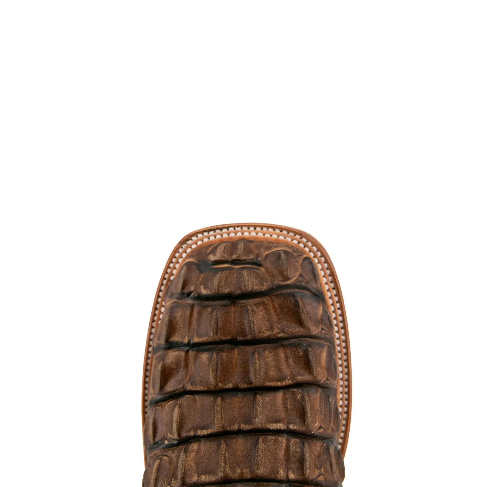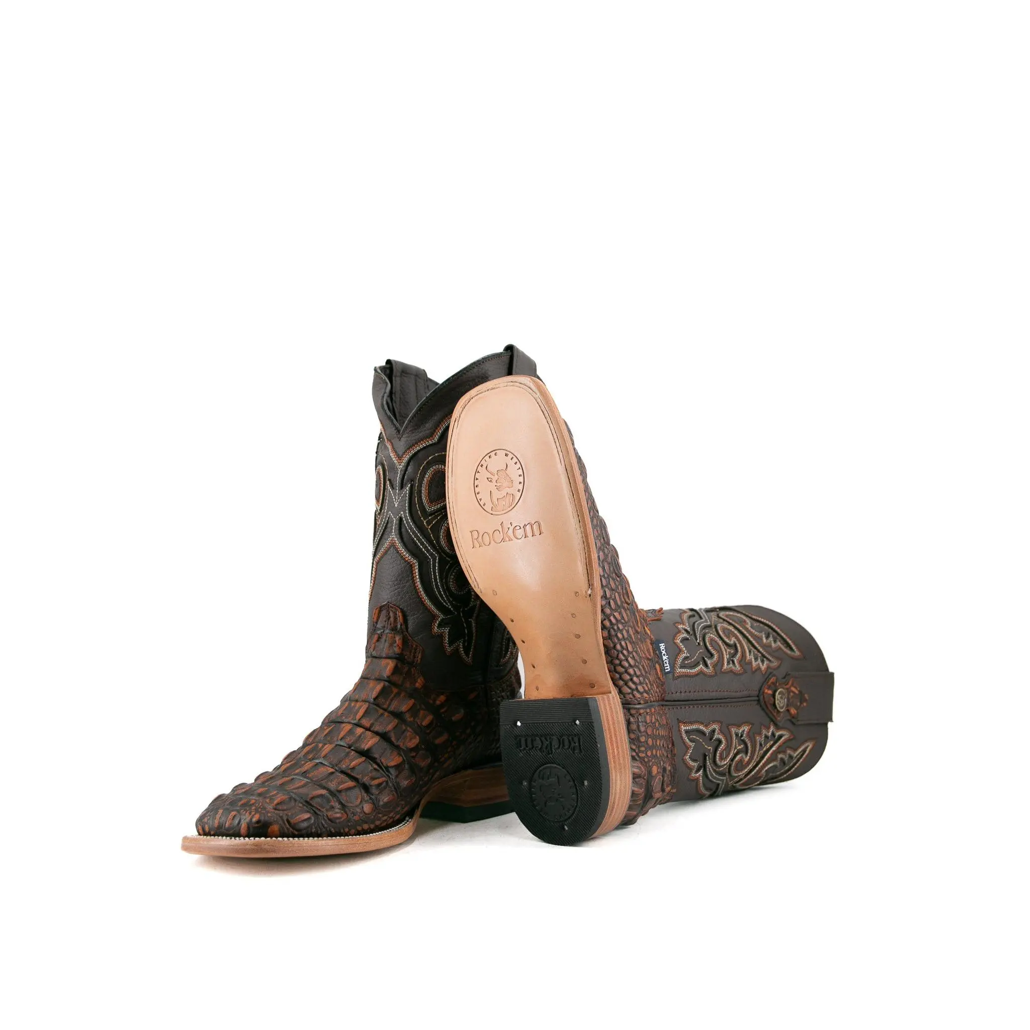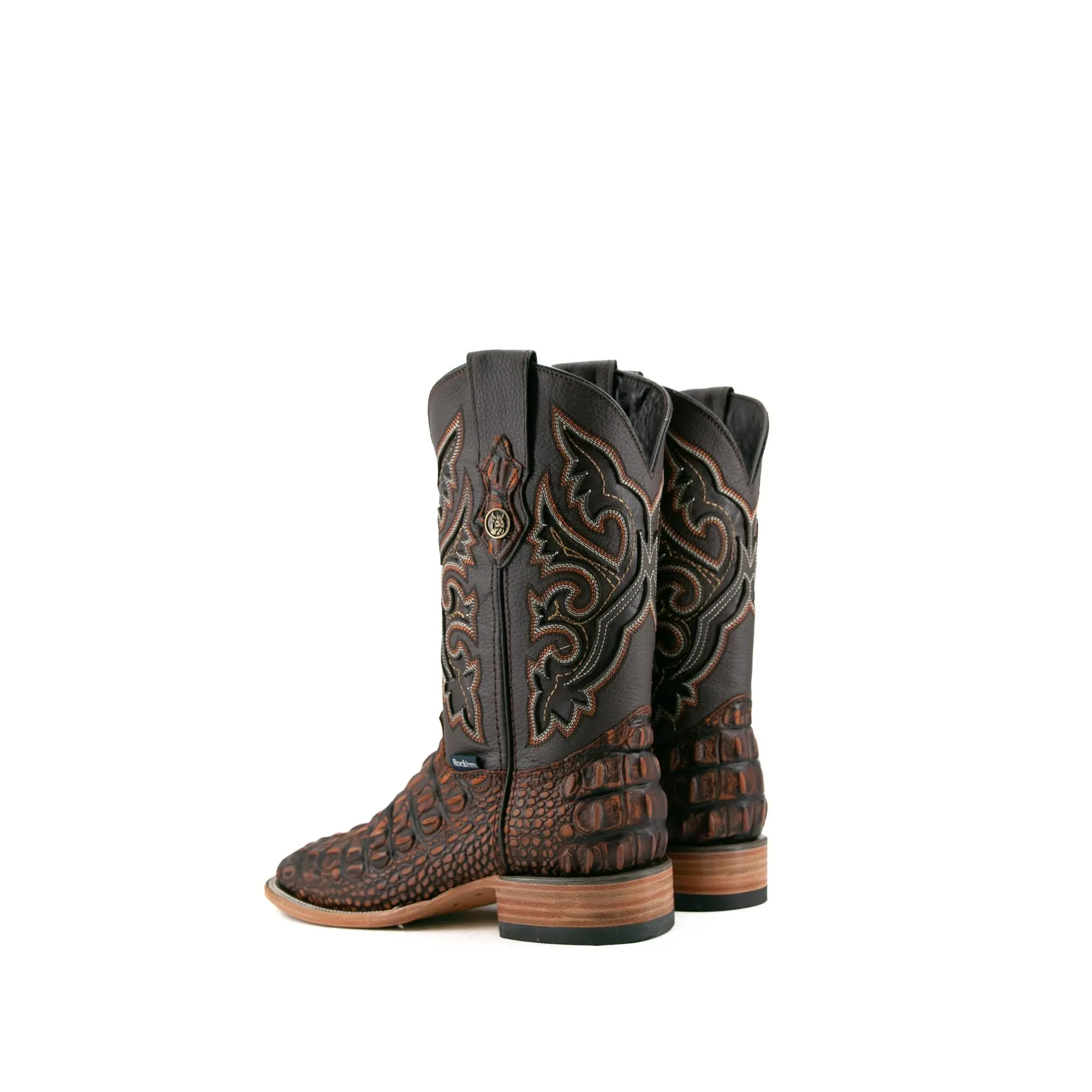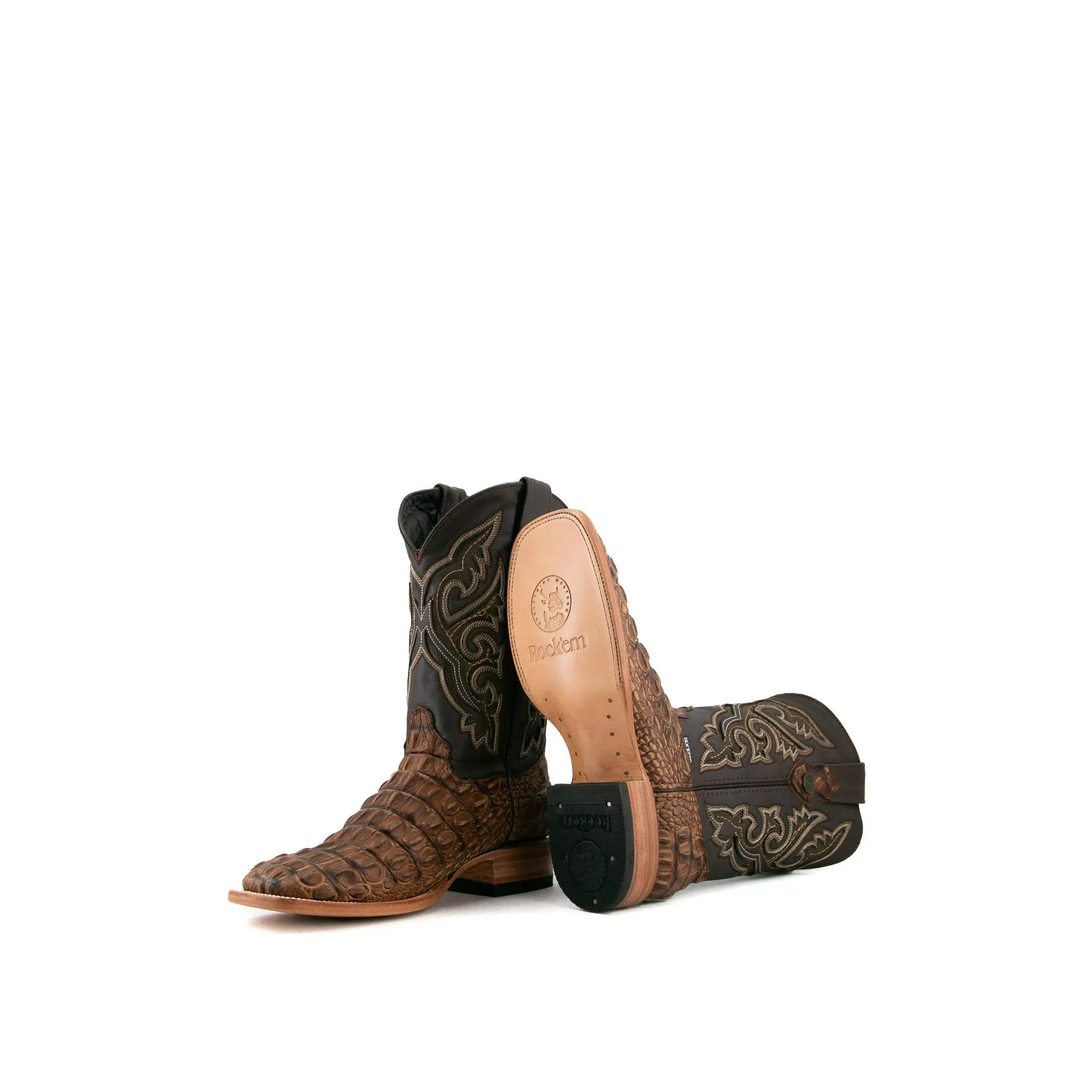 The Giant Caiman Hornback cowboy boots are expertly crafted in Mexico from genuine leather and are available in various colors. They feature a square toe design and a Caiman Hornback print texture on the vamp. The shaft is made of smooth leather, intricately stitched with an elaborate embroidery pattern. A small metallic emblem of a Rock'em bull's head on the pull straps adds a signature Western touch. The boots have a durable leather sole with a rubber heel for comfort and stability, featuring a double stitched welt for enhanced durability.