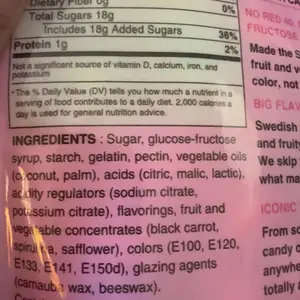 Sugar, glucose syrup, palm fat, sorbitol syrup, citric acid, gelatin, natural fruit & plant extracts (like apple, carrot, blackcurrant, lemon), sunflower oil, beeswax