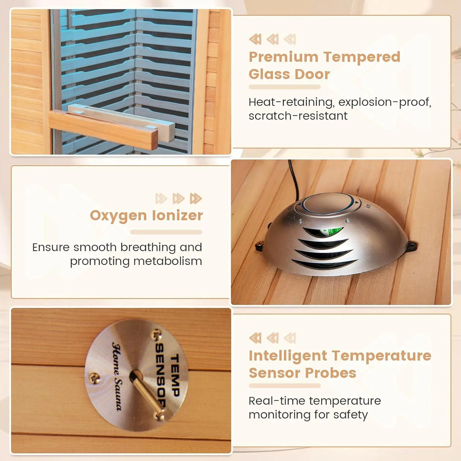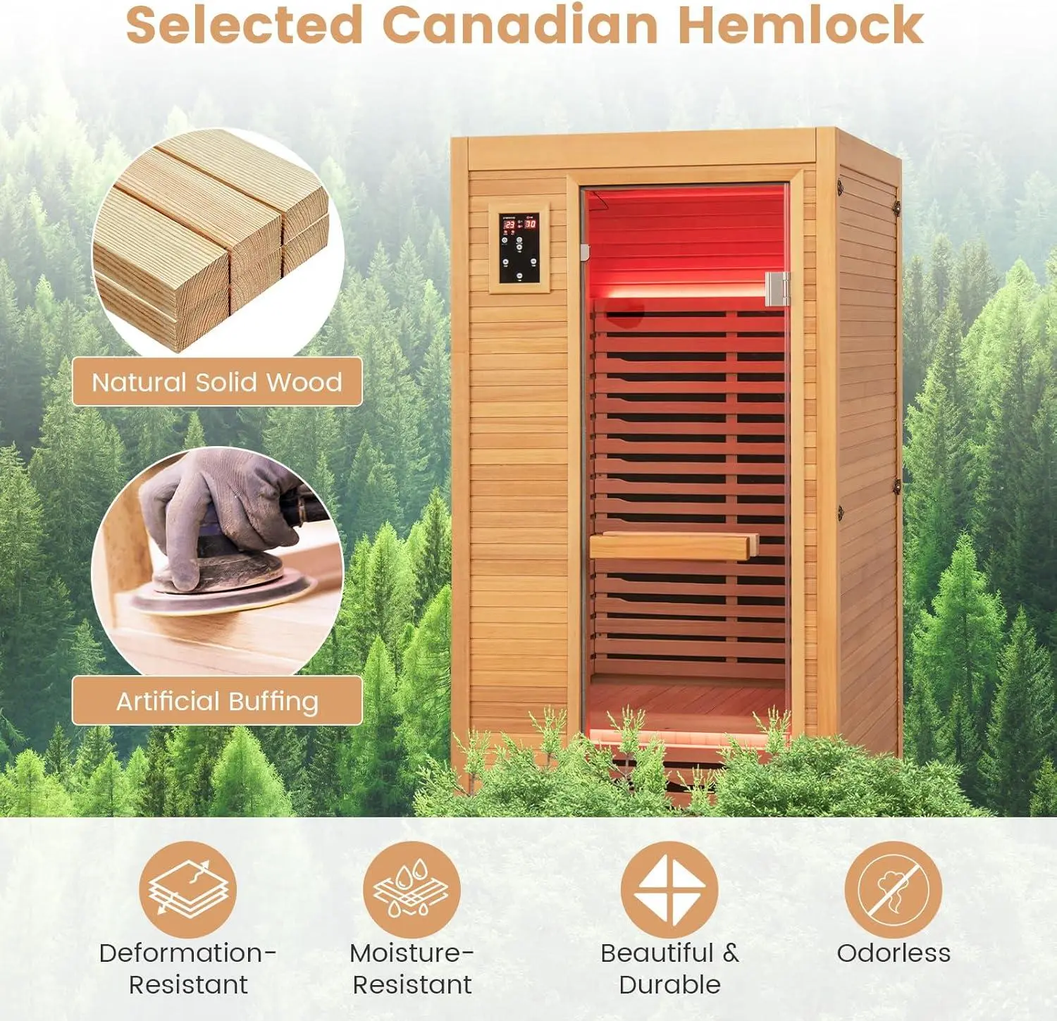 ·[Selected Hemlock Frame & Tempered Door] The wooden frame is crafted of selected Canadian hemlock, which is deformation-resistant and moisture-resistant, ensuring long-lasting durability. Furthermore, it adopts a premium tempered door, which is scratch-resistant and can effectively retain heat while preventing explosion, ensuring safe use.
