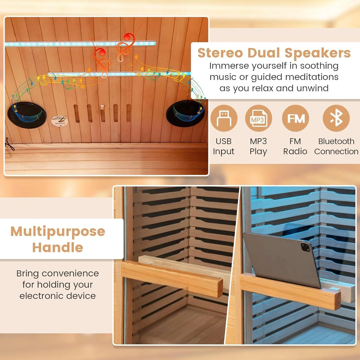 ·[Dual Panel Operation & Immersive Sauna Experience] The wooden sauna room is equipped with dual intelligent control panels, bringing convenience for operation both inside and outside the sauna. And the inside panel features APS function with 3 sound effects (low/medium/high) and mute function. Furthermore, the inside panel features a USB input, MP3 play, and FM radio.