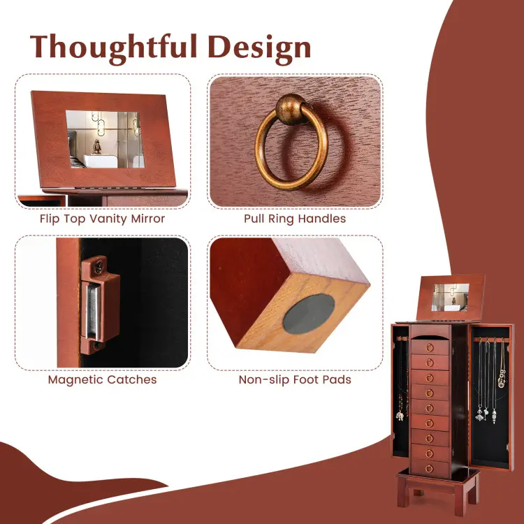 ● Unique Flip-Top Mirror Design: The standing jewelry storage cabinet features a flip-top vanity mirror, allowing you to try on jewelry and check your appearance conveniently before stepping out.