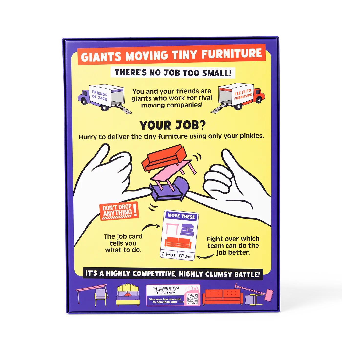 If you’re looking for a different type of game night, this is it. Want to remember what it’s like to move furniture, but you’re a little too old and might throw out your back? Well, play this game, and just use your pinky finger and the shaky trust of a friends pinky finger and start your own moving company.