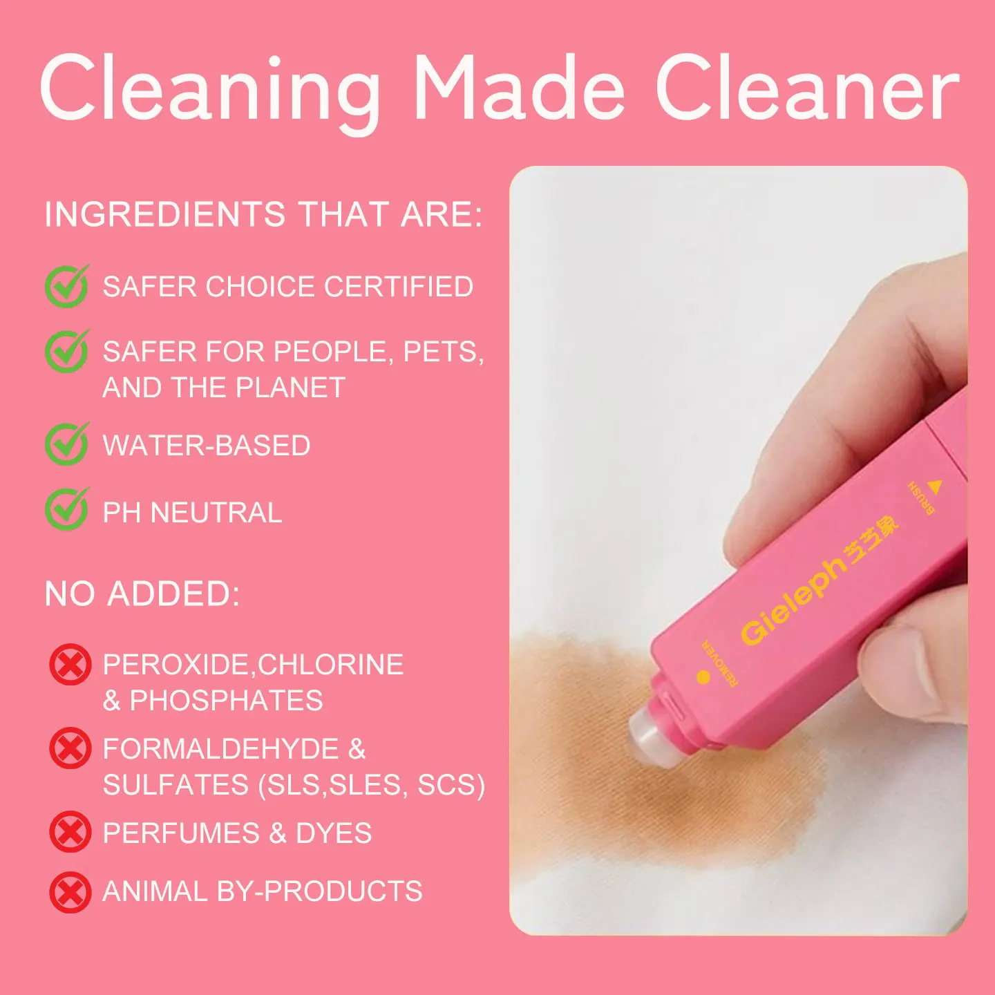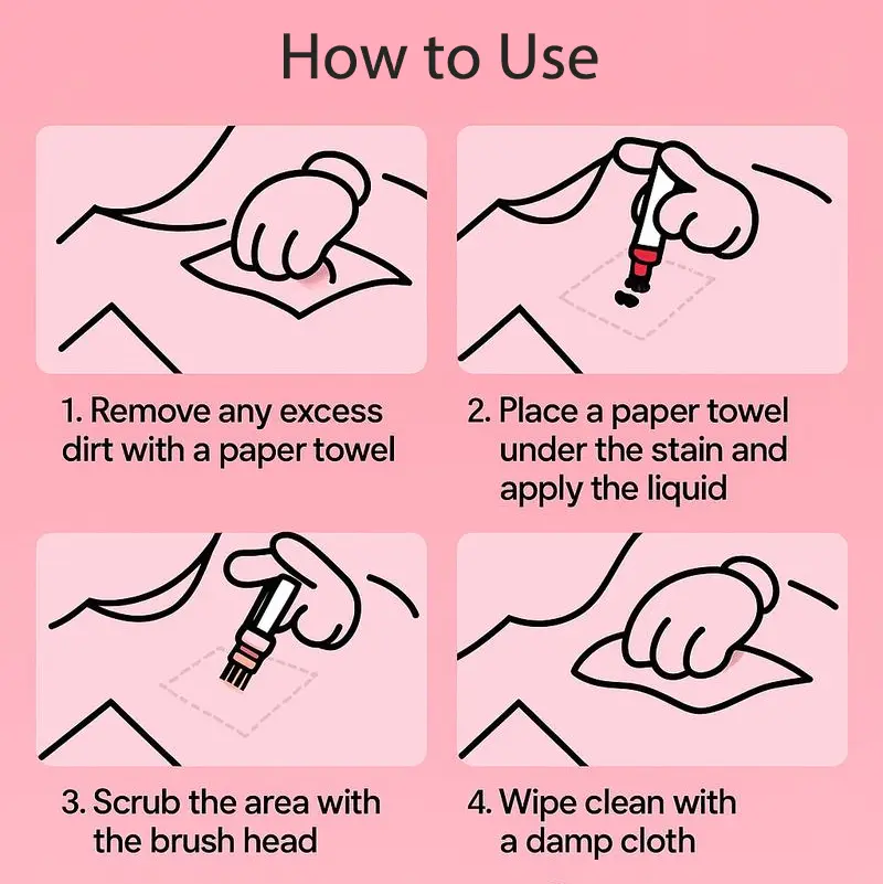 【How to Use】 Step 1: Dab excess stain with a paper towel Step 2: Roll the Uniform Ball over the stain to release the cleaning liquid Step 3: Use the Arc Brush Head to gently scrub Step 4: Wipe clean with a wet towel—stain gone!
