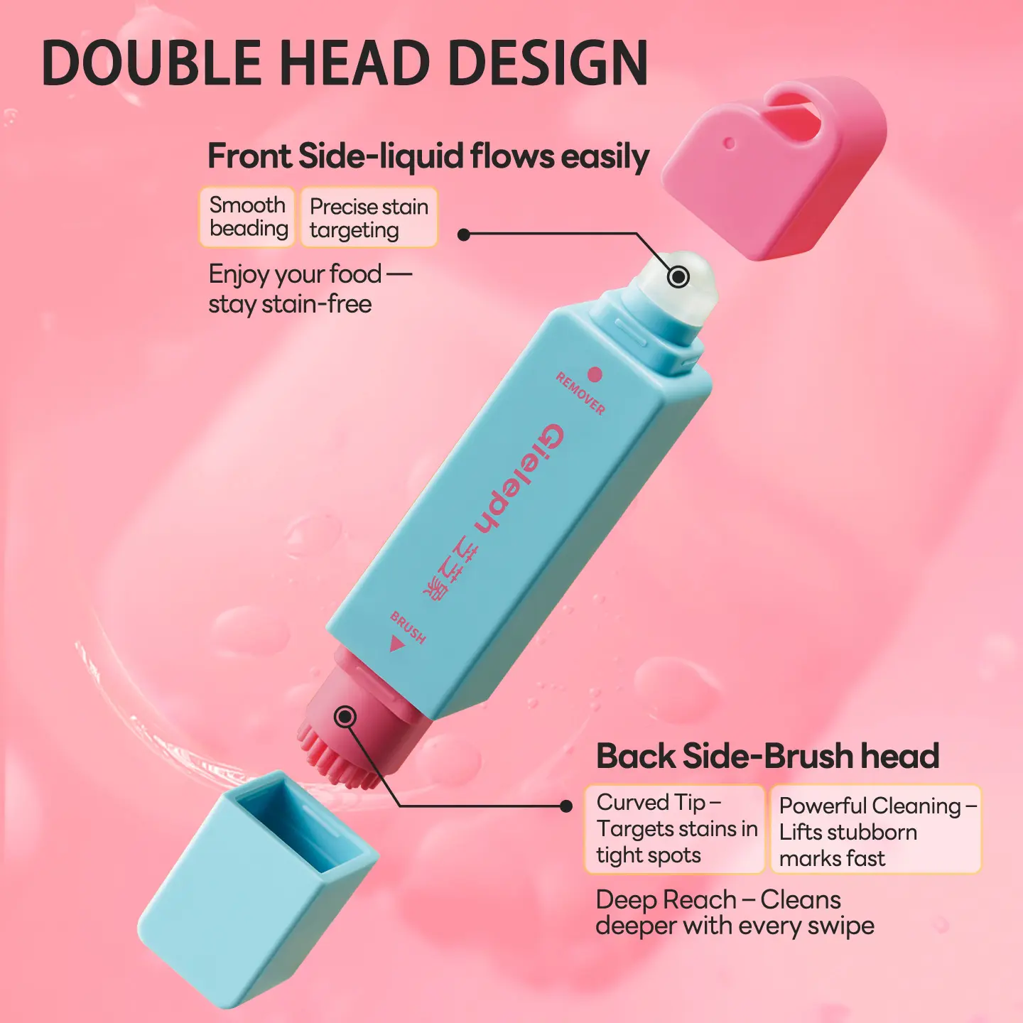 【Easy-to-Use Dual-Head Design】Featuring a double-head design, the Stain Remover Pen offers a practical and hassle-free experience. Simply apply the cleaning liquid with the uniform ball, scrub gently with the arc brush head, and wipe the area clean. It’s the perfect on-the-go stain remover.