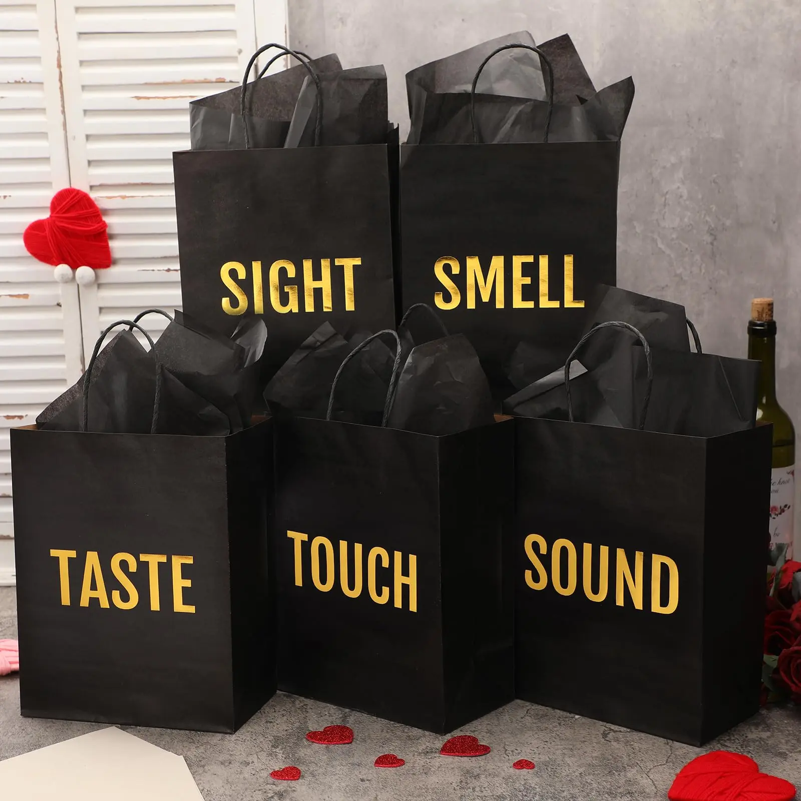 Each of the five senses gift bags for him comes adorned with English letters and sentimental annotations representing the five senses -- [TASTE], [TOUCH], [SMELL], [SOUND], and [SIGHT].