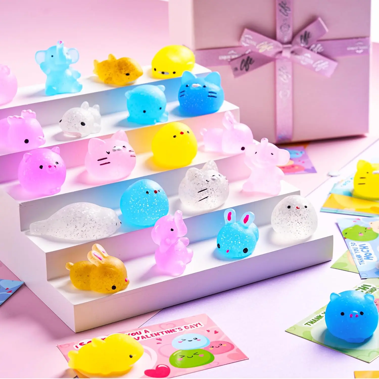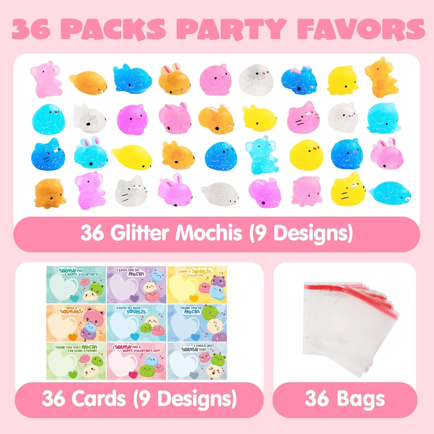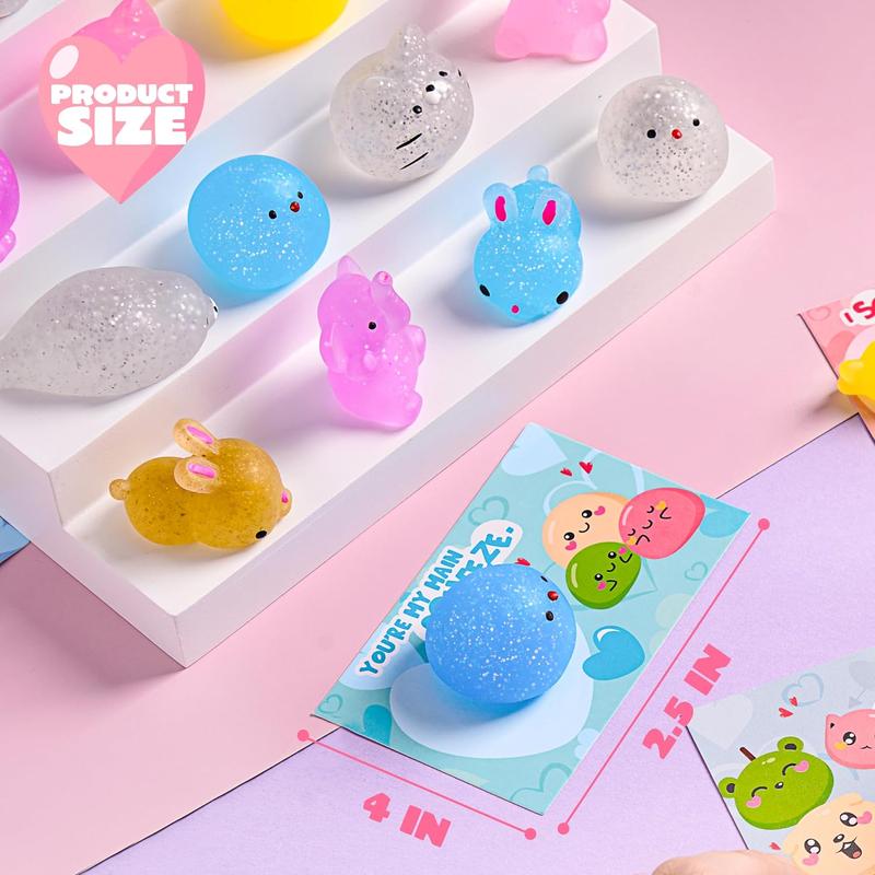 Get ready to celebrate with a delightful Valentine's Day experience! This set includes 36 packs of Valentine’s Day gift cards, each featuring glittery Mochi squishy toys and unique Love Note card designs. Each pack includes a stress relief fidget toy and a card, allowing you to combine the two for a delightful and cherished addition to your collection.