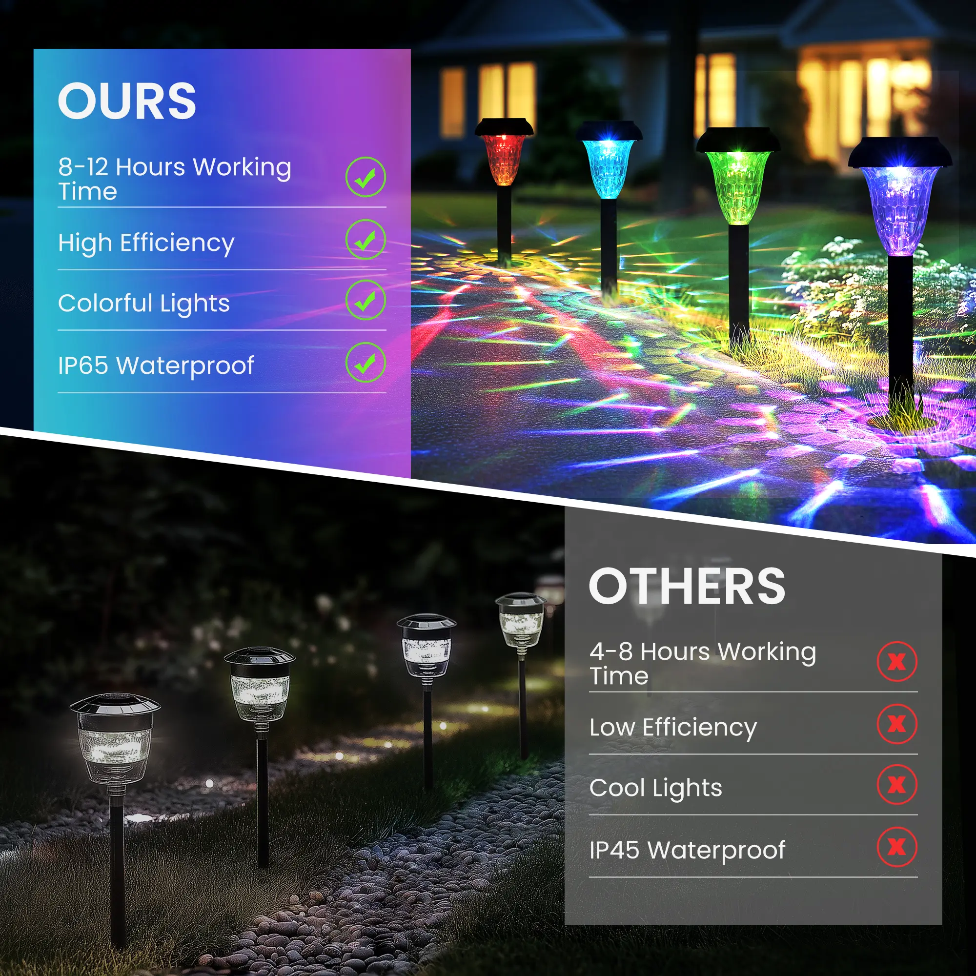·Elegant Outdoor Decor: Enhance your gardens, patios, yards, pathway with colorful solar garden lights! These solar-powered lights infuse magic into pathways, porches, lawns, and walkways, crafting a stunning display of garden, patio, and yard decorations