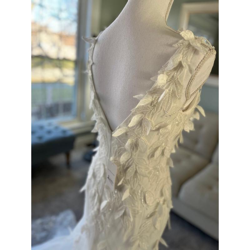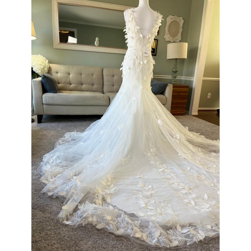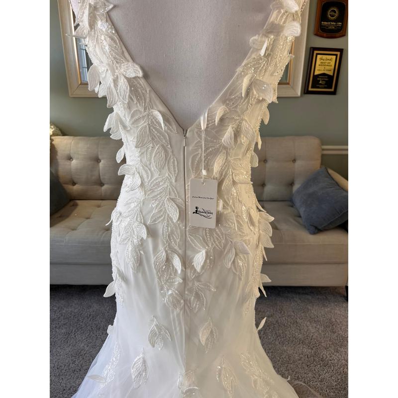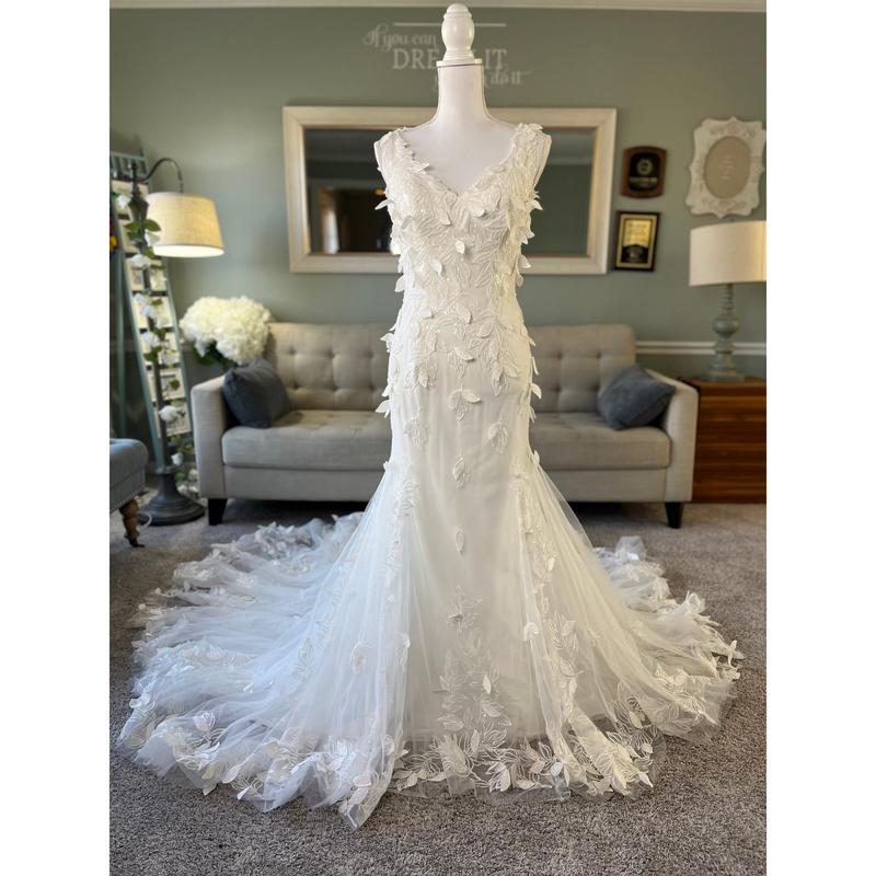 Our Gina Fit and Flare wedding dress contains 3D Leaf-Like Lace and is perfect for a fairytale wedding day! This dress includes a sleek sexy silhouette , a V-neckline and a deep V neck at the back and is sure to make you the center of attention!