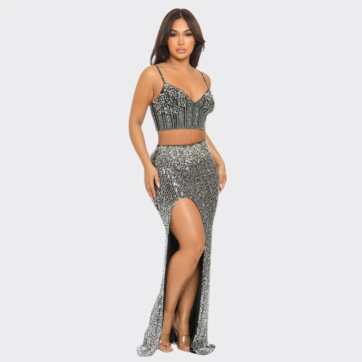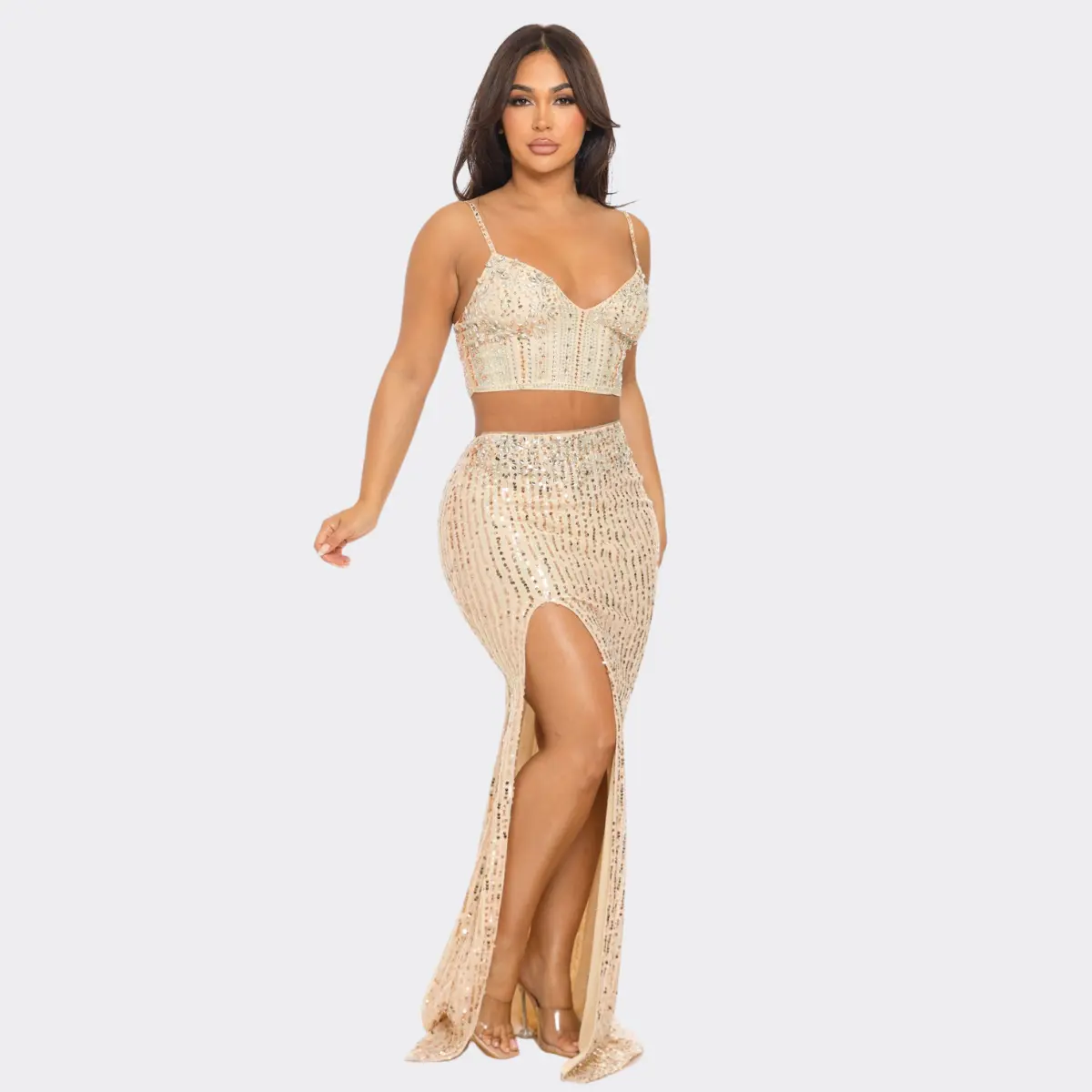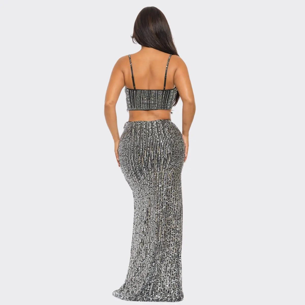Gina Sequin Two-Piece Corset Maxi Set - Black & Beige Sparkling Sequined Crop Top with High Slit Skirt Ensemble