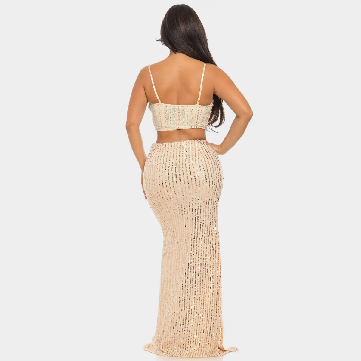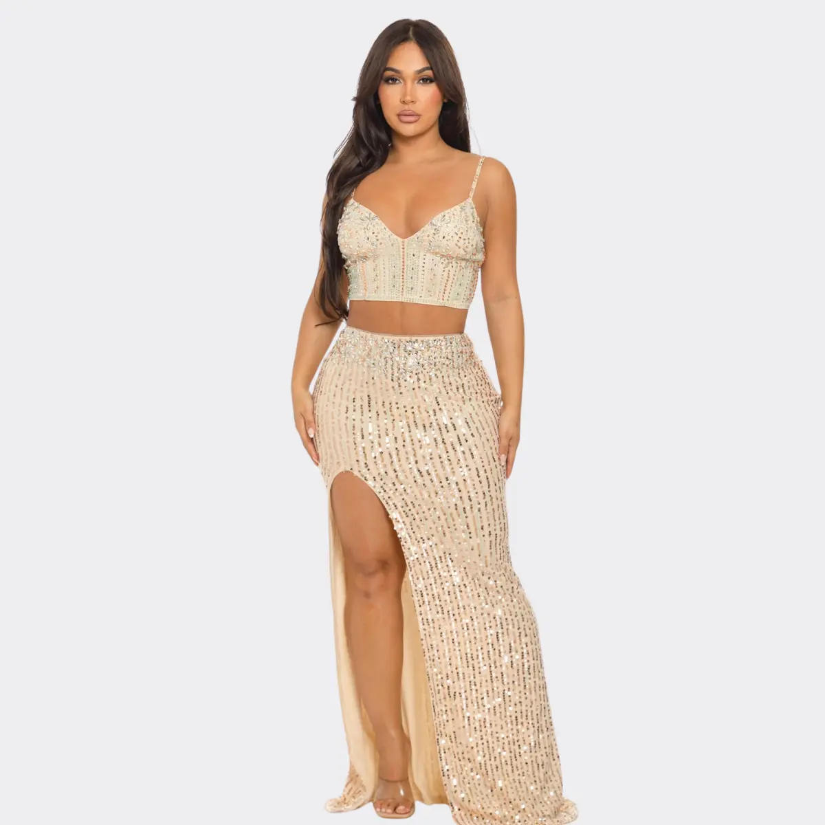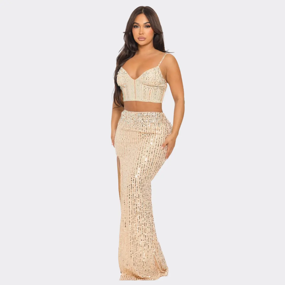 5. Gina Sequin Two-Piece Corset Maxi Set - Black & Beige Sparkling Sequined Crop Top with High Slit Skirt Ensemble