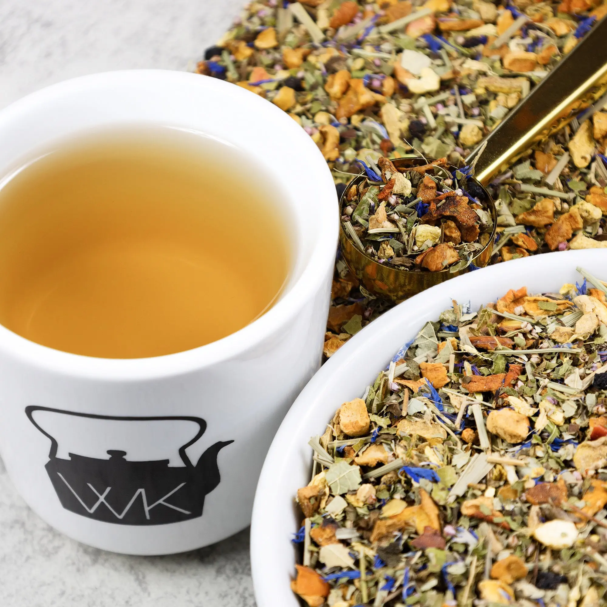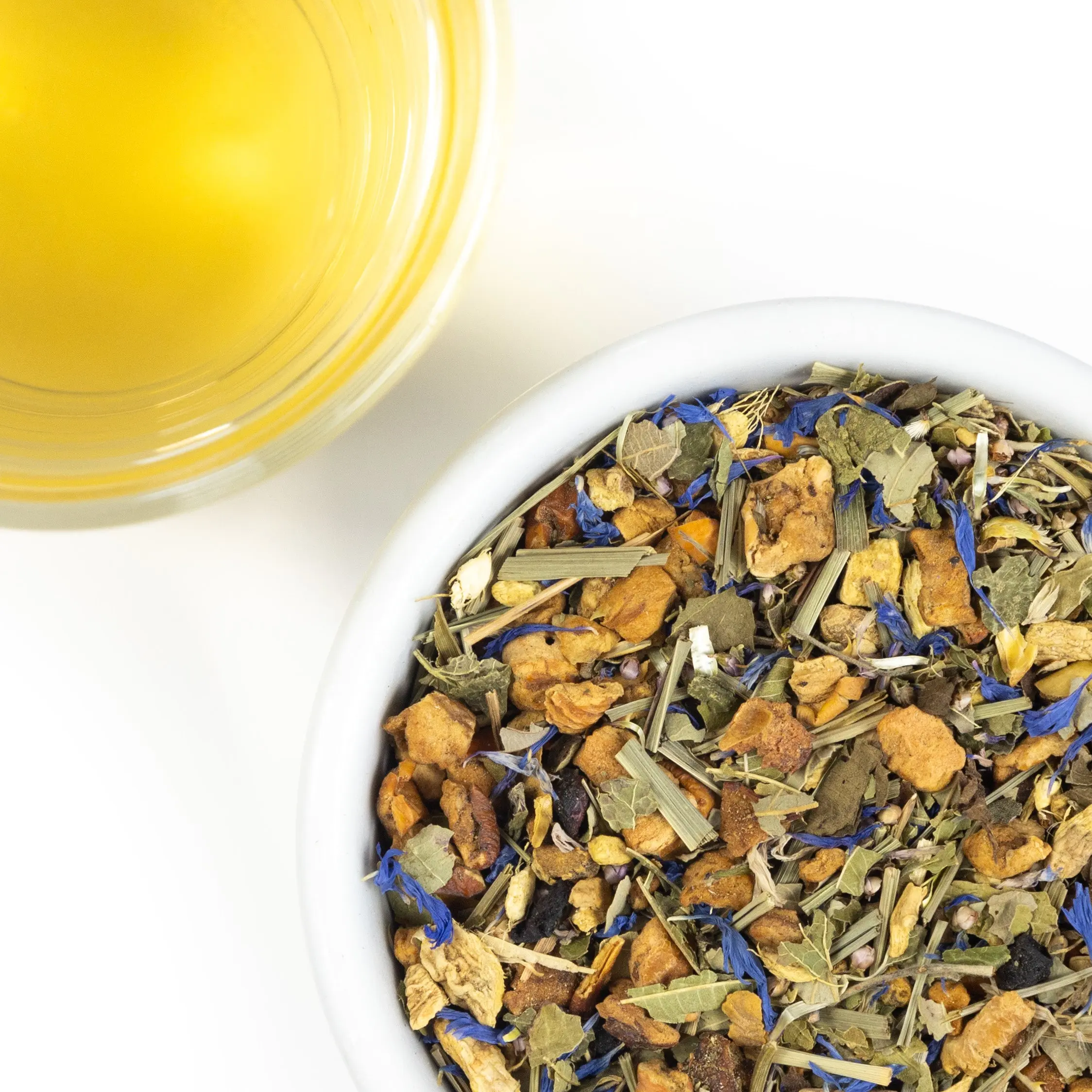 A nice balance of blueberry and ginger. If I'm feeling under the weather, it's easy to steep it longer and hotter to draw out the ginger, and on days when I want a light tea, it's easy to get the blueberry to shine through.