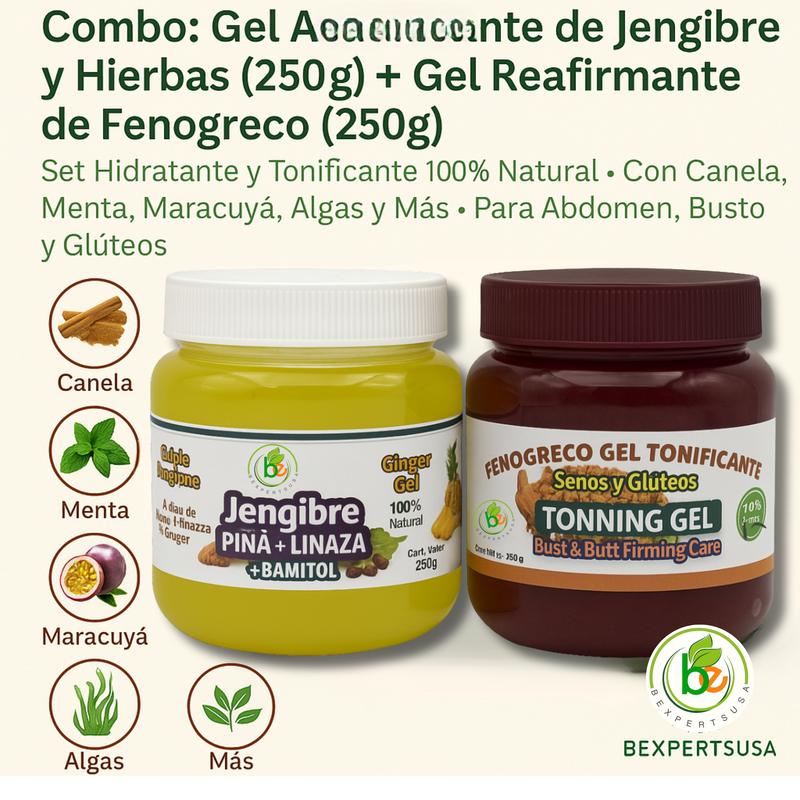 This set includes a 250g Gel de Jengibre and a 250g Fenugreek Firming Gel. Both are 100% natural, designed for hydration and toning. Perfect for abdomen, bust, and glutes. Infused with cinnamon, mint, passion fruit, algaes, and more. Experience the benefits of natural ingredients in every application.