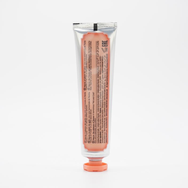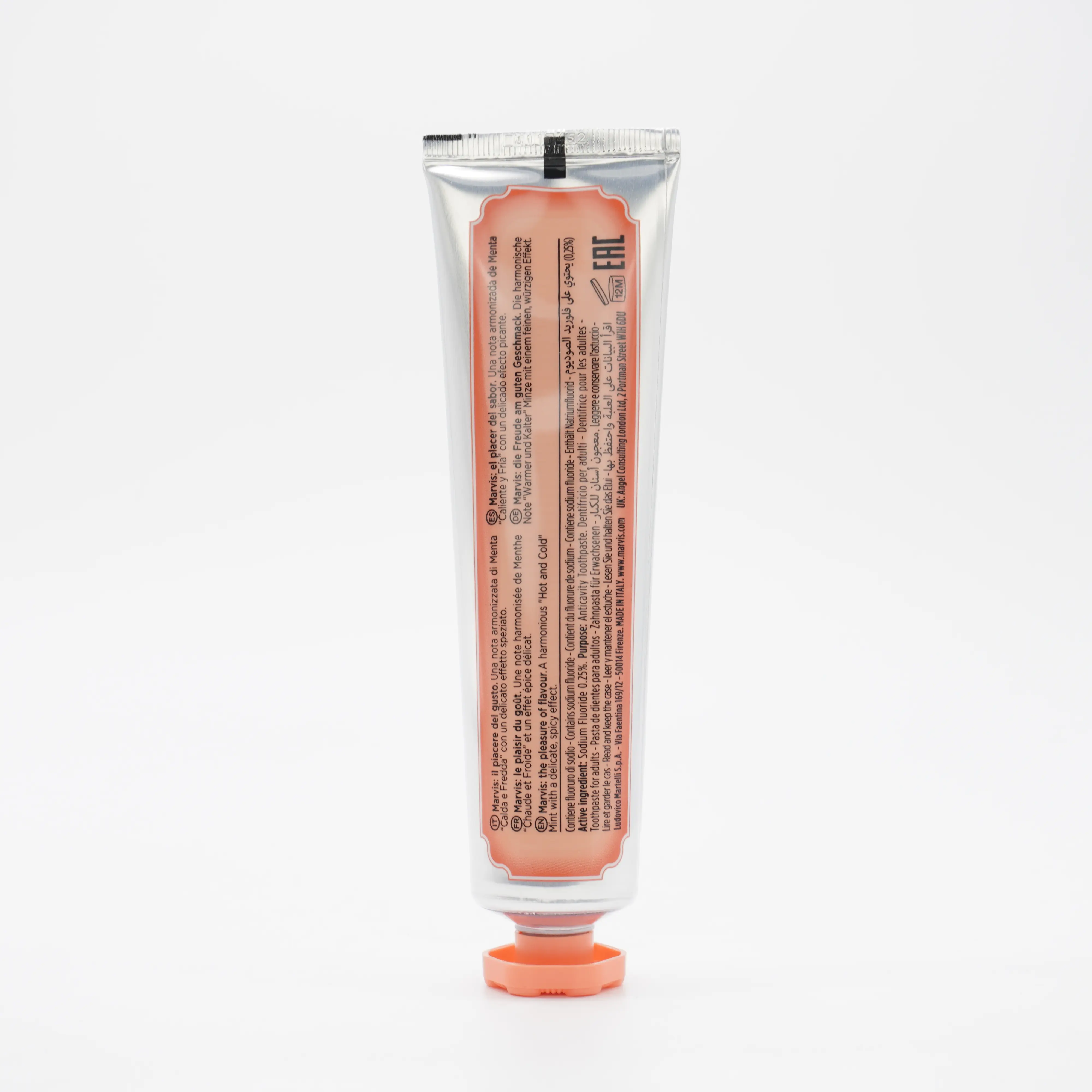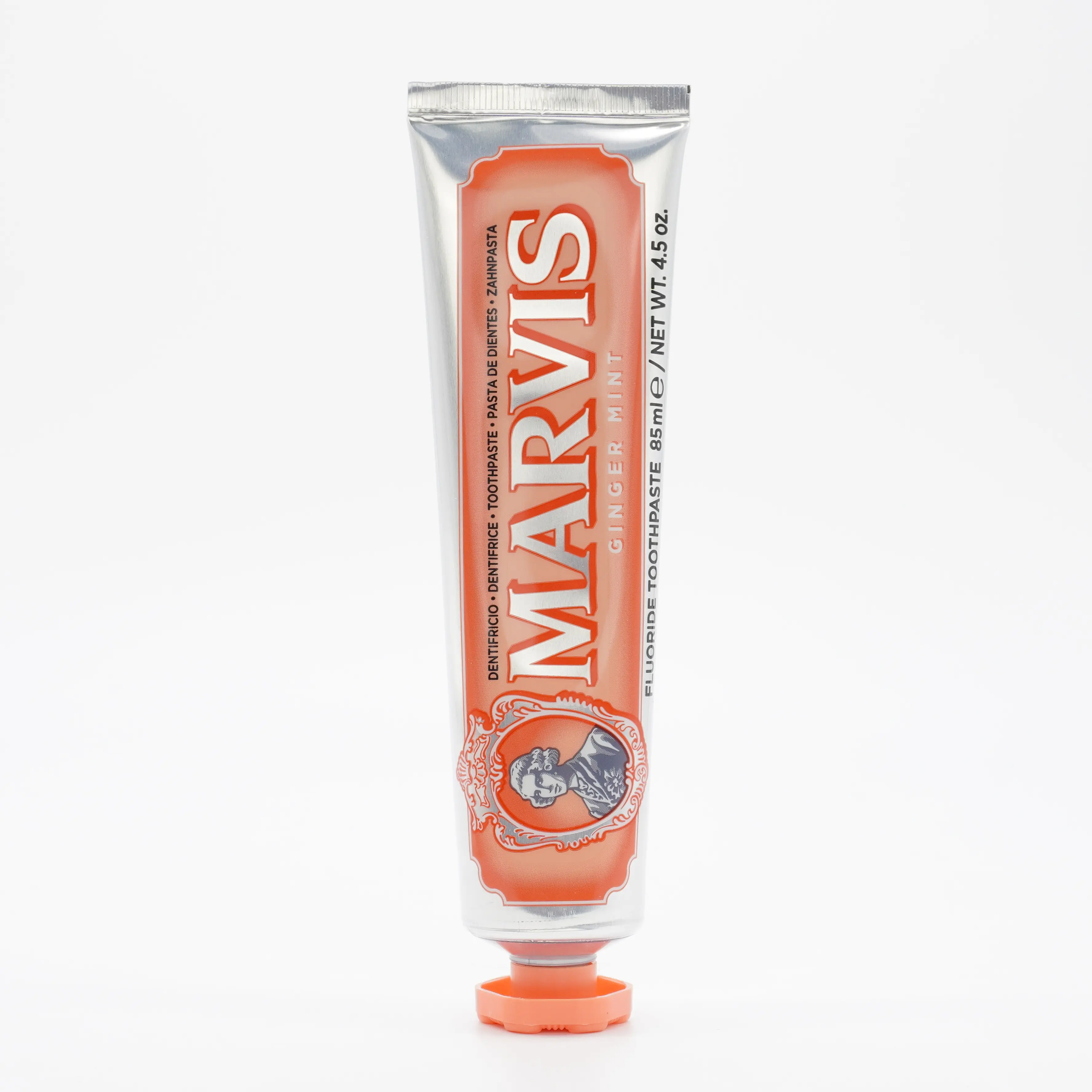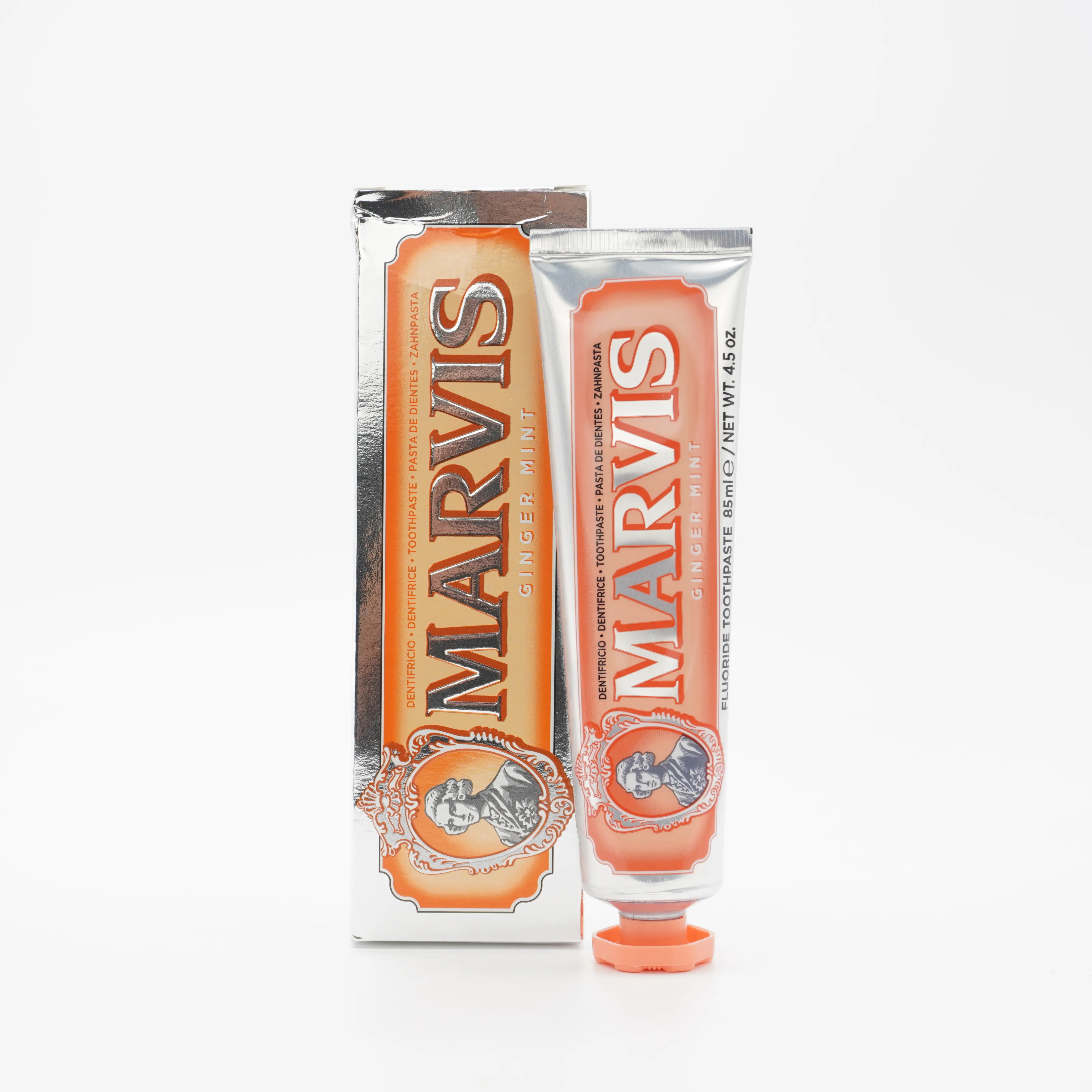 Marvis Ginger Mint Toothpaste 3 oz. This unique toothpaste combines the invigorating flavor of ginger with the coolness of mint, providing a delightful brushing experience that not only cleans your teeth but also leaves your mouth feeling fresh and revitalized.