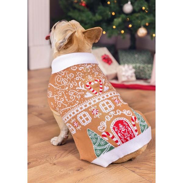 The pullover pet sweater features a plain front panel with leg openings that simplify getting your pet dressed. The sweater has an ivory turtleneck and rib-knit hem that ensure its coziness. Meanwhile, an elaborate white knitted pattern looks like carefully piped icing. Green knit trees and red-and-white peppermint candies complete the classic gingerbread design.