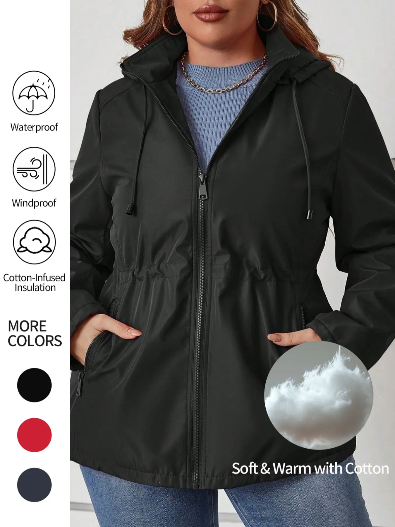 5. Women's Plus Size Cotton Jacket, Hooded Spring Fall Coat, Waist Drawstring Pocket Casual Outerwear, Warm Winter Thin Cotton Vest