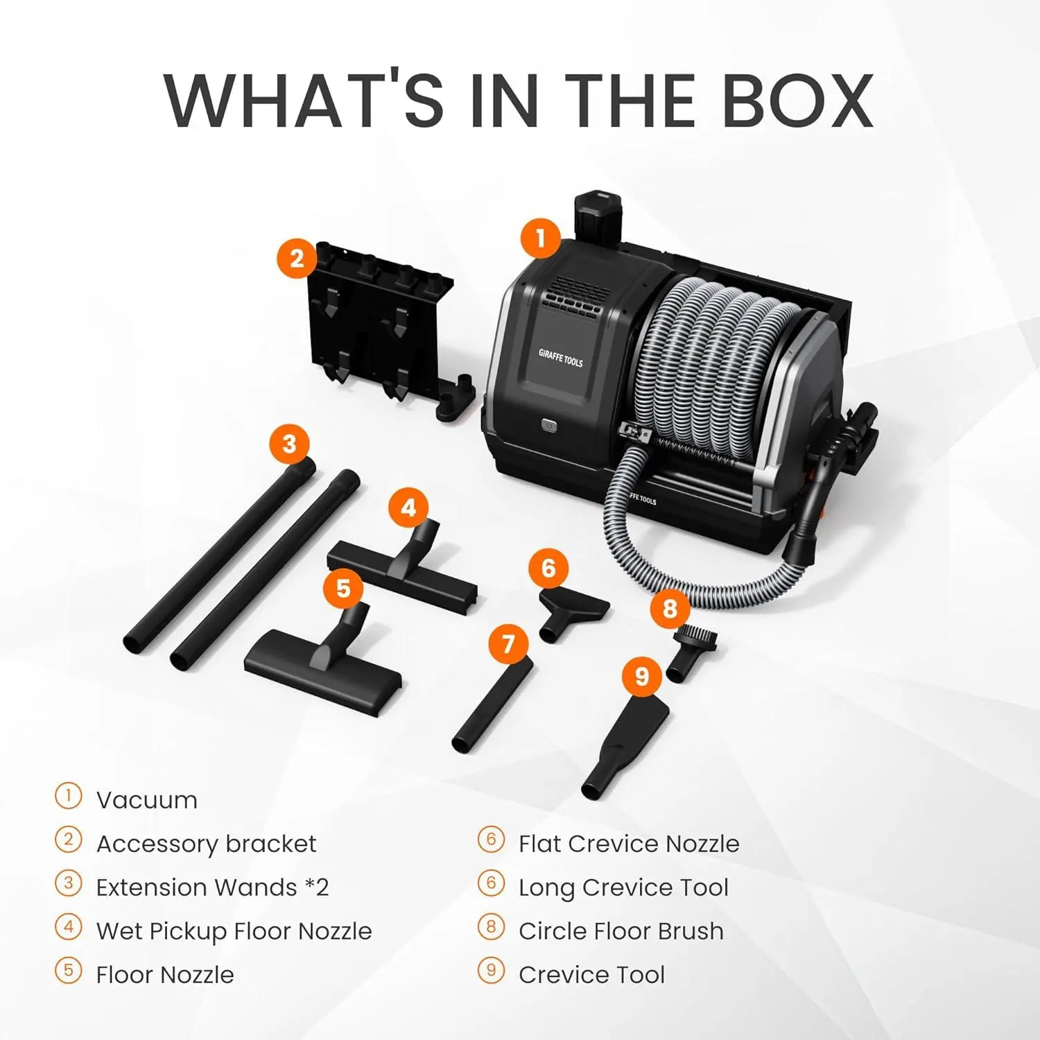 Giraffe Tools Grandstorm Vacuum Cleaner 30ft Retractable Powerful Wet Dry Home Garage Cleaning with 6 Nozzles & 4 4.5 Gallon Dustbin Capacity