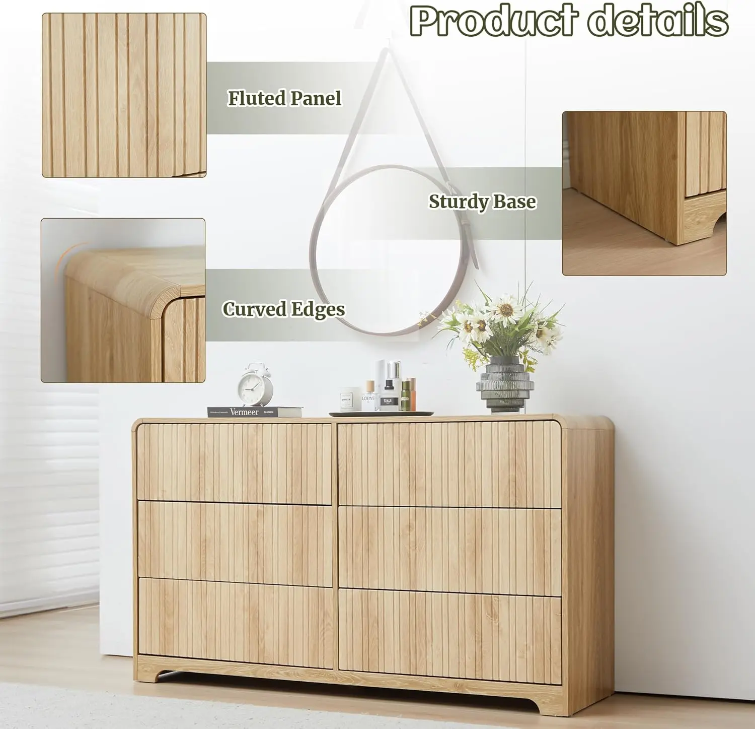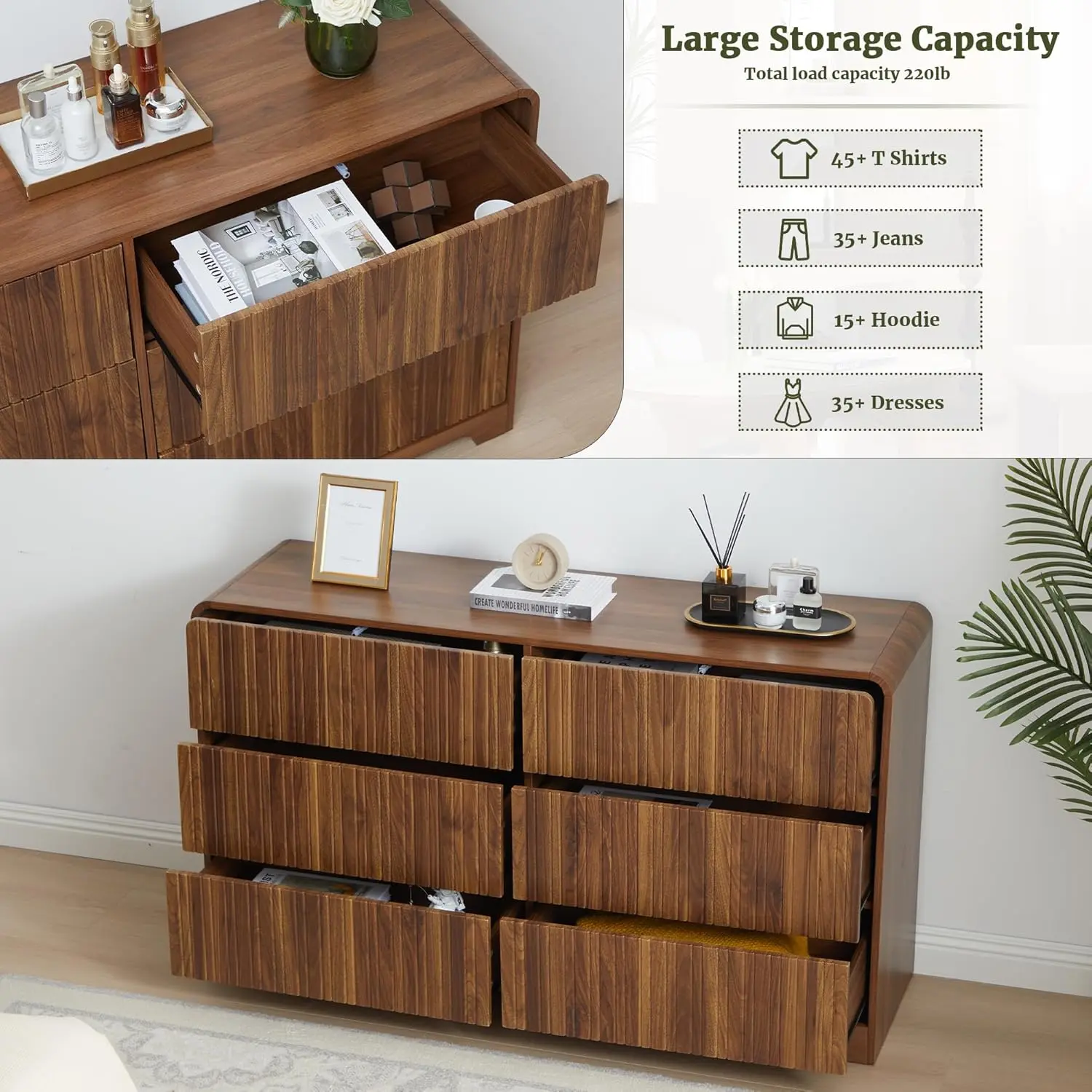 ·Sleek, Modern Design: This 6-drawer double dresser boasts a clean, minimalist look, featuring press-rebounce doors for a seamless, clutter-free appearance. The gently curved top plate not only softens sharp edges but also adds a touch of elegance while providing extra protection for your family. Its wood veneer finish and fluted panel design blend beautifully with modern, contemporary, or transitional décor styles.