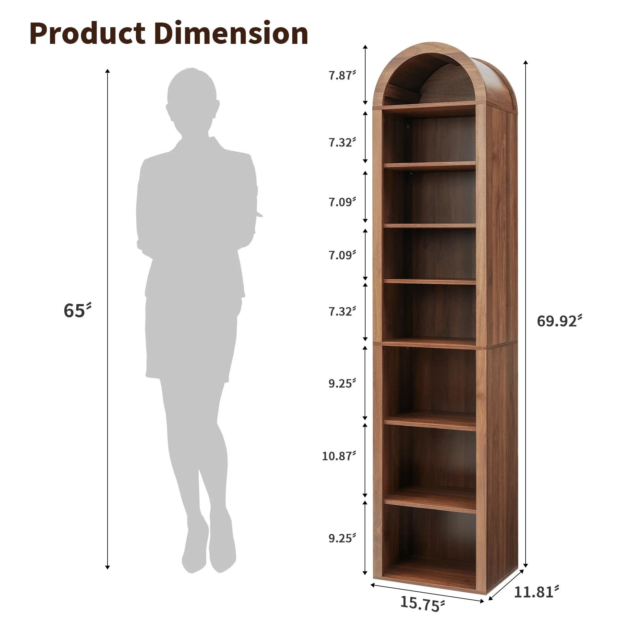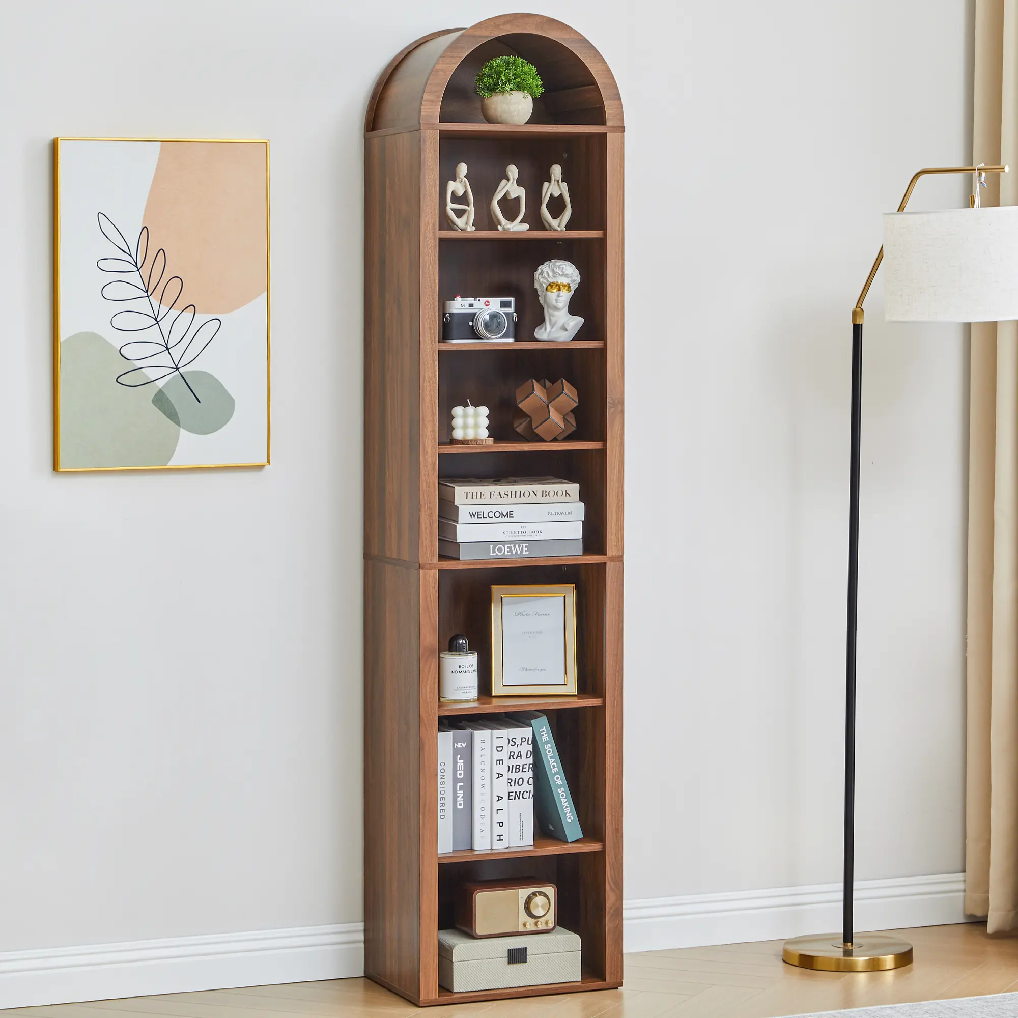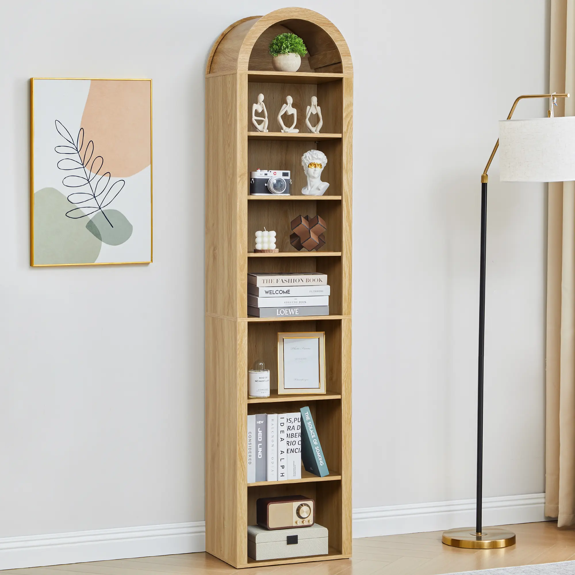 Transform your living room or office with this elegant 70" Tall Arched Wooden Bookshelf. Featuring a modern farmhouse design, this 8-tier bookcase offers ample storage and display space for your books, décor, and other essentials. The unique arched top adds a stylish touch, while the adjustable shelves make it easy to customize the shelf height for different items. Whether you're organizing books, showcasing plants, or displaying cherished décor, this bookshelf is a versatile and attractive solution for any room.