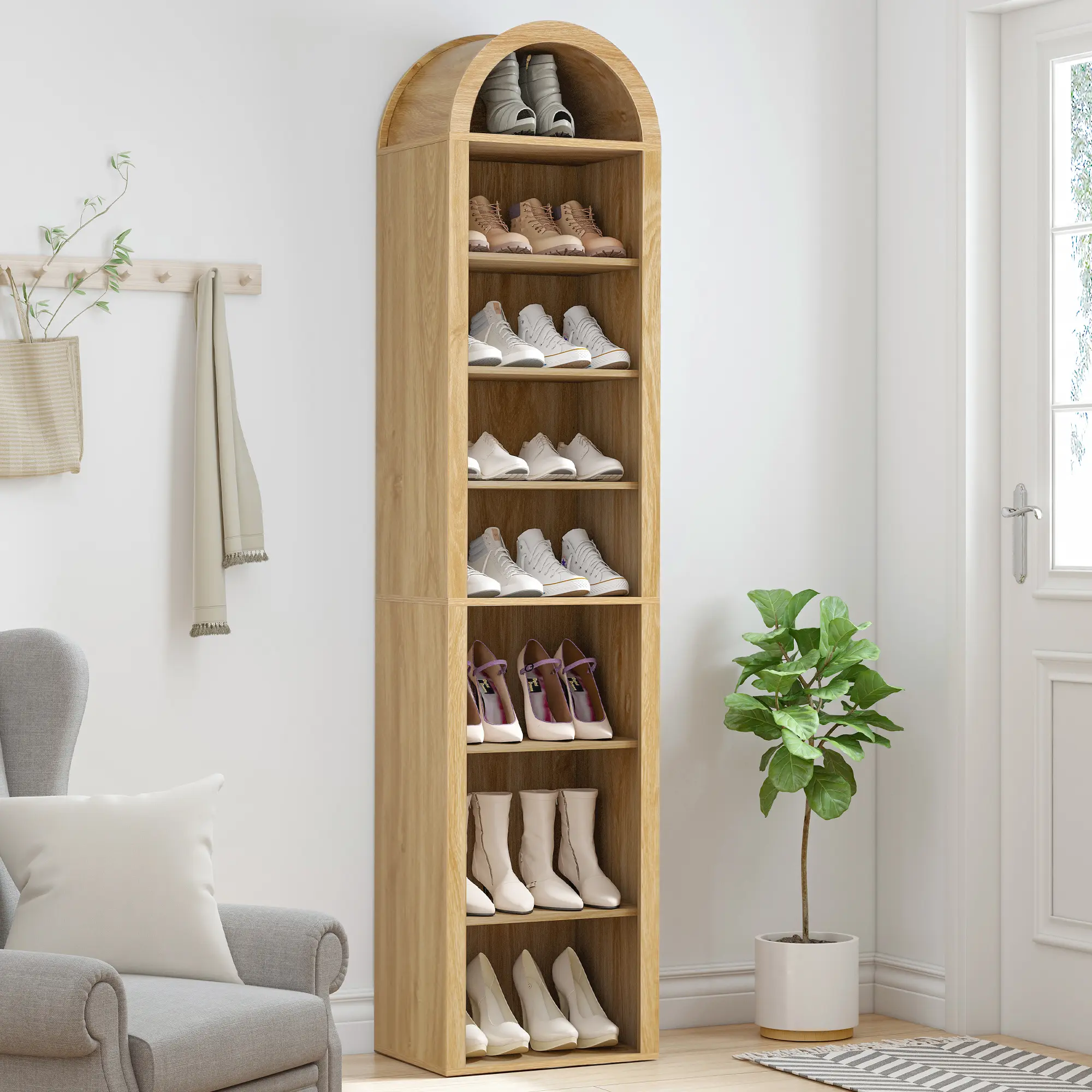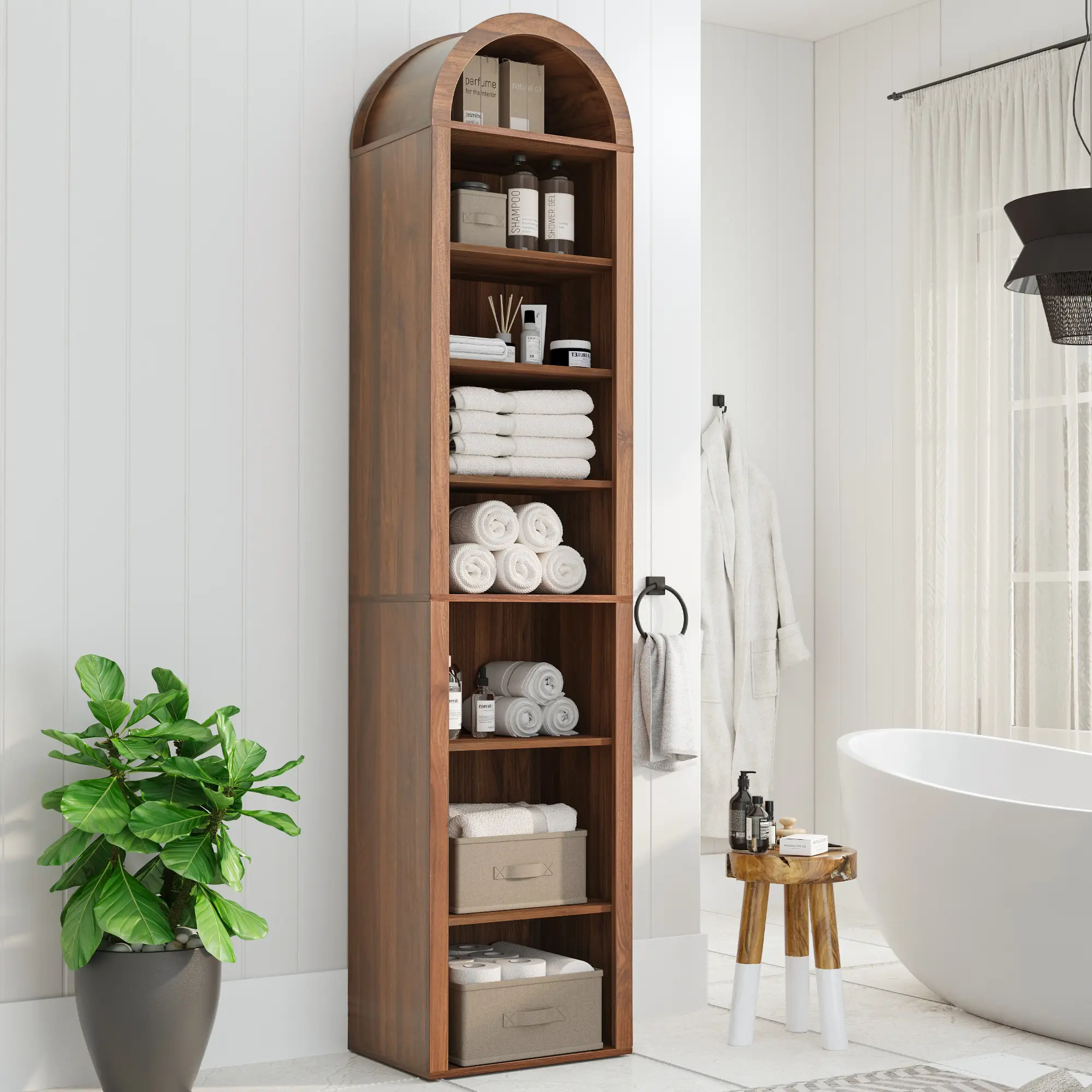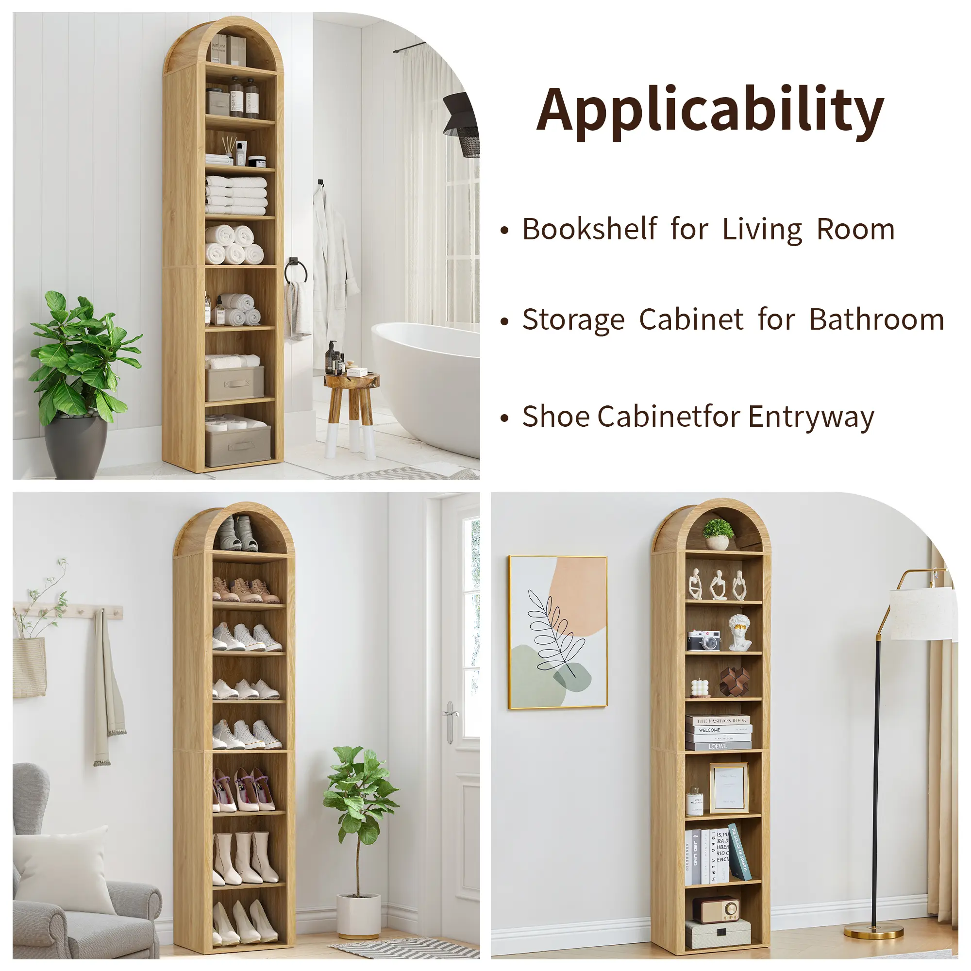 Transform your living room or office with this elegant 70" Tall Arched Wooden Bookshelf. Featuring a modern farmhouse design, this 8-tier bookcase offers ample storage and display space for your books, décor, and other essentials. The unique arched top adds a stylish touch, while the adjustable shelves make it easy to customize the shelf height for different items. Whether you're organizing books, showcasing plants, or displaying cherished décor, this bookshelf is a versatile and attractive solution for any room.