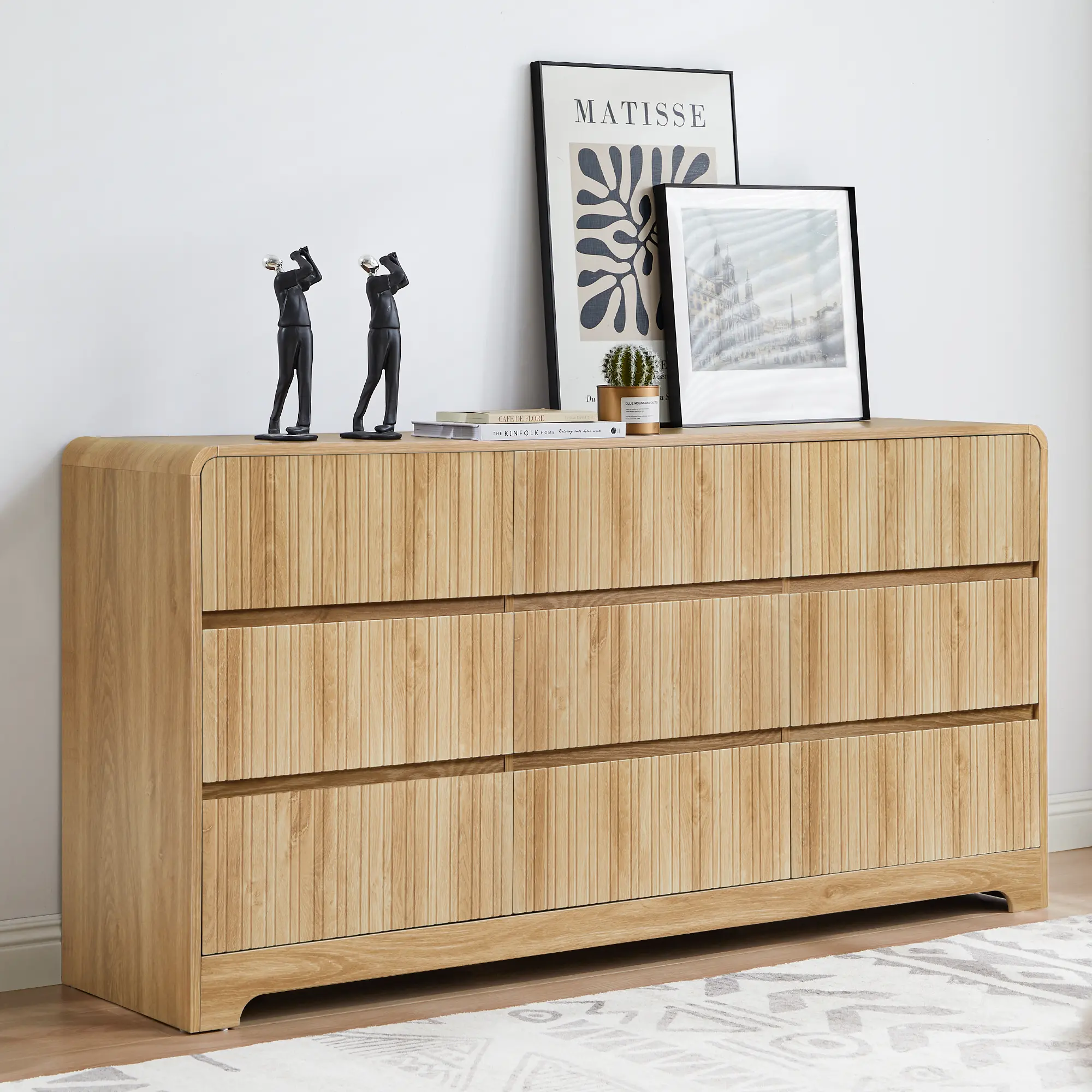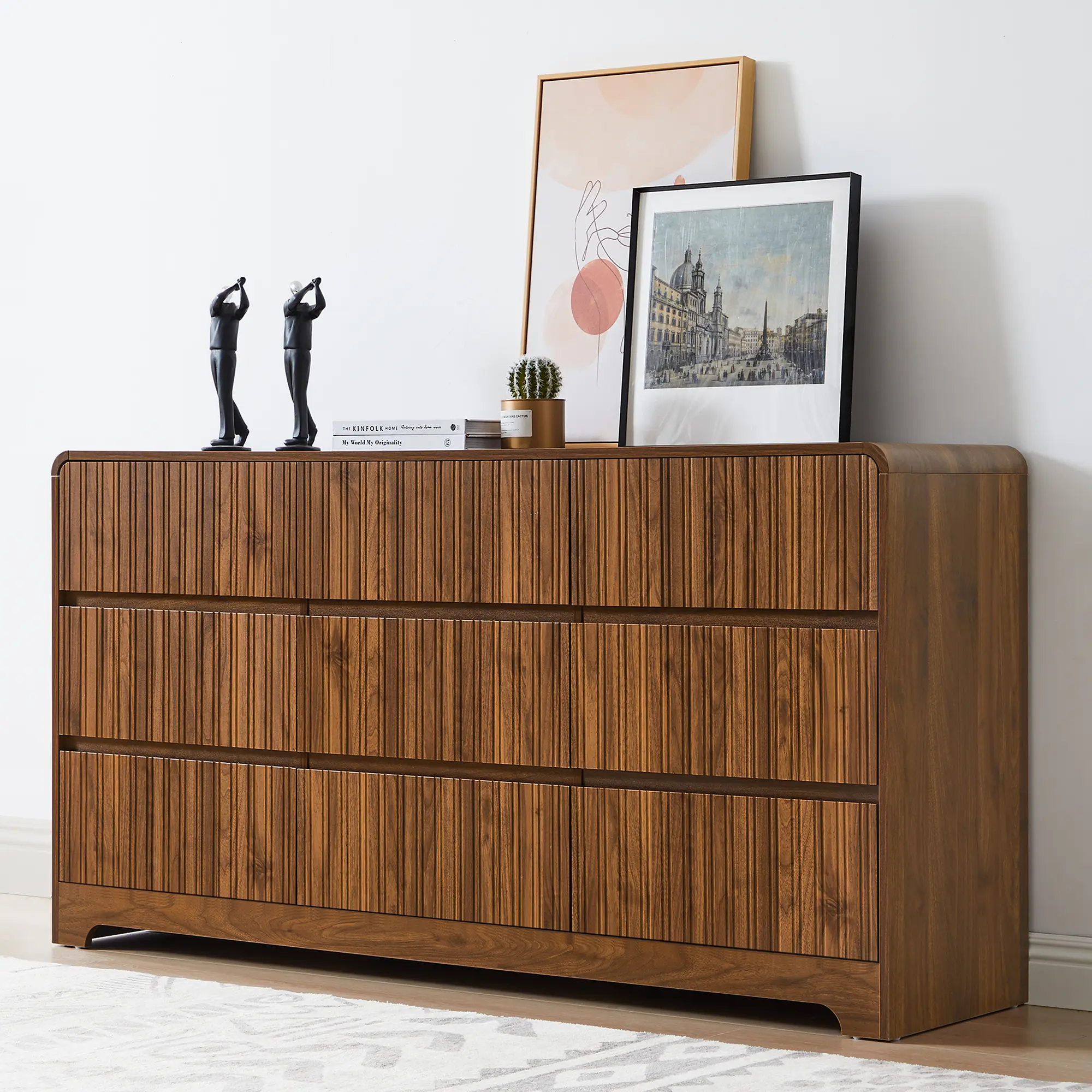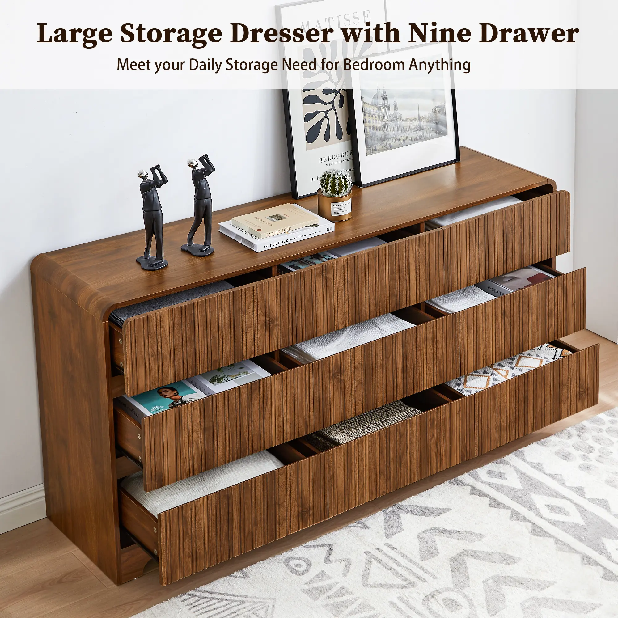 Sleek Modern Design: Elevate your home with this stylish 9-drawer dresser, a perfect blend of contemporary sophistication and practical storage. Featuring a seamless, handle-free design with rounded edges for added safety, this dresser offers a smooth, clutter-free aesthetic. The fluted detailing and rich wood-grain finish give it a touch of modern elegance, making it a versatile addition to your bedroom, living room, or home office.