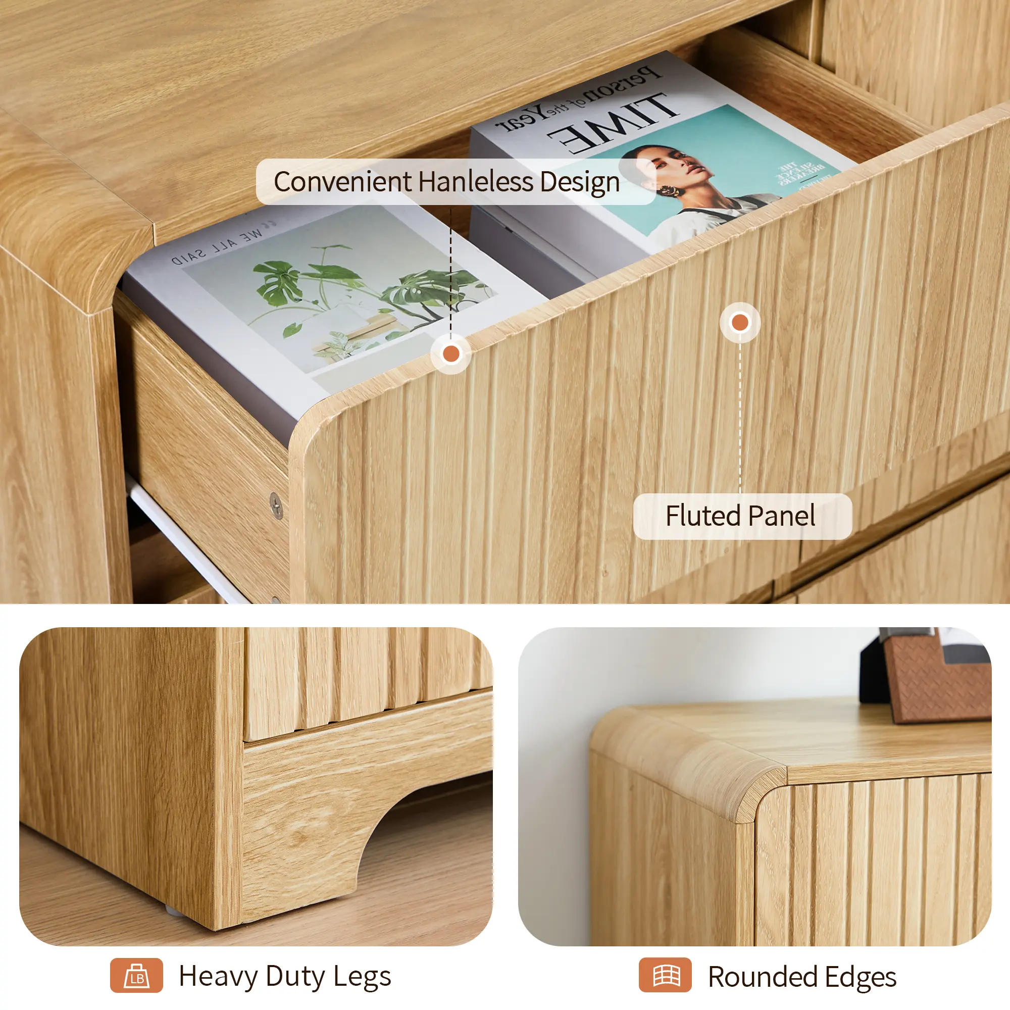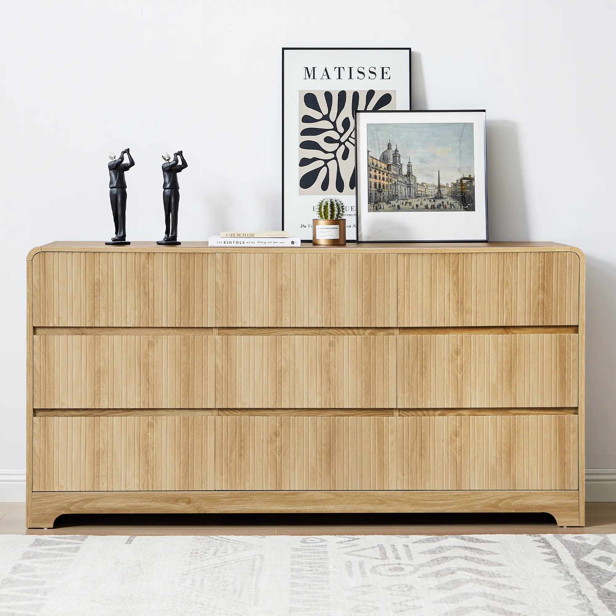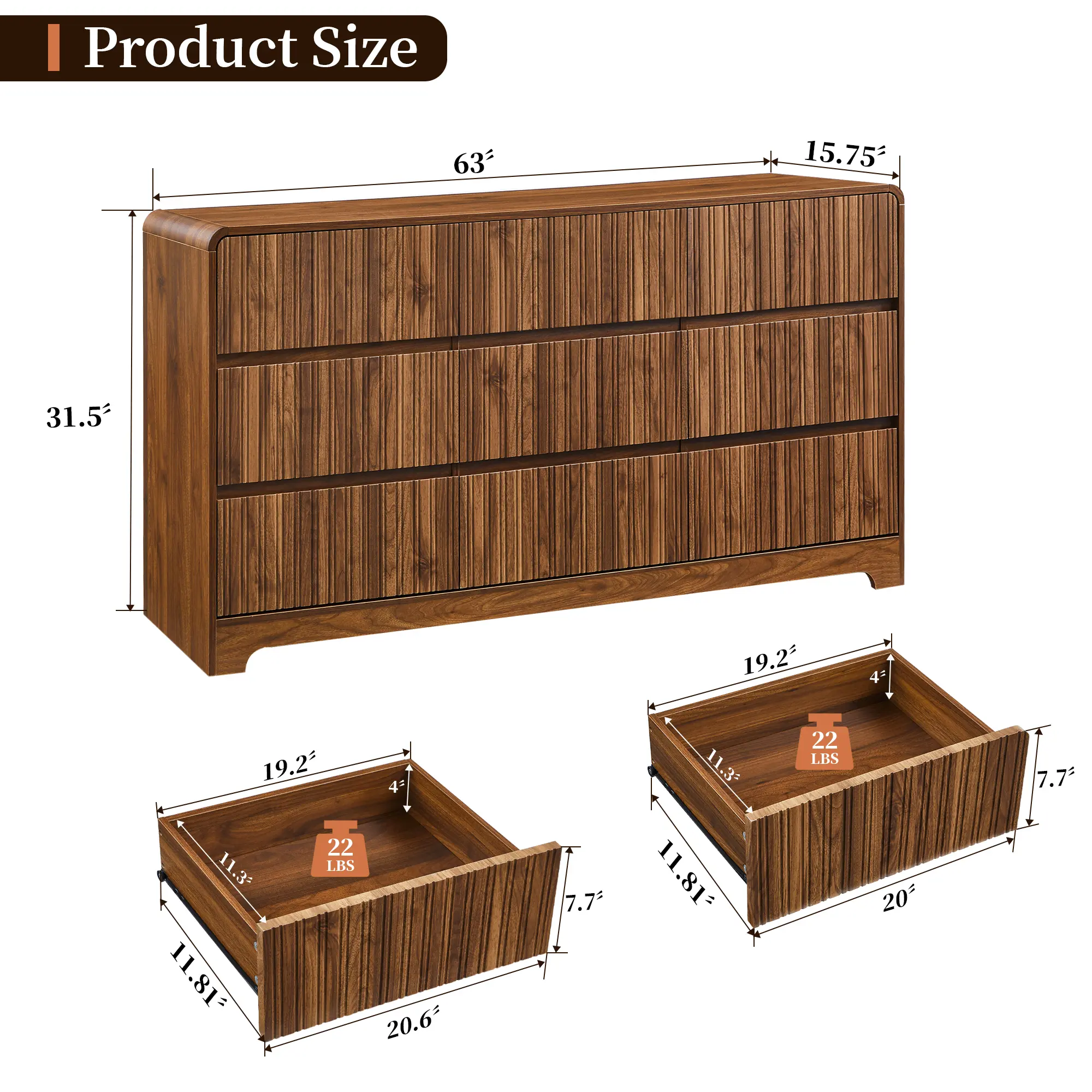 Sleek Modern Design: Elevate your home with this stylish 9-drawer dresser, a perfect blend of contemporary sophistication and practical storage. Featuring a seamless, handle-free design with rounded edges for added safety, this dresser offers a smooth, clutter-free aesthetic. The fluted detailing and rich wood-grain finish give it a touch of modern elegance, making it a versatile addition to your bedroom, living room, or home office.