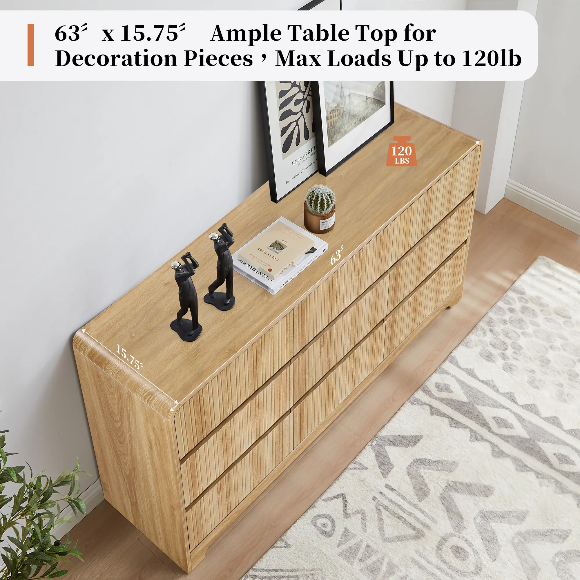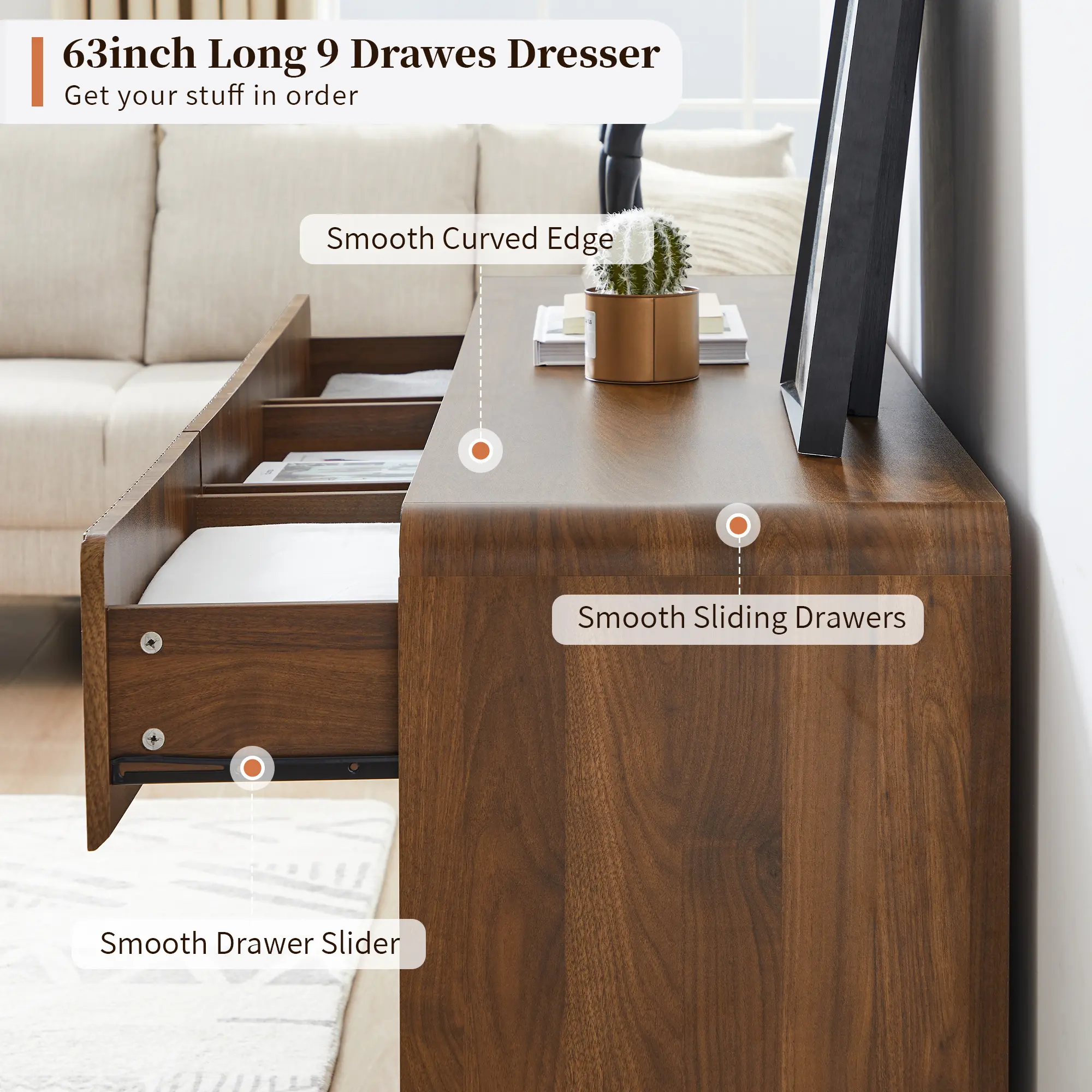Spacious & Organized Storage: This expansive dresser offers nine roomy drawers, providing ample space to organize clothing, linens, accessories, and electronics. Its 63" width is perfect for larger spaces, offering both style and functionality without taking up too much floor space. Keep your room tidy and clutter-free with plenty of storage while making a bold statement in your interior décor.
