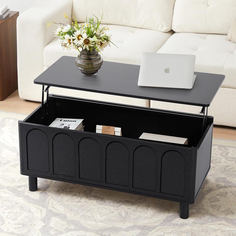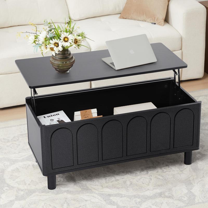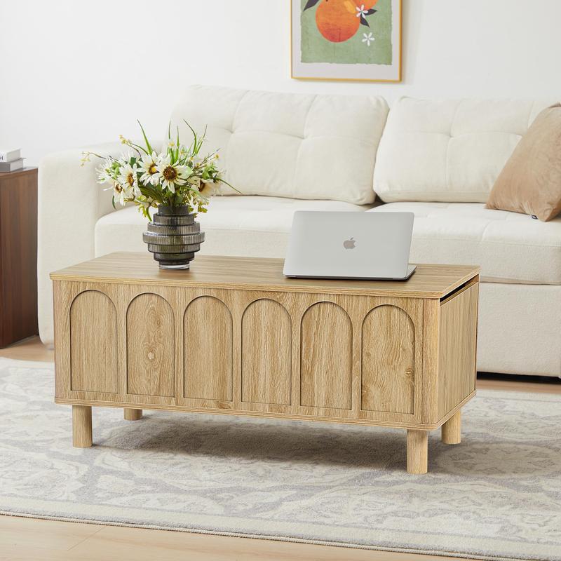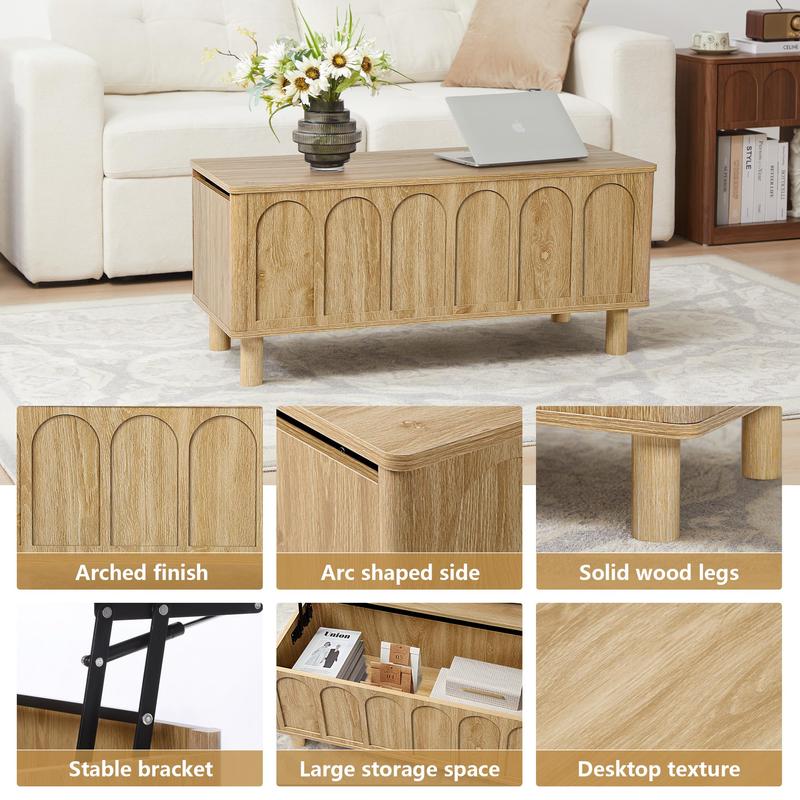 ·【 Product Advantage 】 The size is 17.72"D × 39.37"W × 17.72"H. The wooden coffee table features an arched finish and side curved design, suitable for children and families, perfectly balancing modern aesthetics and functional design. Equipped with a raised desktop and hidden storage space. Specially designed to adapt to modern lifestyles, simply lift and lower the tabletop to easily transform from a coffee table to a work or dining space