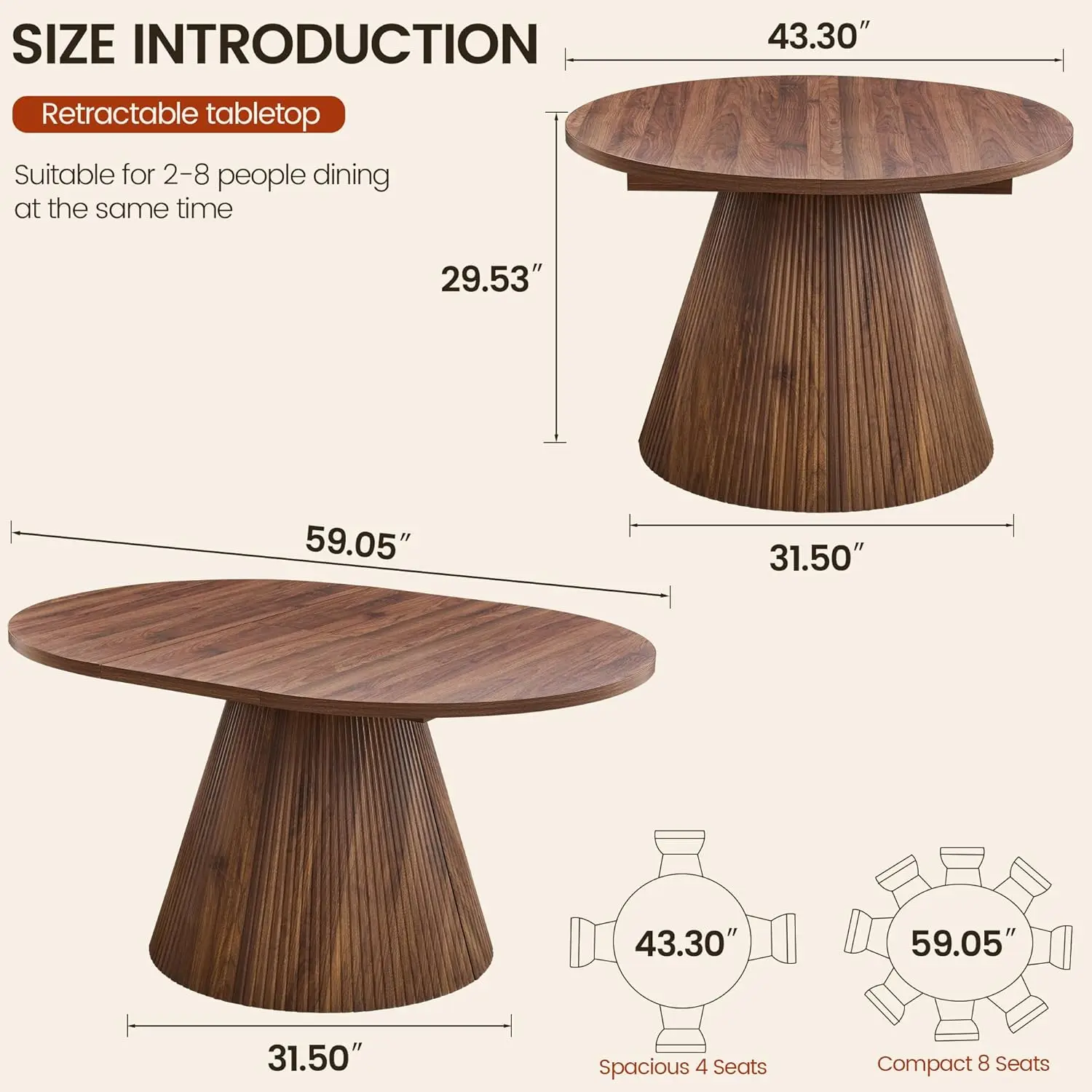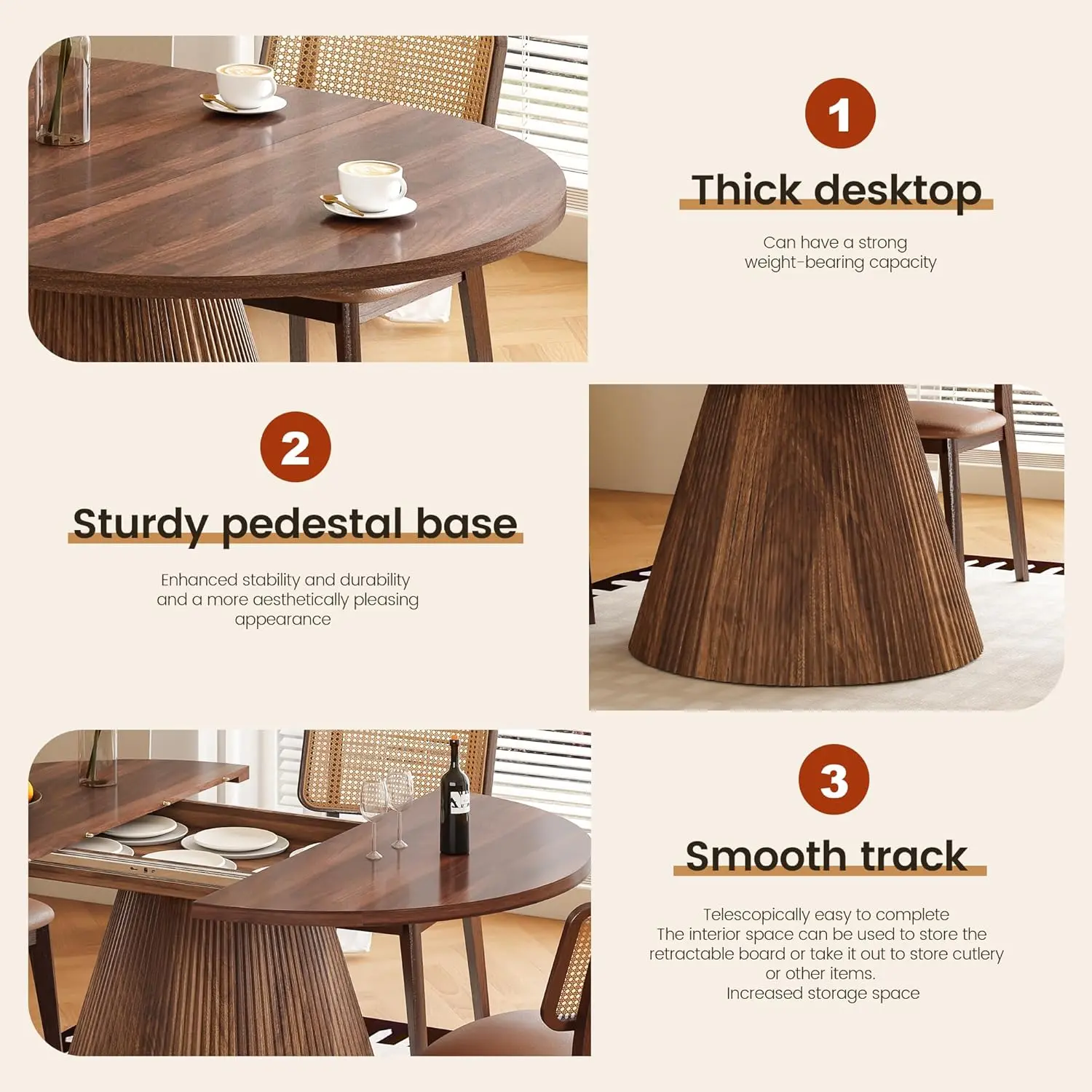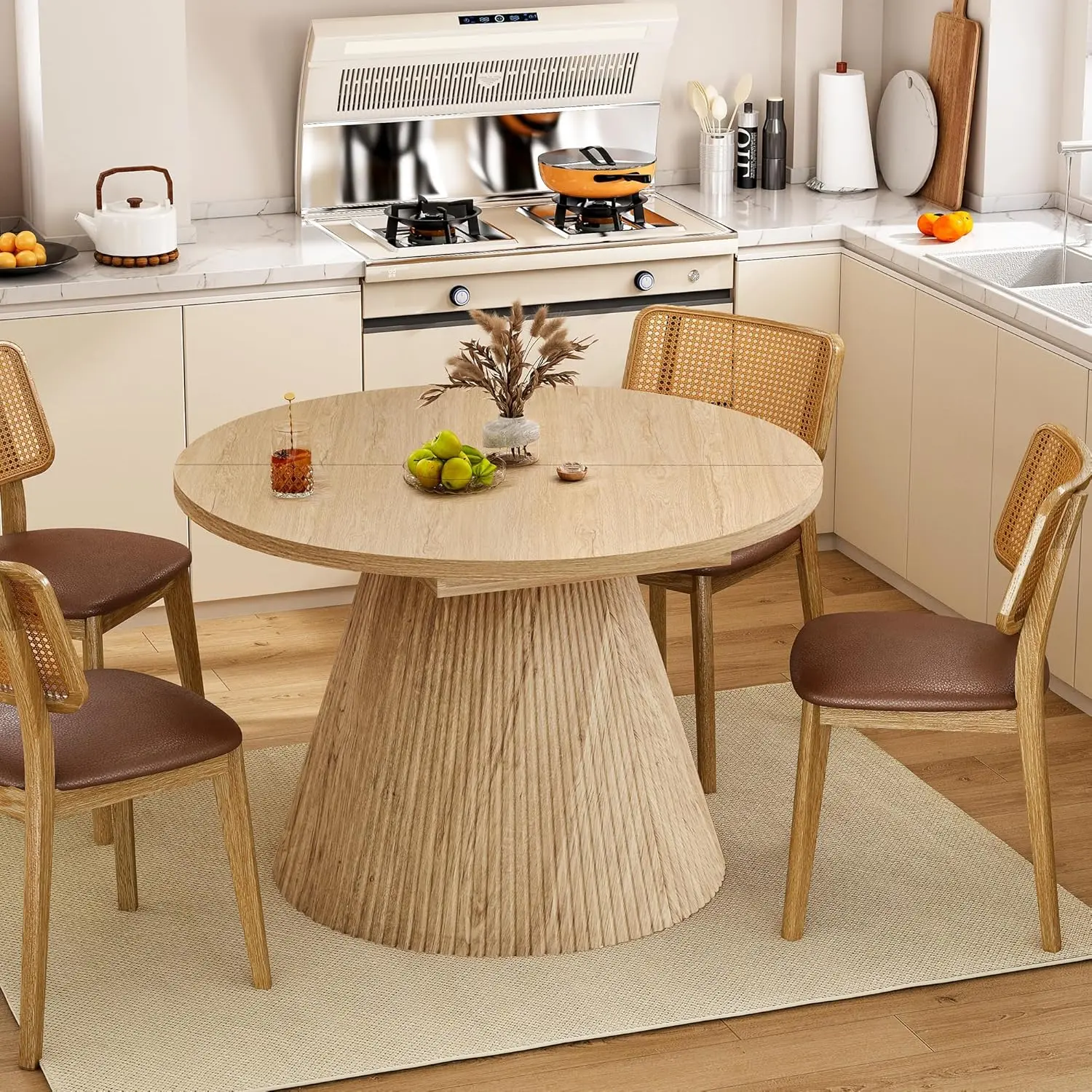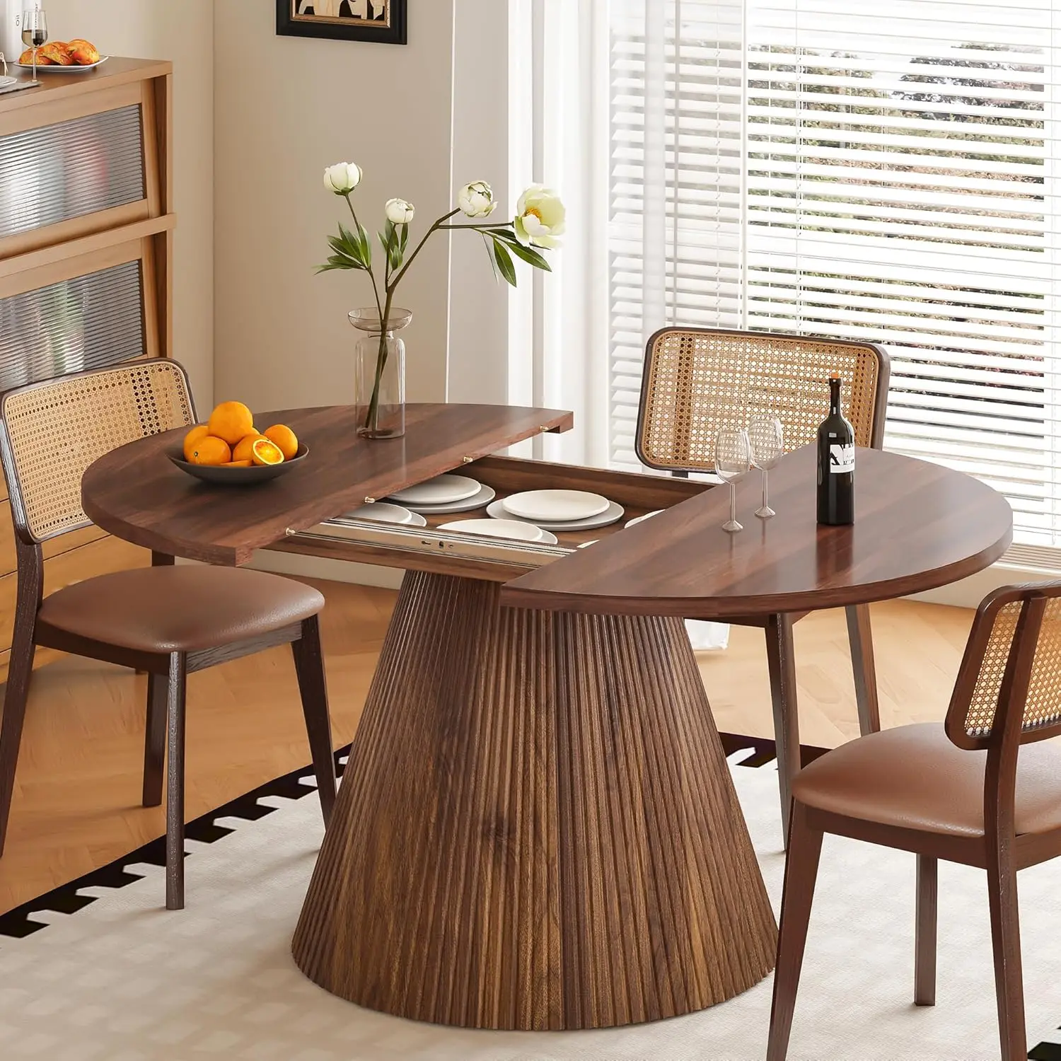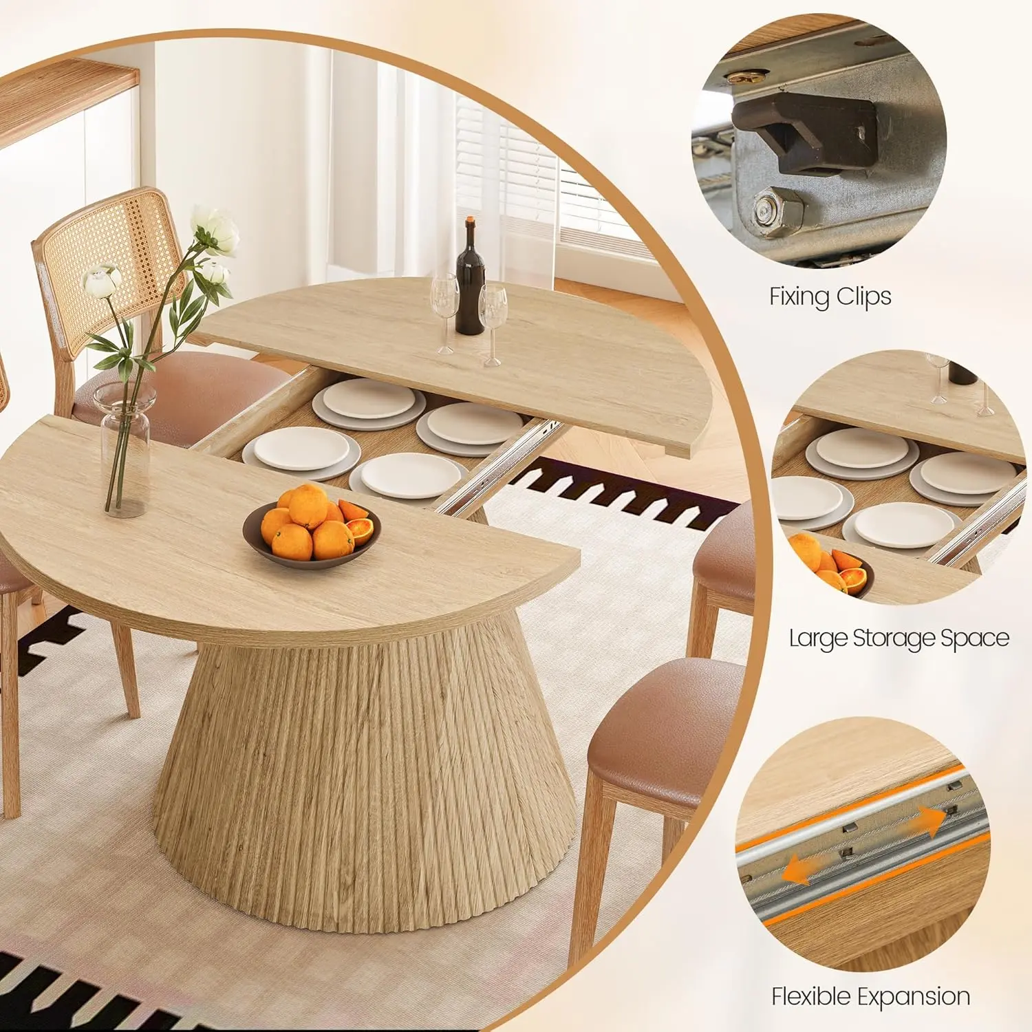 Featuring a refined mid-century fluted pedestal base, this extendable table blends seamlessly into modern, minimalist, or Scandinavian-style interiors. Perfect for daily meals and weekend gatherings, it also doubles as a work desk, craft table, study station, or small meeting table when expanded. The rounded shape keeps conversations close and creates a cozy, welcoming dining experience.