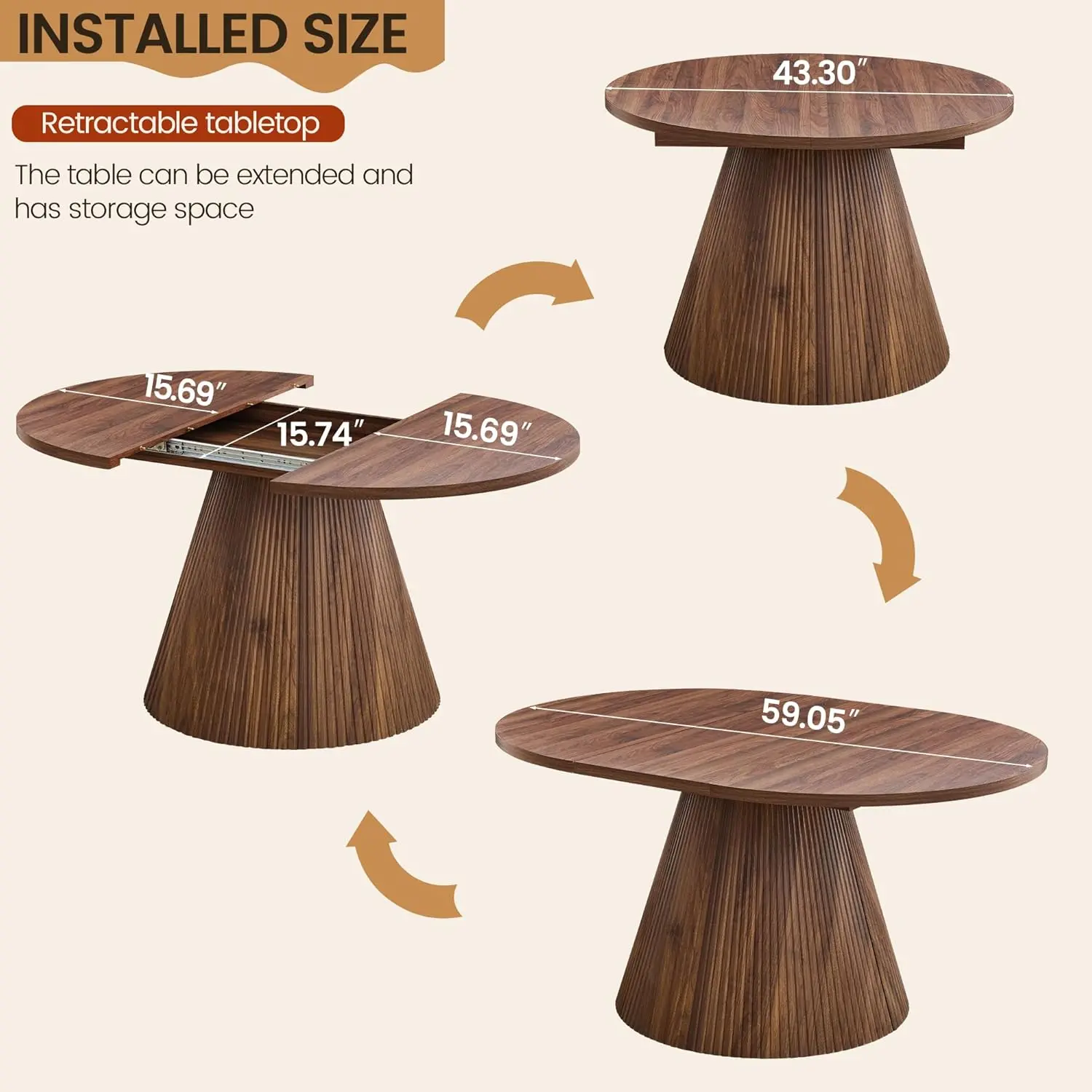 This round dining table transitions effortlessly from a 43.3" compact circle to a spacious 59" × 43.3" oval, giving you instant extra seating whenever needed. The upgraded glide-track system ensures a smooth, quiet extension, while the removable leaves tuck neatly beneath the tabletop—providing a clean, space-saving storage solution without clutter.