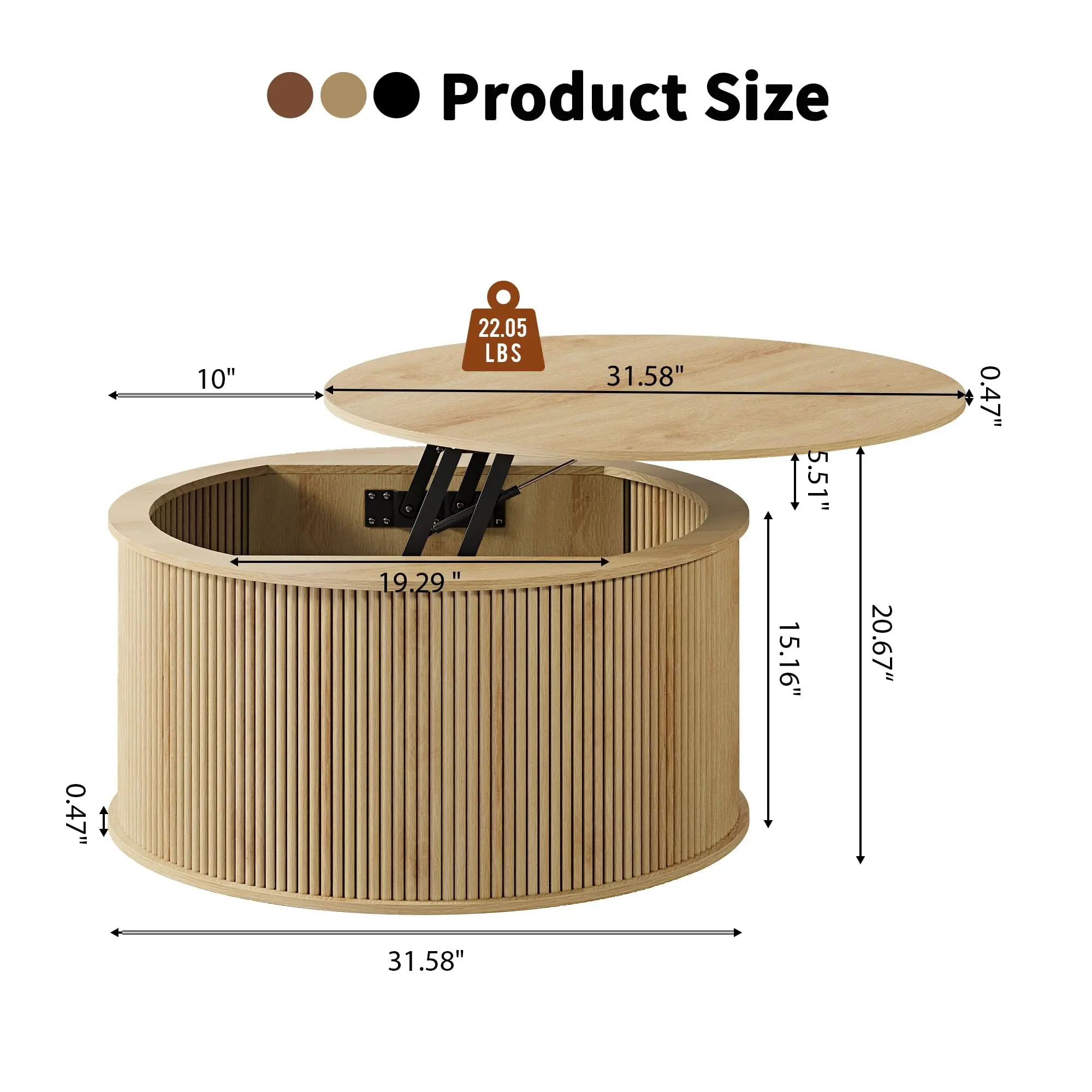 ·【Easy to Assemble】 Product Dimensions (31.58 "D x 31.58 "W x 15.16 "H). Designed for hassle-free setup, this lift-top coffee table arrives with pre-drilled holes, clear instructions, and all necessary tools. Make sure that you have received all the parts before installation. Any questions please feel free to contact us.